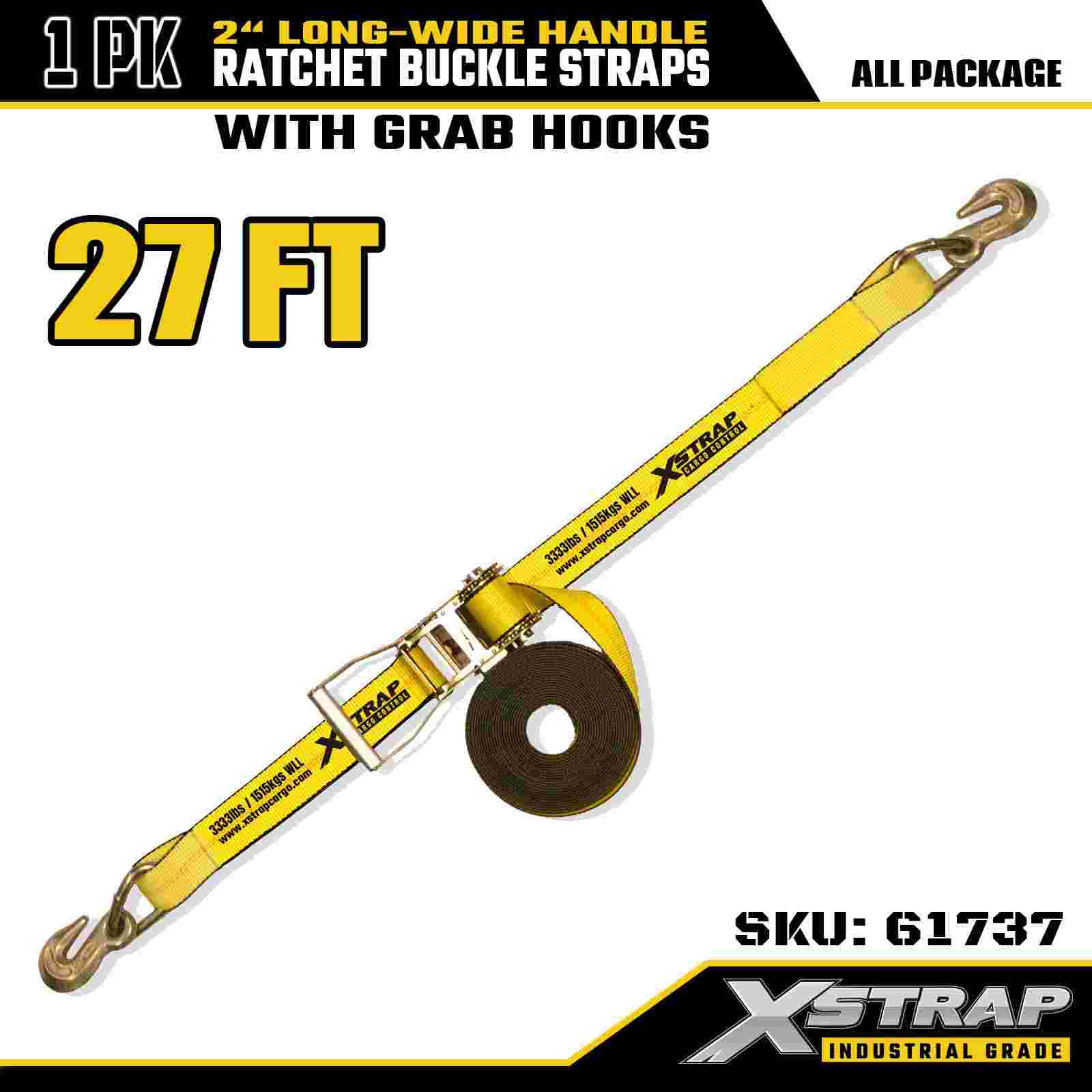 Xstrap 61737 Heavy Duty 2" x 27' 1PK สายรัดวงล้อพร้อมตะขอเกี่ยว สีเหลือง, WLL 3,333 lbs, Long Wide มือจับ Ratchet Tie Down Strap สำหรับเครื่องจักรและอุปกรณ์