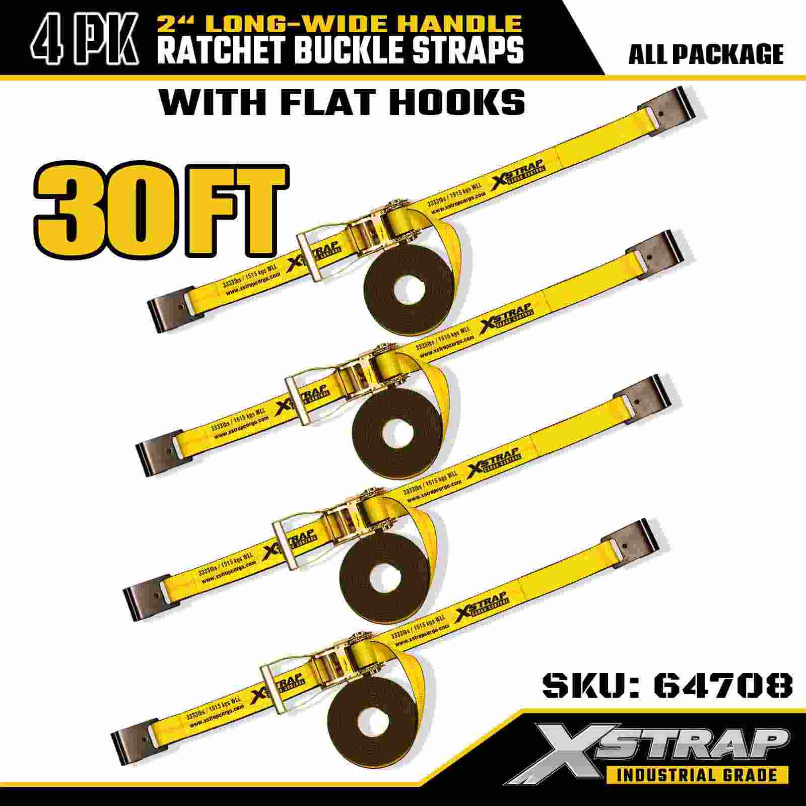 Xstrap 64708 2" x 30ft Extended มือจับ Ratchet Buckle Straps (แพ็ค 4 ชิ้น) – ตะขอแบน, 10,000 lbs Rated Strength, โซลูชันการควบคุมสินค้าทางอุตสาหกรรม