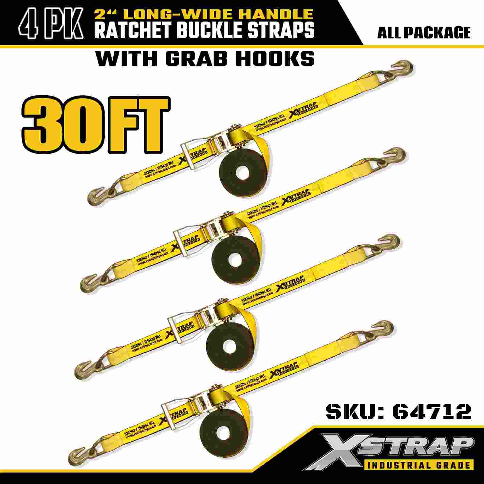Xstrap 64712 สายรัดหัวเข็มขัดวงล้อแบบด้ามจับกว้างยาว 2 นิ้ว x 30 ฟุต (แพ็ค 4 ชิ้น) – ตะขอเกี่ยว ความจุ 10,000 ปอนด์ อุปกรณ์ผูกสำหรับงานหนักสำหรับการขนส่งอุปกรณ์ขนาดใหญ่
