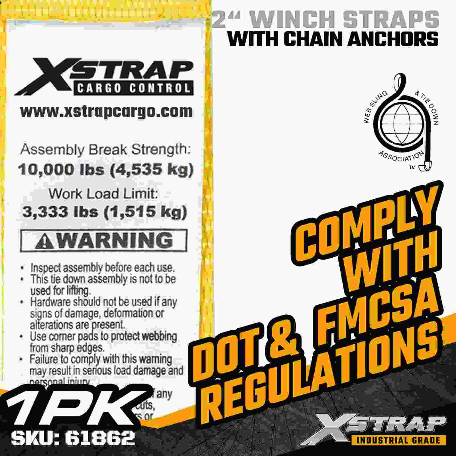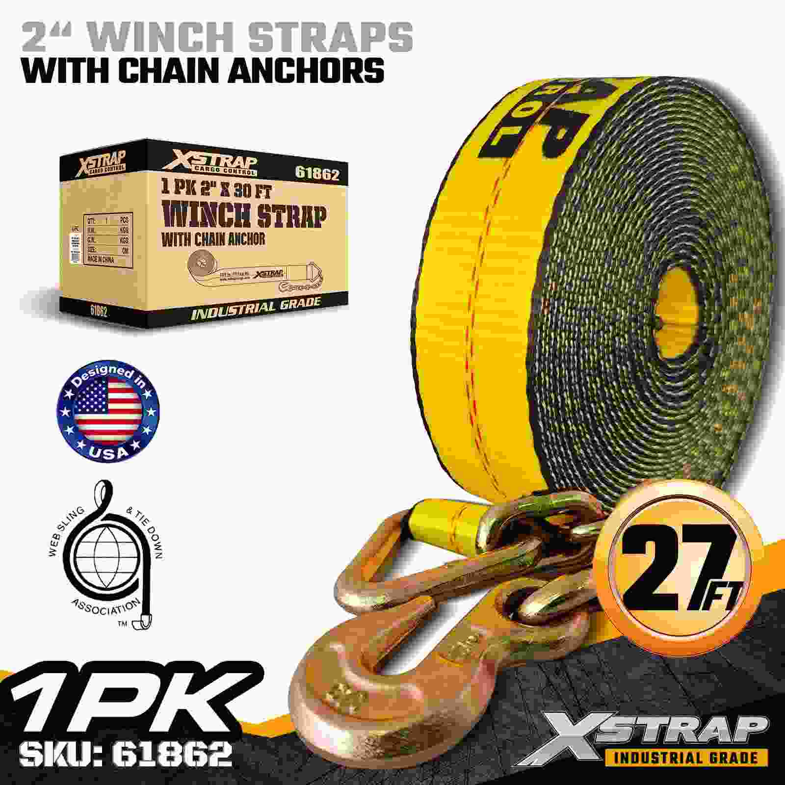 สายรัดกว้านมาตรฐาน Xstrap 61862 ขนาด 2 นิ้ว × 30 ฟุตสร้างขึ้นเพื่อความมั่นคงปลอดภัยของสินค้าแบบพื้นเรียบ โดยมีพุกโซ่ที่ทนทานและสายรัดโพลีเอสเตอร์ความแข็งแรงสูง ด้วยขีดจำกัดการรับน้ำหนักการทำงาน 3,333 ปอนด์ และความต้านทานการแตกหัก 10,000 ปอนด์ จึงให้ประสิทธิภาพที่เชื่อถือได้สำหรับการลากสินค้ารายวัน การบรรทุกพาเลท ไม้แปรรูป ท่อ และการใช้งานด้านลอจิสติกส์ทั่วไป