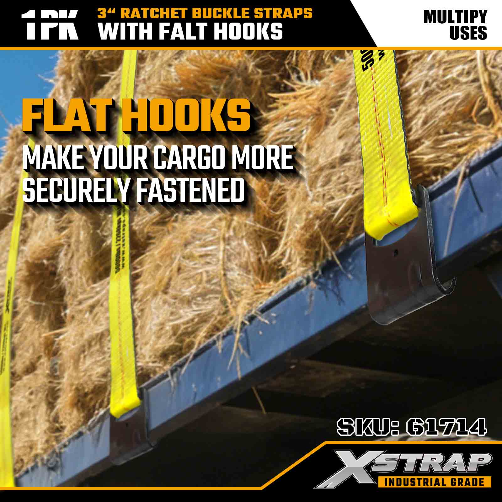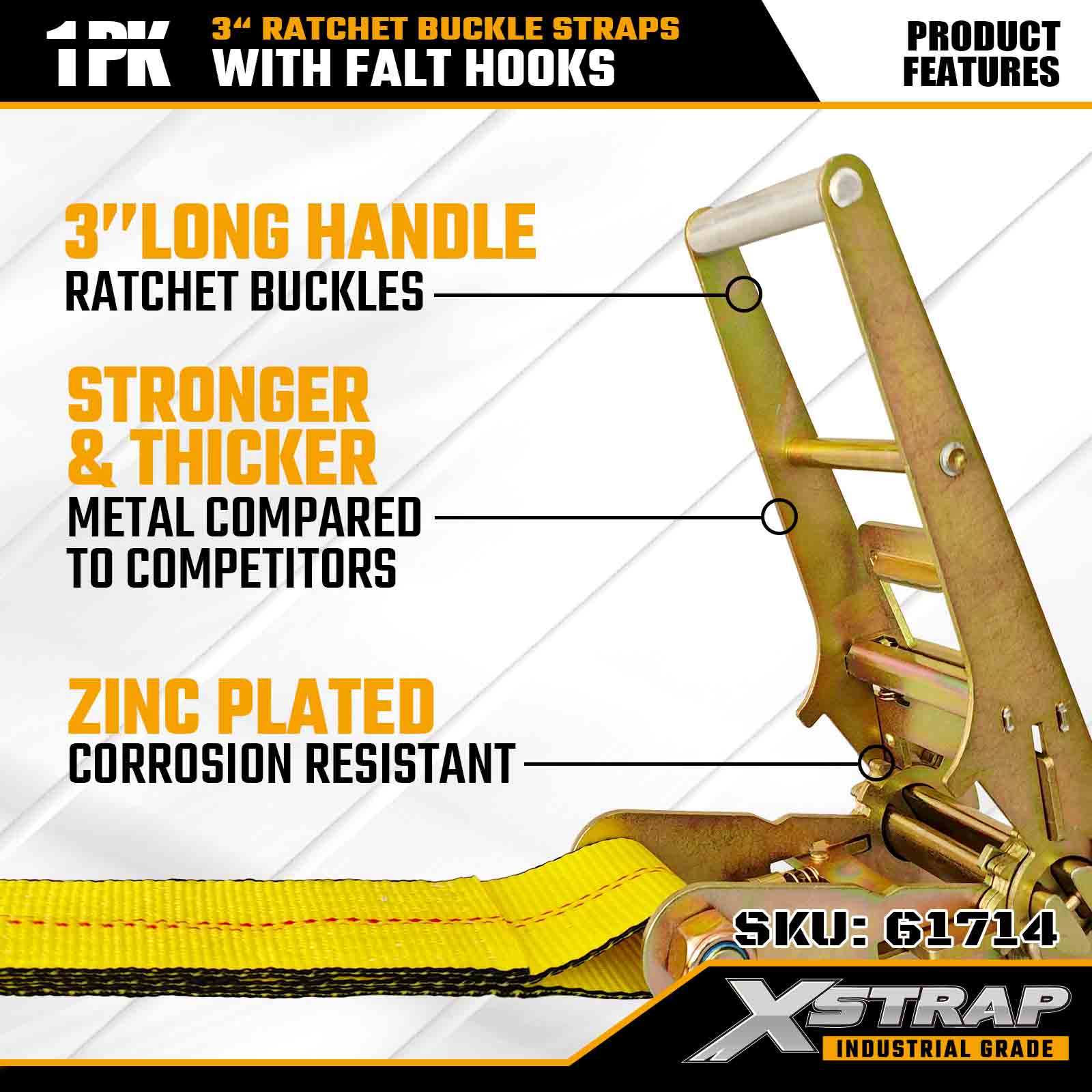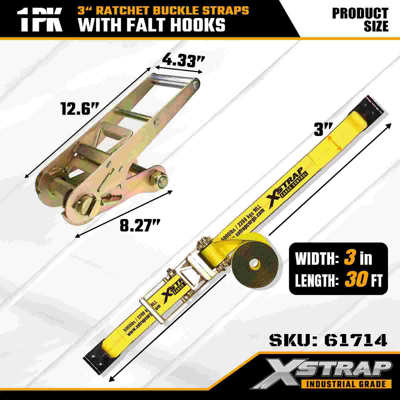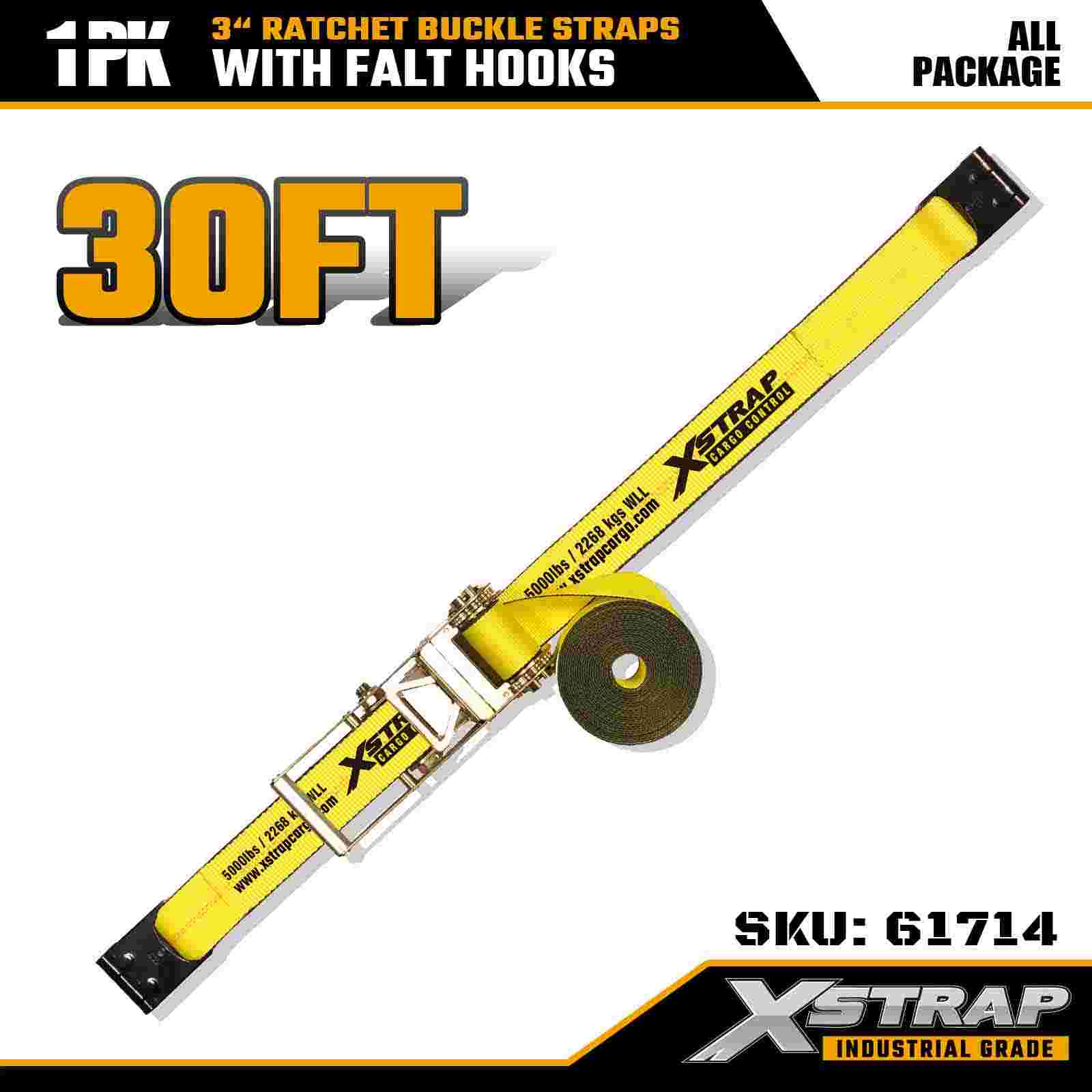 Xstrap 61714 สายรัดหัวเข็มขัดแบบวงล้อขนาด 3 นิ้ว x 30 ฟุต (แพ็ค 1 ชิ้น) – ตะขอแบบแบน รับน้ำหนักได้ 5,000 ปอนด์ ความต้านทานการแตกหัก 15,000 ปอนด์ การผูกแบบงานหนักสำหรับรถบรรทุก รถพ่วง และการขนส่งสินค้าทางอุตสาหกรรม