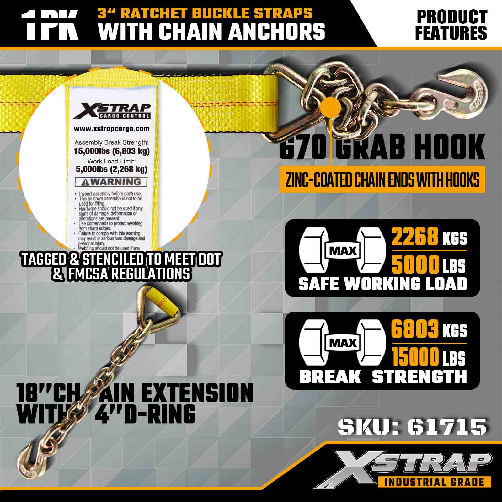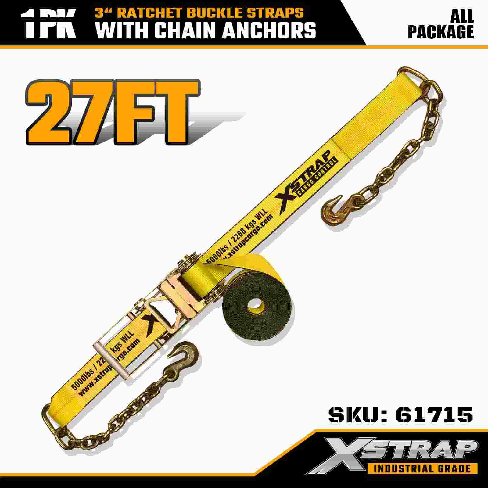 Xstrap 61715 สายรัดหัวเข็มขัดแบบวงล้อขนาด 3 นิ้ว x 27 ฟุต (1 แพ็ค) – จุดยึดโซ่ รับน้ำหนักได้ 5,000 ปอนด์ ความต้านทานการแตกหัก 15,000 ปอนด์ สายรัดเหล่านี้ออกแบบมาเพื่อการควบคุมสินค้าที่ใช้งานหนัก สายรัดเหล่านี้ผสมผสานสายรัดระดับอุตสาหกรรมเข้ากับปลายพุกโซ่เพื่อความปลอดภัยสูงสุดในรถบรรทุก รถพ่วง และการขนส่งในงานก่อสร้าง