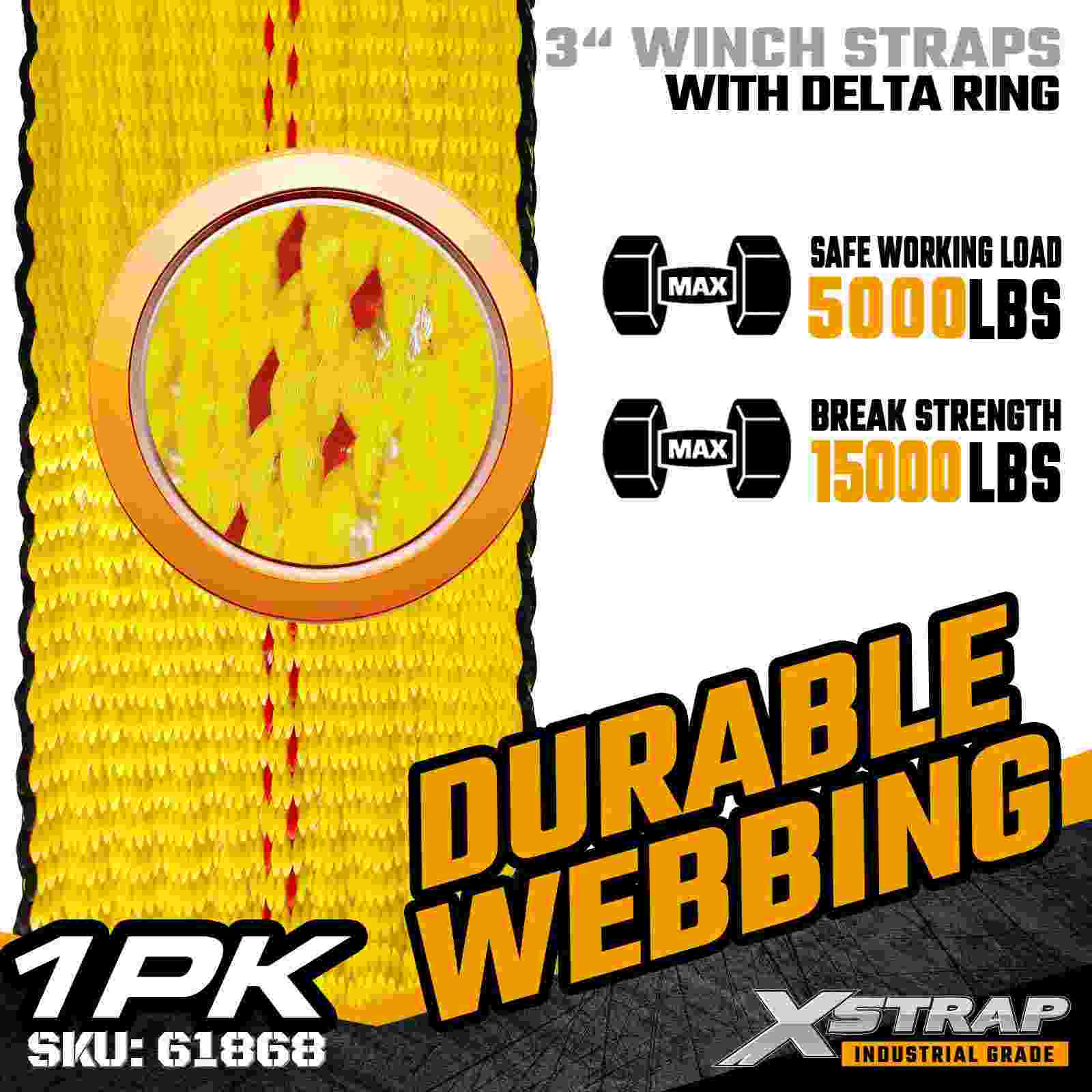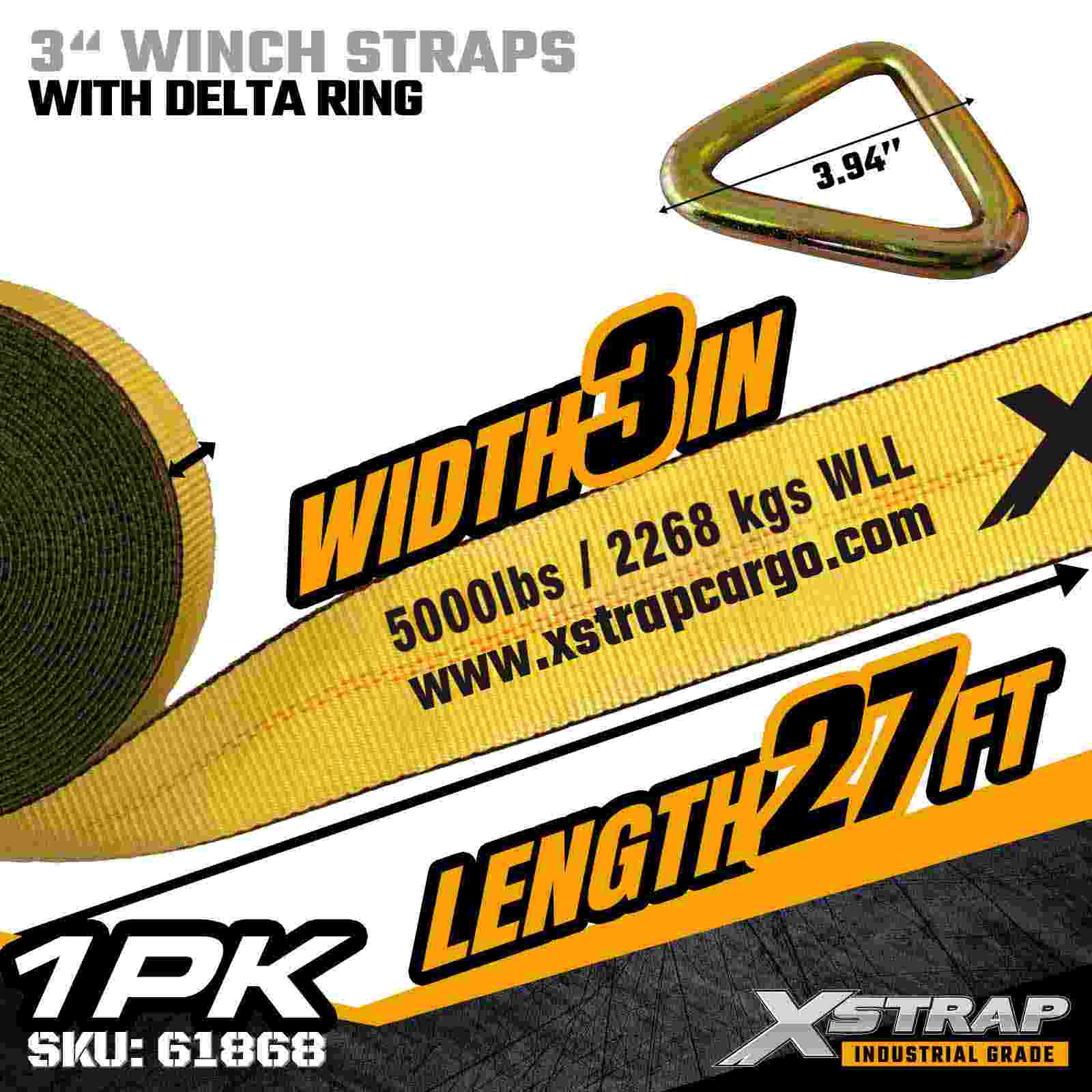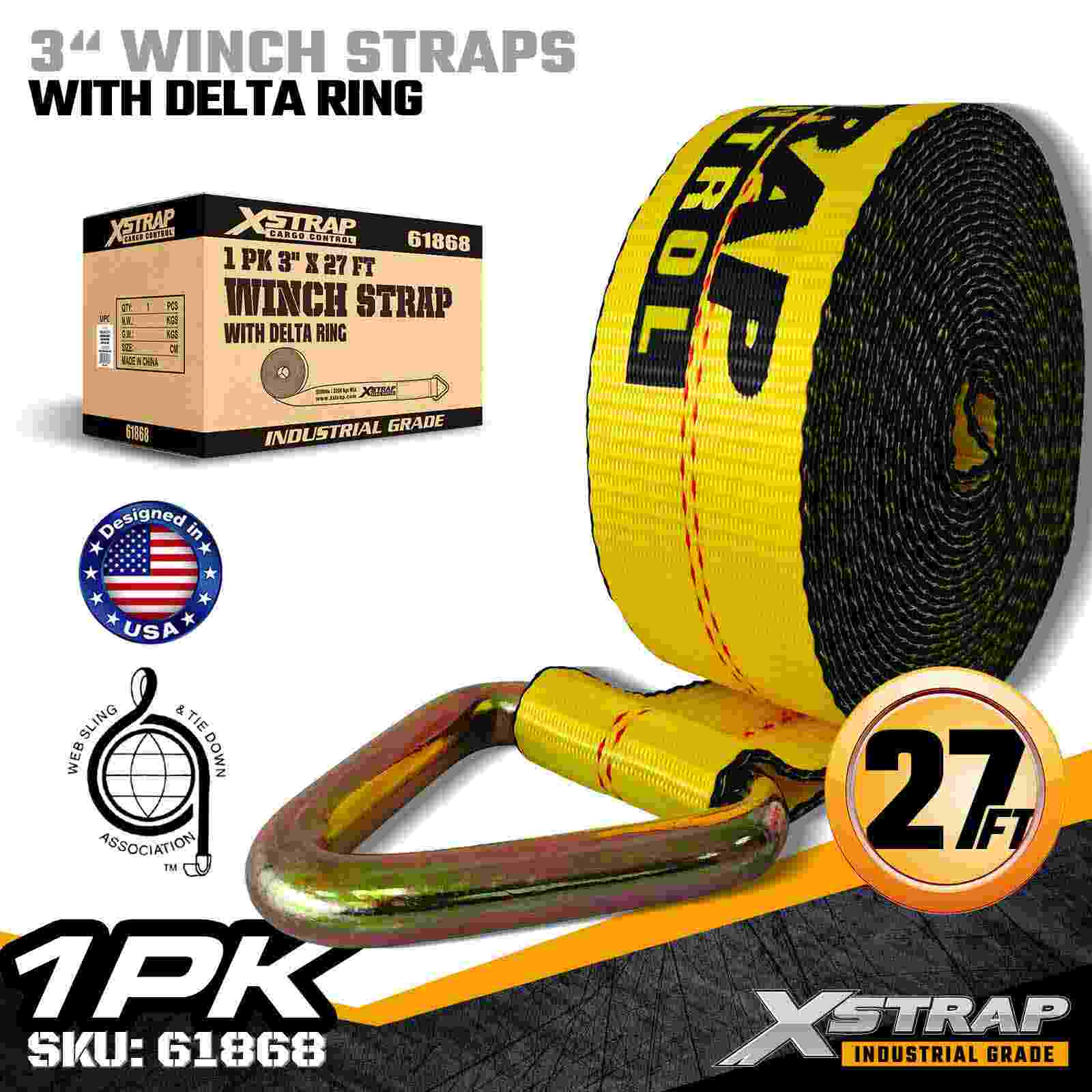 สายรัดกว้านมาตรฐาน Xstrap 61868 ขนาด 3 นิ้ว × 27 ฟุตเป็นโซลูชันการรักษาความปลอดภัยของสินค้าสำหรับงานหนักที่ออกแบบมาสำหรับรถพ่วงพื้นเรียบและการขนส่งที่มีความจุสูง สายรัดเดลต้าริงเสริมแรงและสายรัดโพลีเอสเตอร์ขนาดกว้าง 3 นิ้วเป็นพิเศษ สายรัดกว้านขนาด 3 นิ้วนี้ให้ขีดจำกัดน้ำหนักการทำงาน 5,000 ปอนด์ และความต้านทานการแตกหัก 15,000 ปอนด์ เหมาะอย่างยิ่งสำหรับการรักษาความปลอดภัยของขนาดใหญ่ เช่น ไม้แปรรูป การขนส่งเหล็ก เครื่องจักร และอุตสาหกรรมระหว่างการดำเนินการลากจูงที่มีความต้องการสูง