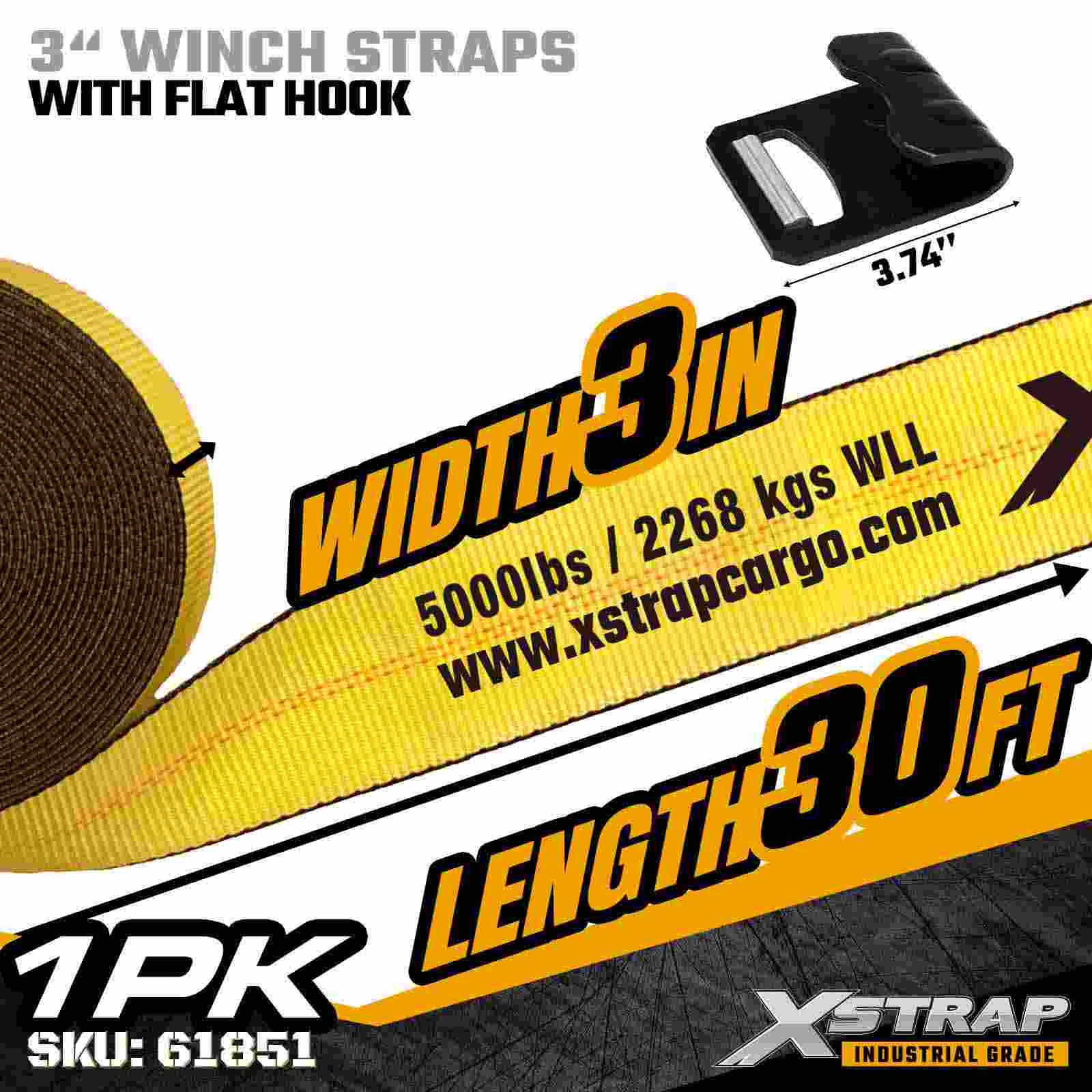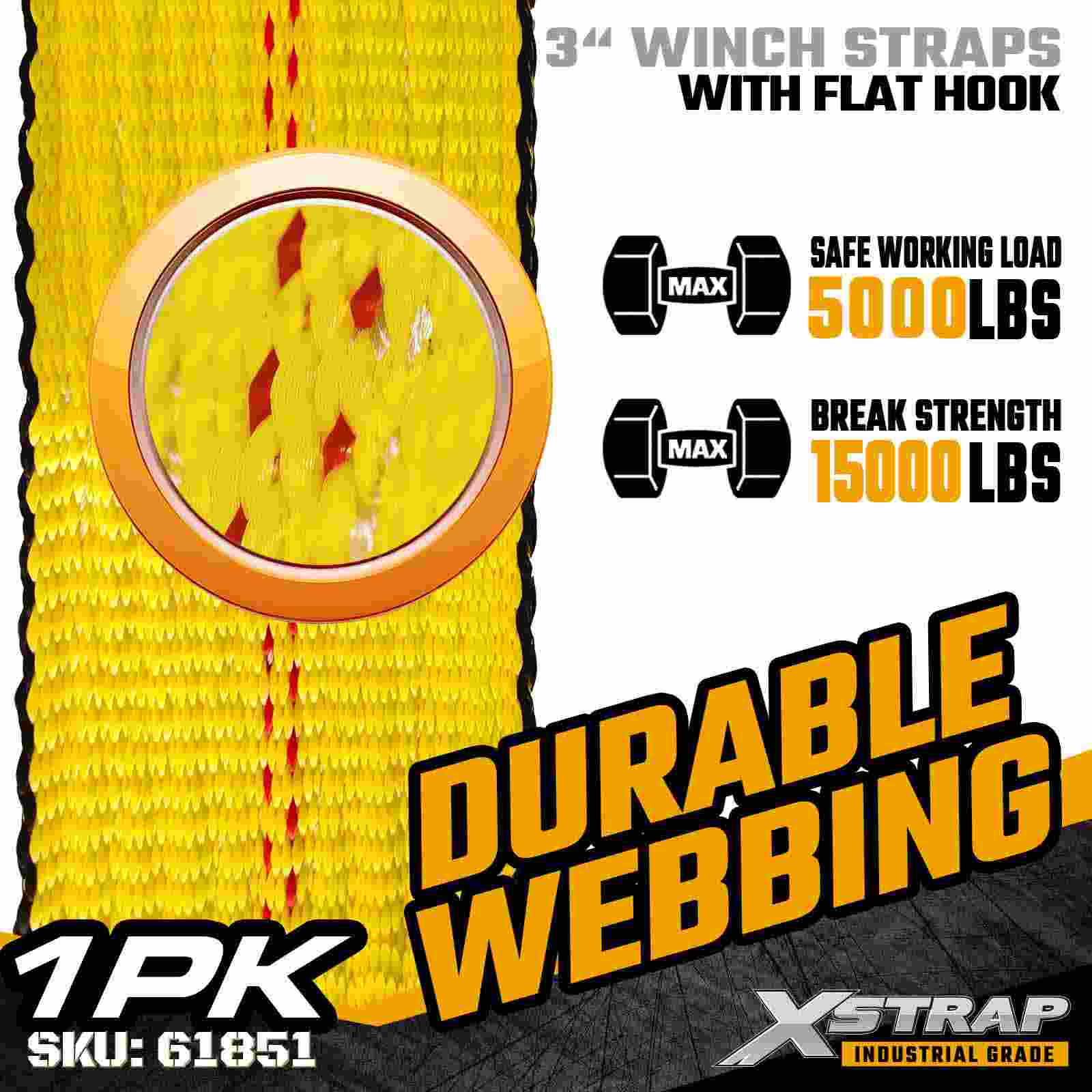 สายรัดกว้านมาตรฐาน Xstrap 61851 ขนาด 3 นิ้ว × 30 ฟุตเป็นสายรัดสำหรับบรรทุกสินค้าสำหรับงานหนักที่ออกแบบมาสำหรับรถพ่วงพื้นเรียบและการขนส่งที่มีความจุสูง สายรัดแบบแบนเสริมความแข็งแรงและสายรัดโพลีเอสเตอร์ขนาดกว้าง 3 นิ้ว สายรัดกว้านขนาด 3 นิ้วนี้ให้ขีดจำกัดการรับน้ำหนักการทำงาน 5,000 ปอนด์ และความต้านทานการแตกหัก 15,000 ปอนด์ เหมาะอย่างยิ่งสำหรับการยึดไม้ เหล็ก เครื่องจักร และอุตสาหกรรม การขนส่งสินค้าระหว่างการดำเนินการลากจูงที่มีความต้องการสูง