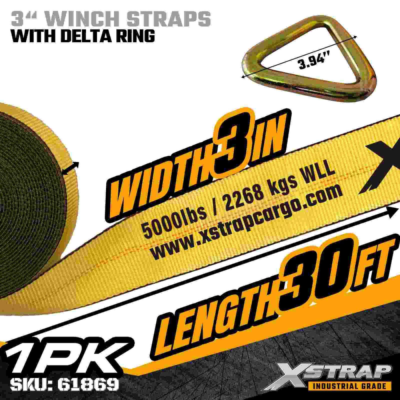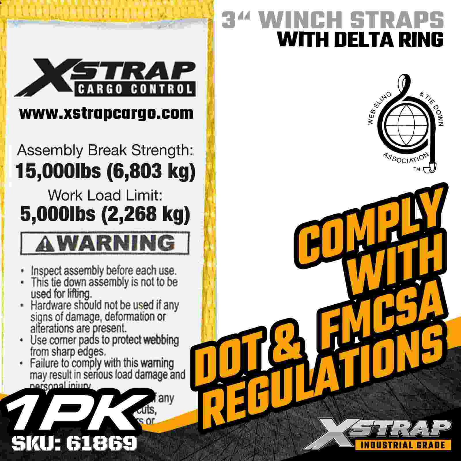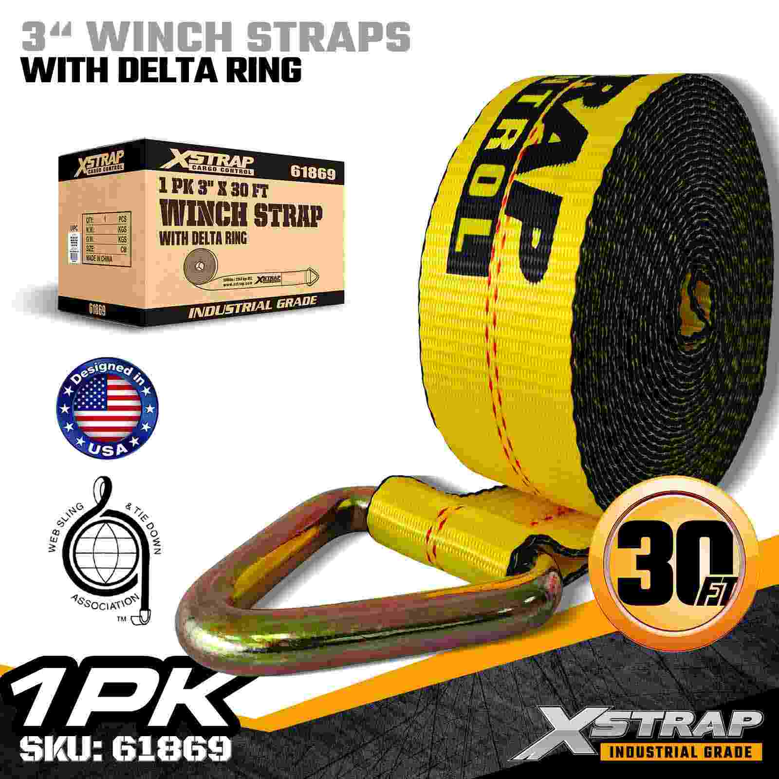 สายรัดกว้านมาตรฐาน Xstrap 61869 ขนาด 3 นิ้ว × 30 ฟุตเป็นสายรัดยึดสินค้าสำหรับงานหนักที่ออกแบบมาสำหรับรถพ่วงพื้นเรียบและการขนส่งที่มีความจุสูง สายรัดเดลต้าริงเสริมแรงและสายรัดโพลีเอสเตอร์กว้าง 3 นิ้วเป็นพิเศษ สายรัดกว้านขนาด 3 นิ้วนี้ให้ขีดจำกัดการรับน้ำหนักการทำงาน 5,000 ปอนด์ และความต้านทานการแตกหัก 15,000 ปอนด์ เหมาะอย่างยิ่งสำหรับการยึดสิ่งของขนาดใหญ่ เช่น ไม้แปรรูป การขนส่งเหล็ก เครื่องจักร และอุตสาหกรรมระหว่างการดำเนินการลากจูงที่มีความต้องการสูง