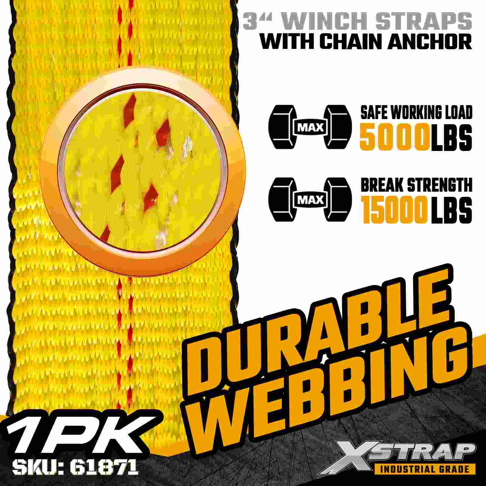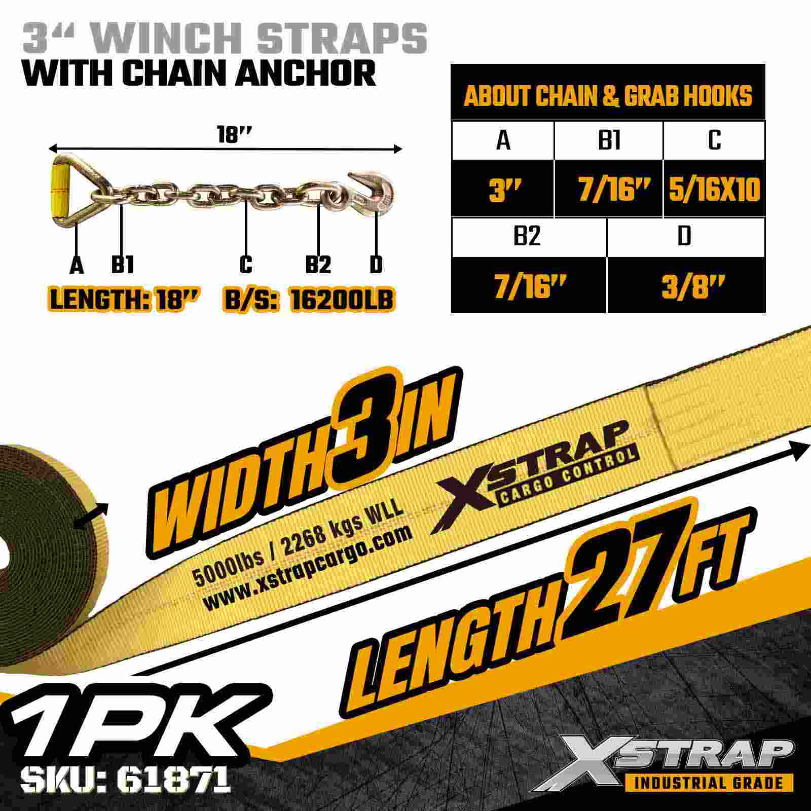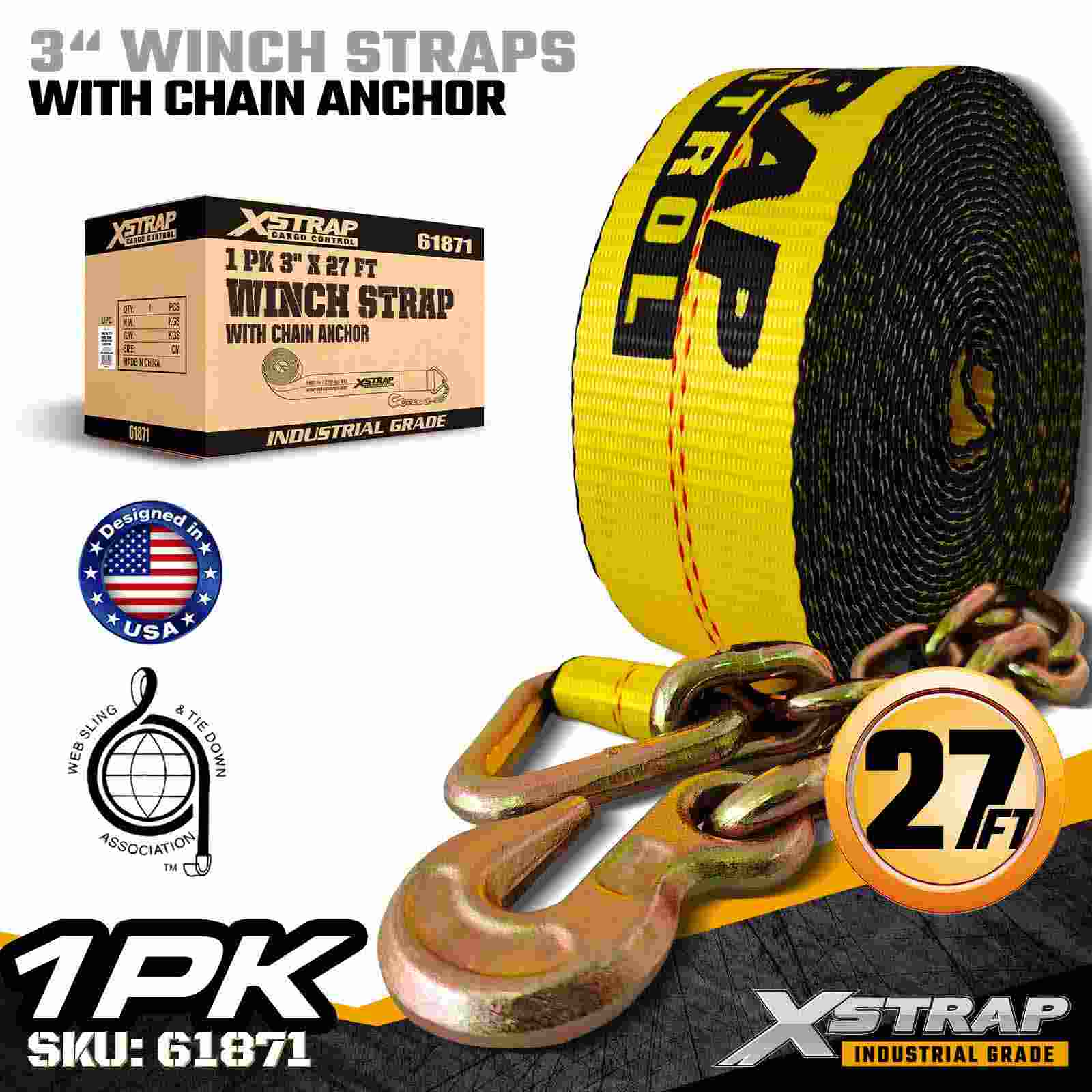 สายรัดกว้านมาตรฐาน Xstrap 61871 ขนาด 3 นิ้ว × 27 ฟุต ได้รับการออกแบบมาเพื่อการรักษาความปลอดภัยสินค้าบรรทุกหนักบนรถพ่วงพื้นเรียบ โดดเด่นด้วยพุกโซ่ปลอมแปลงและสายรัดโพลีเอสเตอร์กว้างพิเศษขนาด 3 นิ้ว สายรัดกว้านขนาด 3 นิ้วนี้ให้ขีดจำกัดการรับน้ำหนักการทำงาน 5,000 ปอนด์ และความต้านทานการแตกหัก 15,000 ปอนด์ ได้รับการออกแบบสำหรับการใช้งานในอุตสาหกรรมที่มีความต้องการสูงซึ่งต้องการความแข็งแรงในการยึดเกาะและความมั่นคงสูงสุด