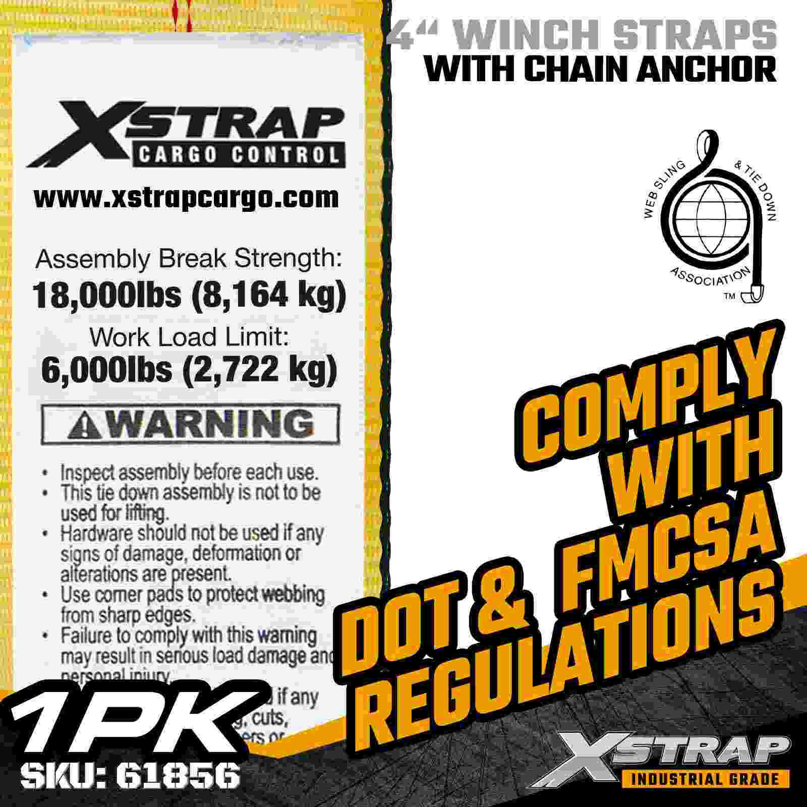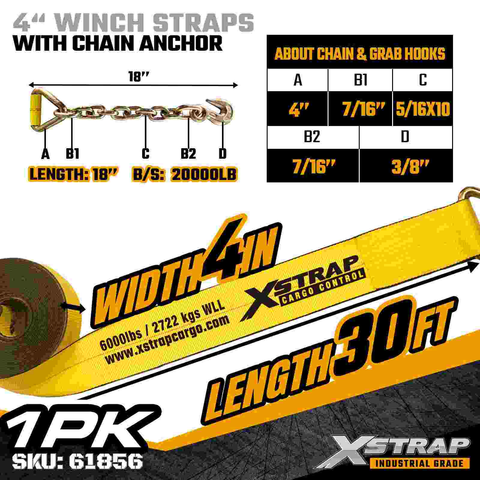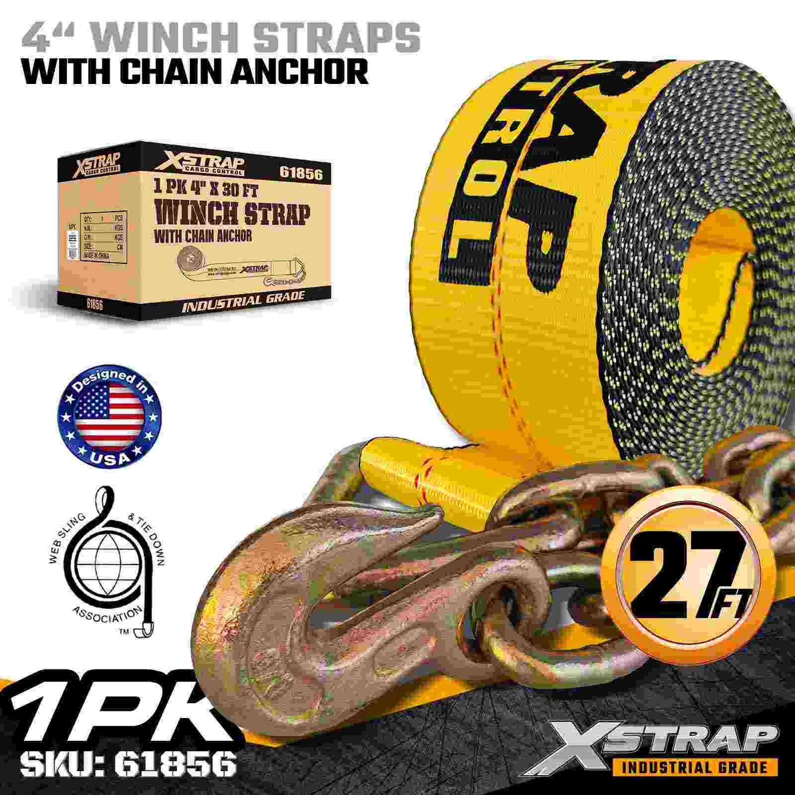 สายรัดกว้านมาตรฐาน Xstrap 61856 ขนาด 4 นิ้ว × 30 ฟุตเป็นสายรัดยึดสินค้าที่มีความจุสูงและขยายออกได้ ซึ่งออกแบบมาสำหรับรถพ่วงพื้นเรียบและสินค้าอุตสาหกรรมขนาดใหญ่ โดดเด่นด้วยพุกโซ่ปลอมแปลงและสายรัดโพลีเอสเตอร์กว้างพิเศษขนาด 4 นิ้ว สายรัดกว้านขนาด 4 นิ้วนี้ให้ขีดจำกัดการรับน้ำหนักการทำงาน 6,000 ปอนด์ และความต้านทานการแตกหัก 18,000 ปอนด์ ความยาวที่ขยายเพิ่ม 30 ฟุตให้ระยะยื่นเพิ่มเติมเพื่อความปลอดภัย โหลดที่กว้าง สูง หรือมีรูปร่างไม่สม่ำเสมอซึ่งต้องการความแข็งแรงและความมั่นคงในการยึดเกาะสูงสุด