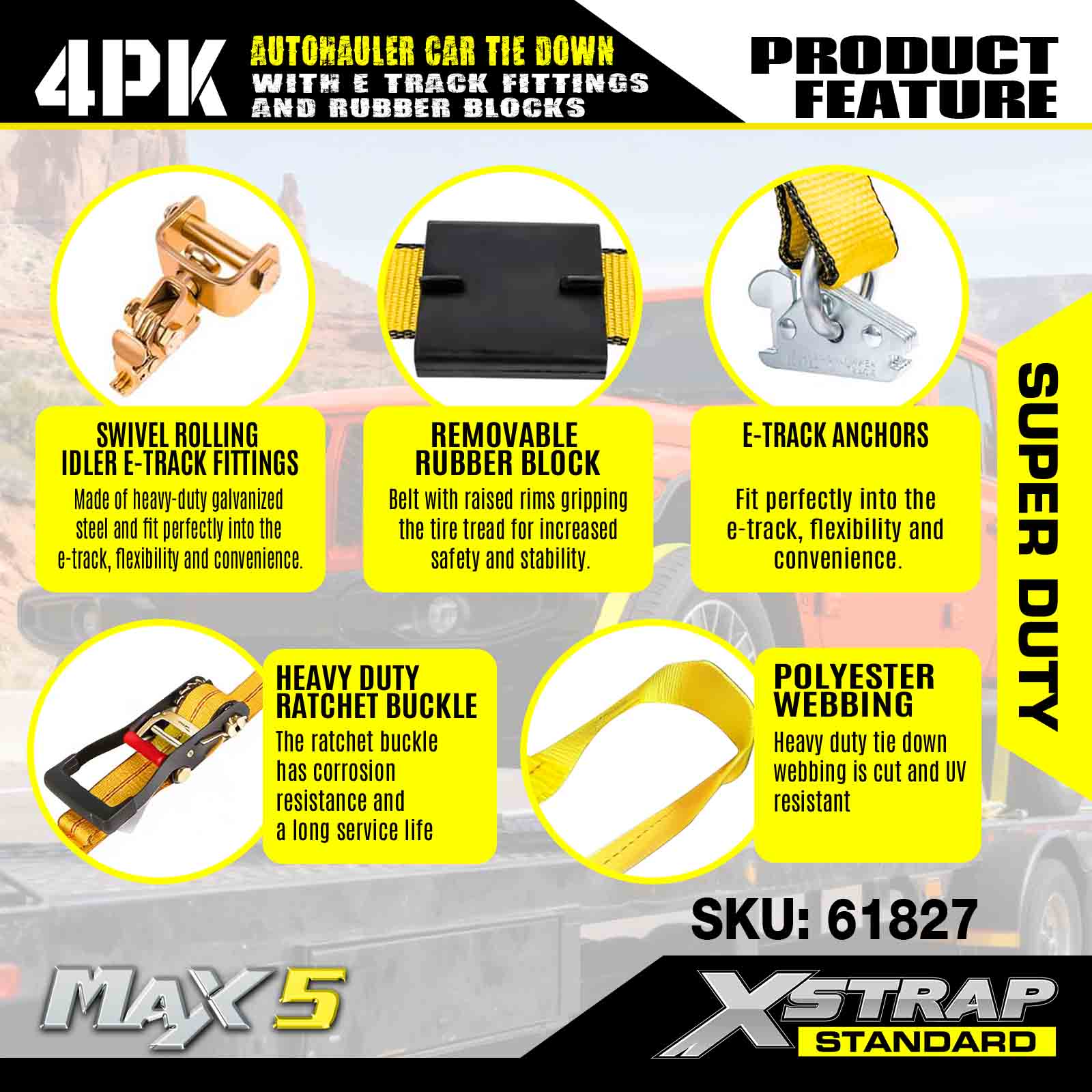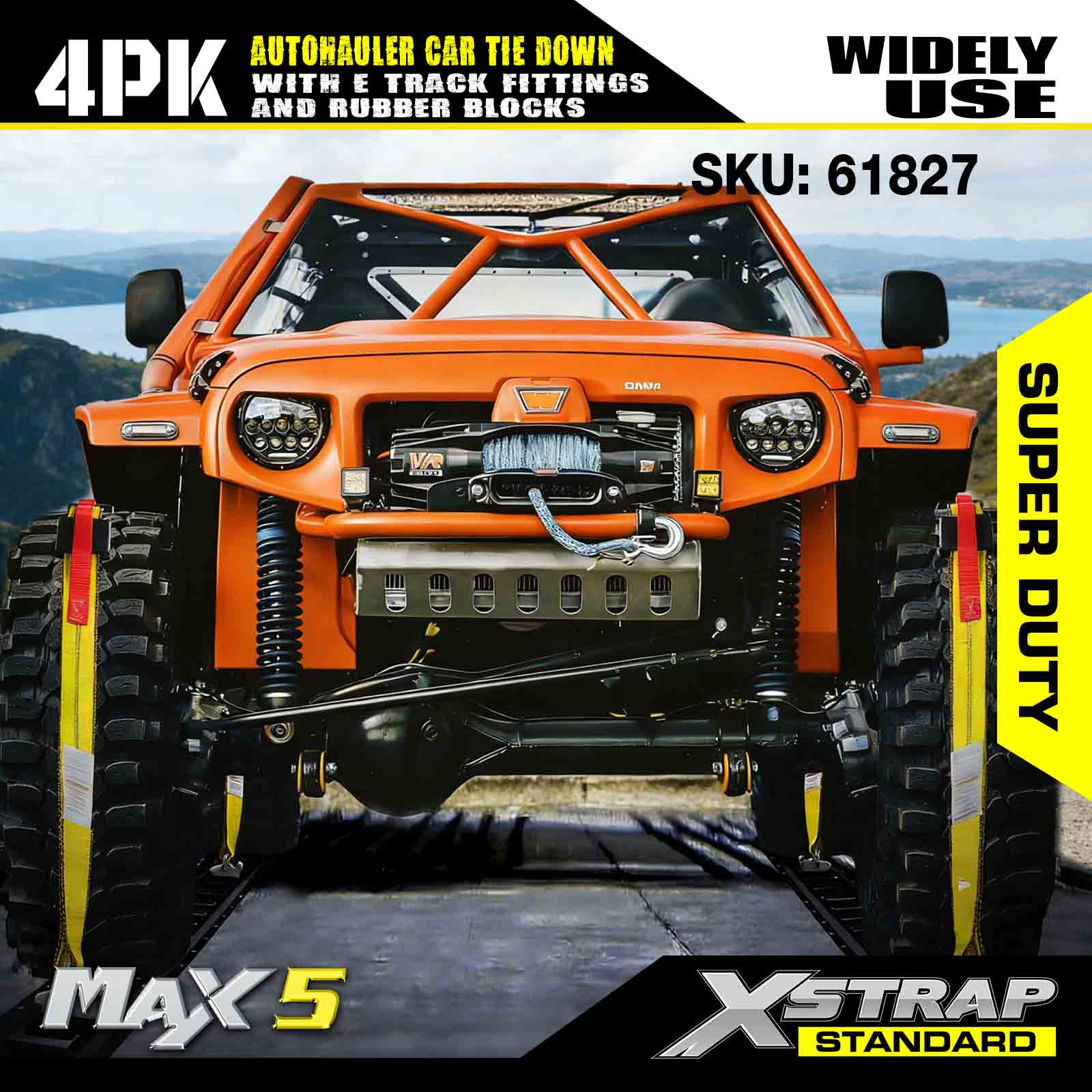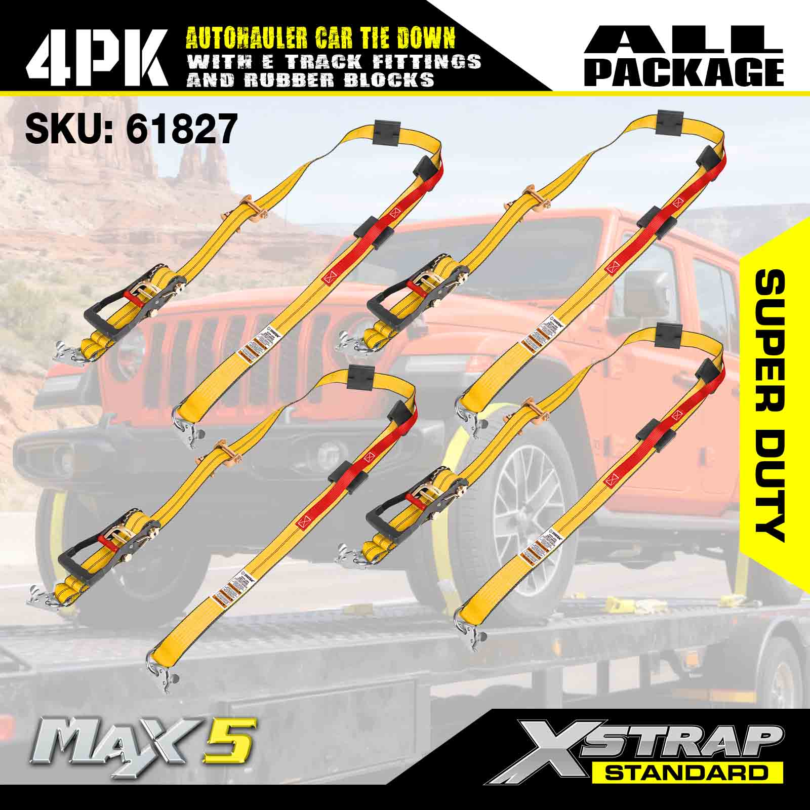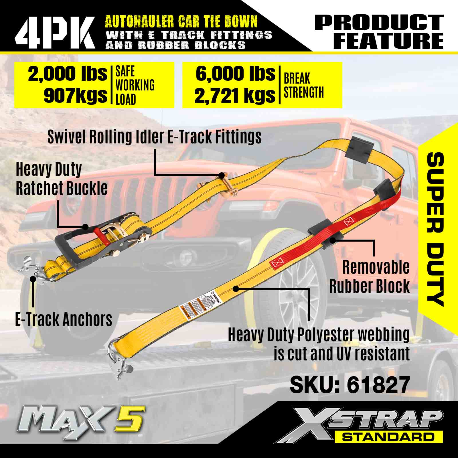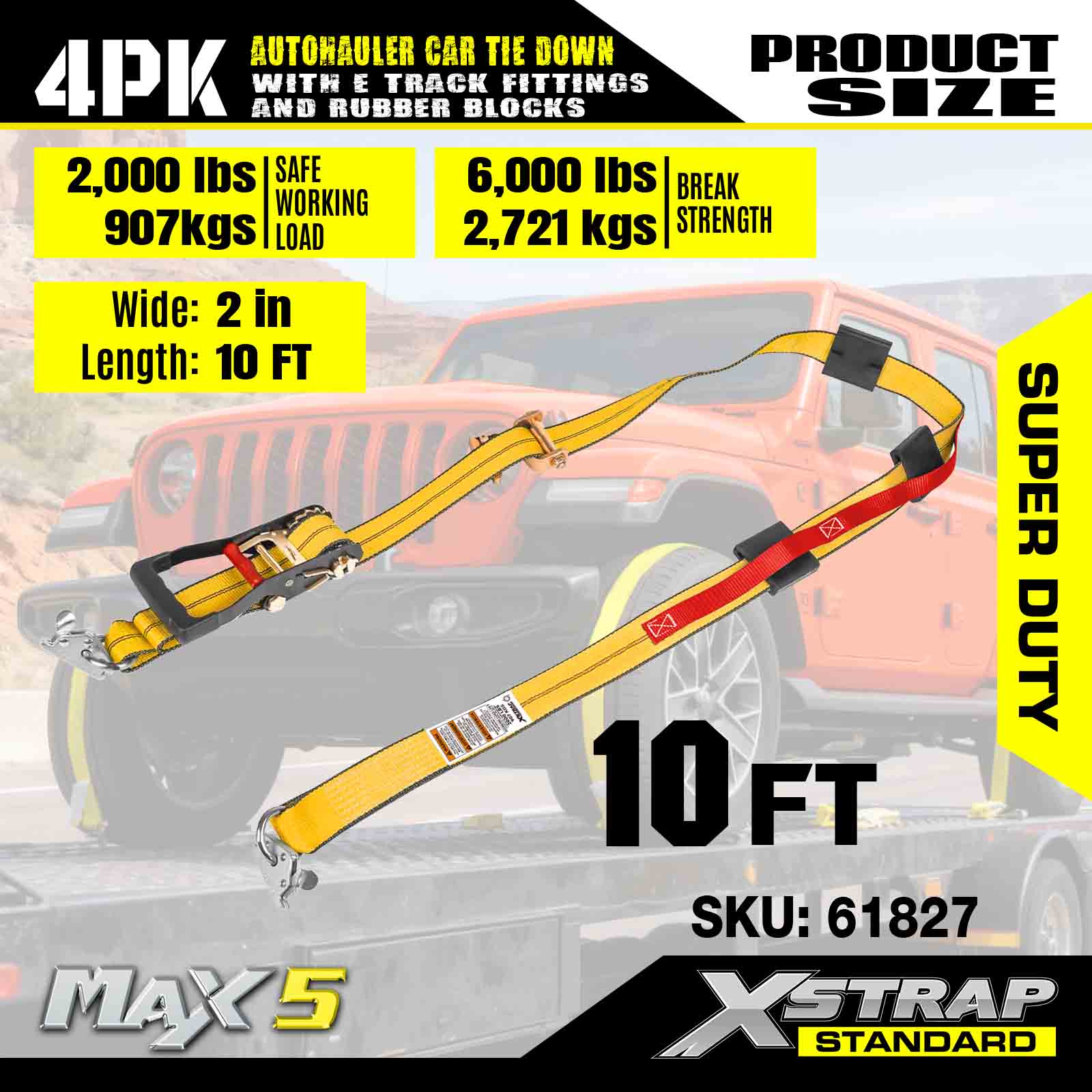 Xstrap Xstrap E Track สายรัดยางสำหรับรถพ่วง Heavy Duty 2 "x 10' Auto Hauler Strap-6,000lb รับประกัน Break Strength-(4) ชุดผูกยานพาหนะระดับพรีเมียมพร้อมบล็อกยาง Tie-Downs ล้อสำหรับรถบรรทุก, UTV