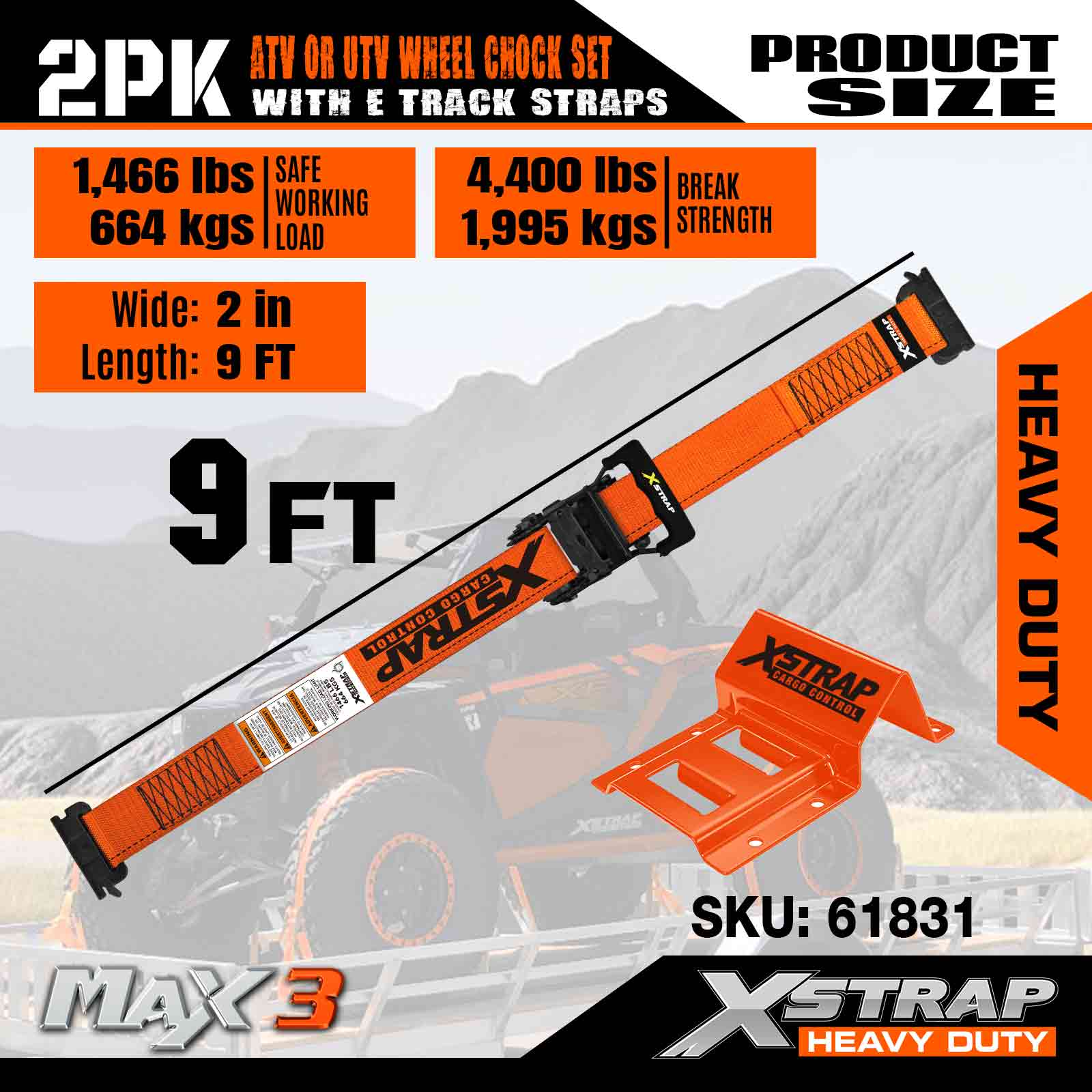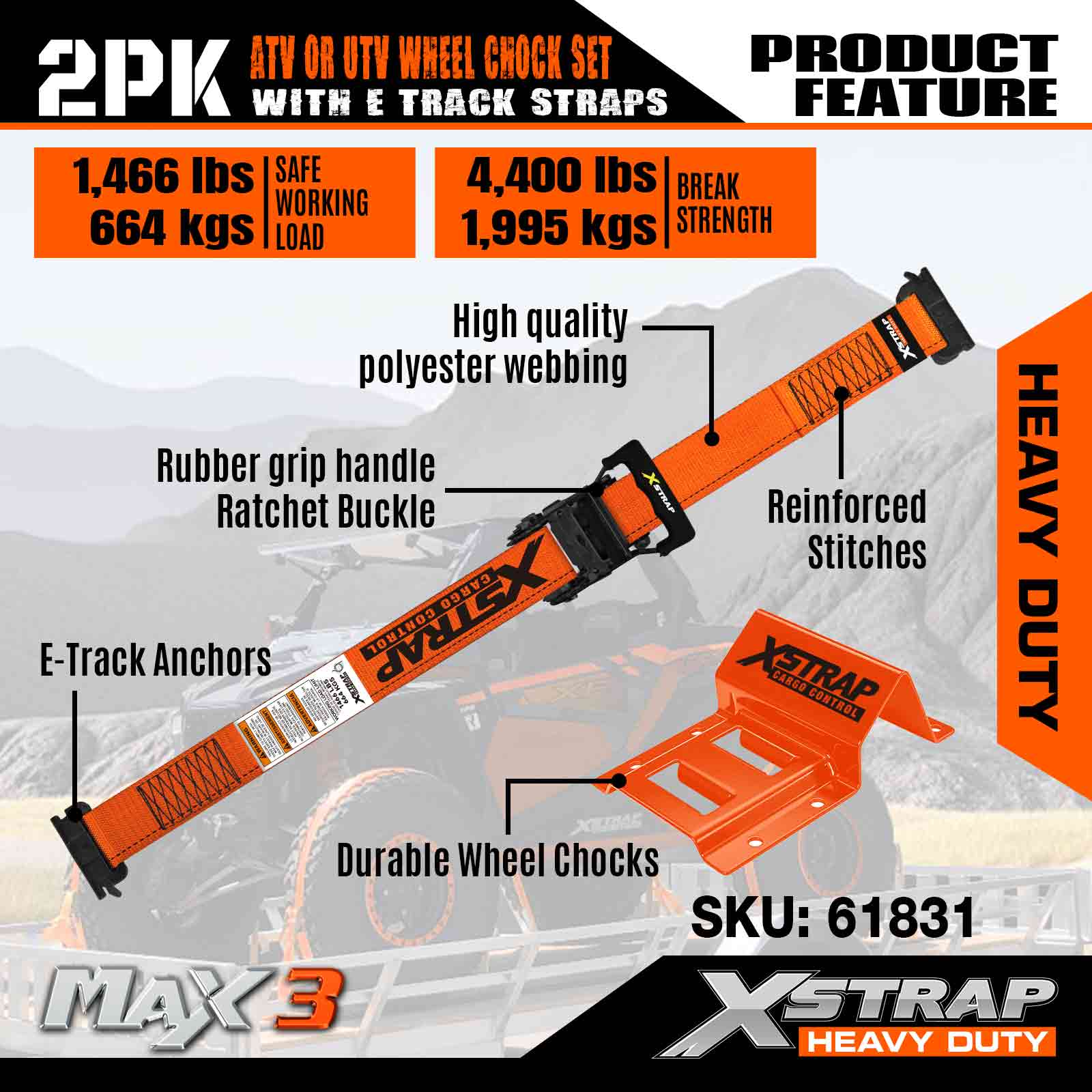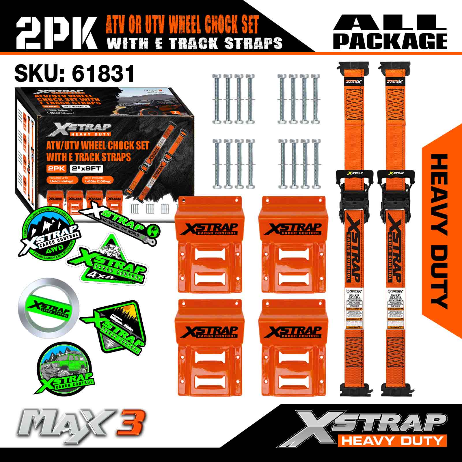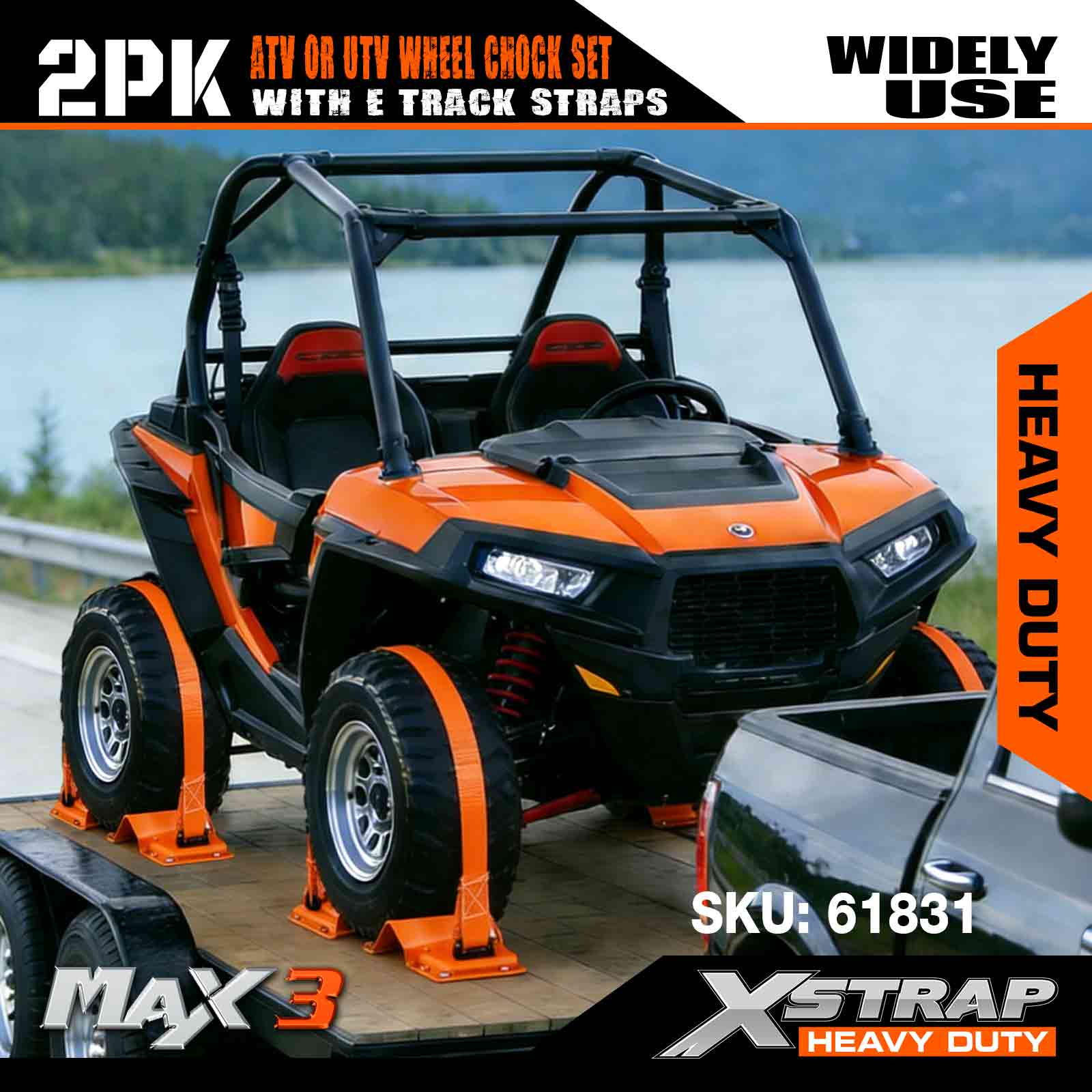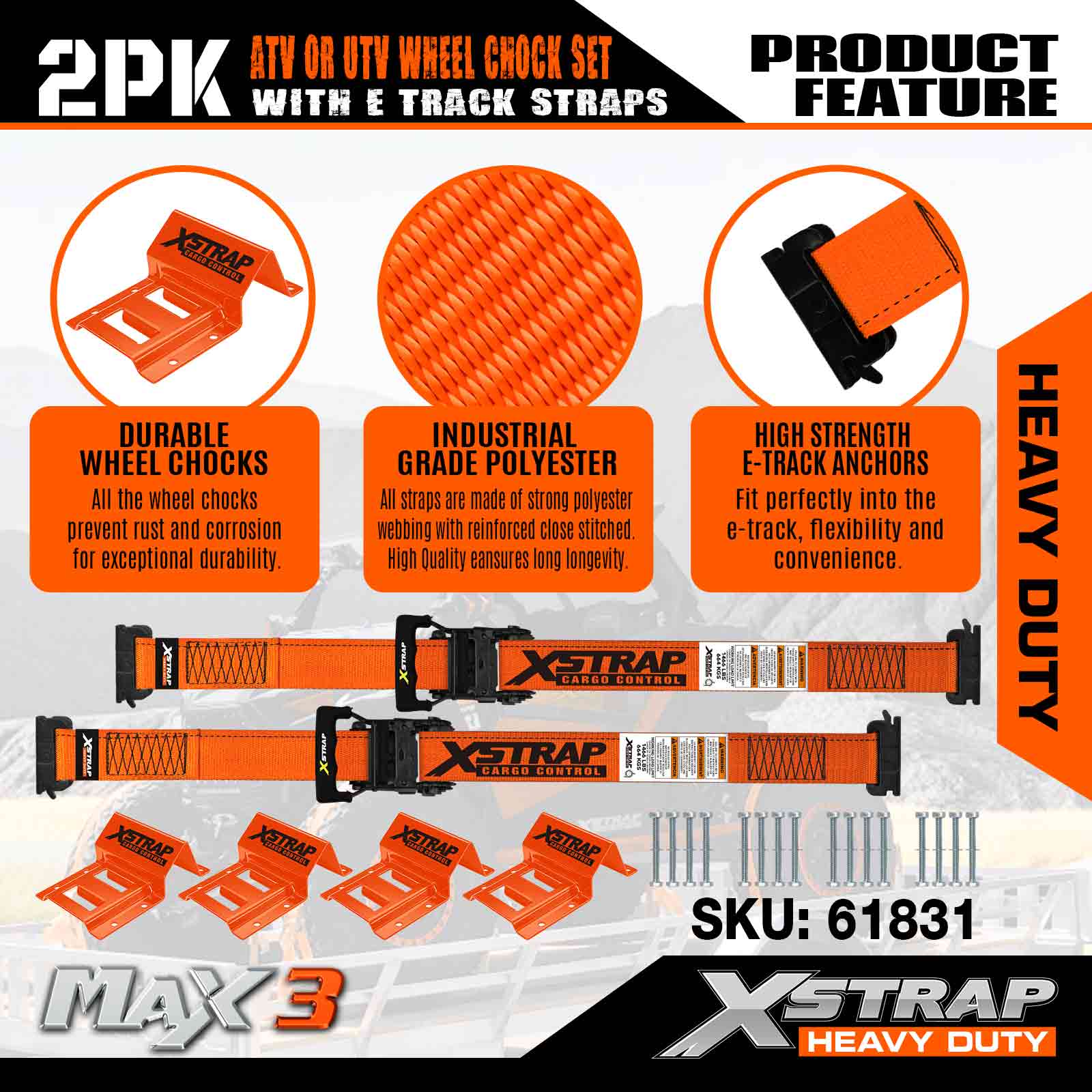 ชุดผูกหนุนหนุนล้อ Xstrap UTV แรงแตกหัก 4,400 ปอนด์ (4) สายรัดวงล้อยางรถพ่วงสำหรับงานหนัก (8) หนุนล้อ - ระบบ E Track สำหรับ ATV, UTV, เครื่องตัดหญ้า สี่ล้อ - สีส้ม
