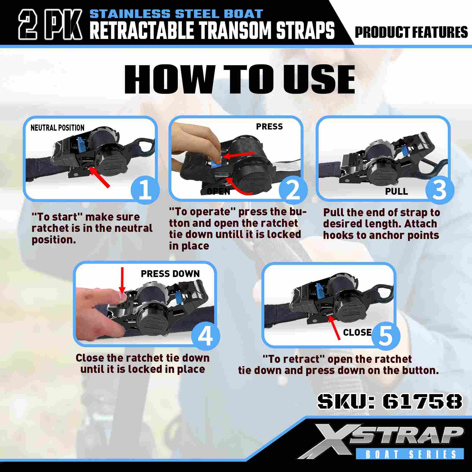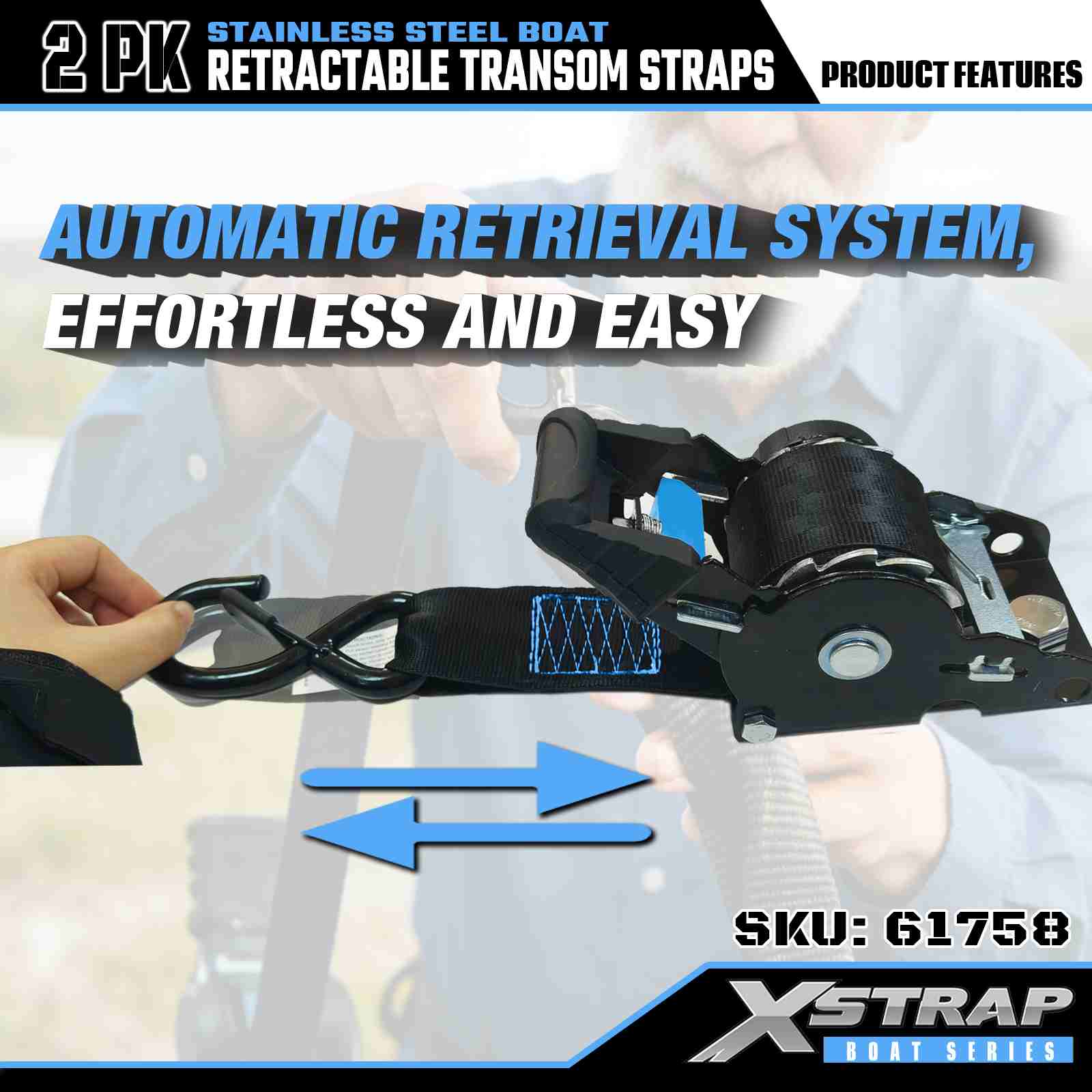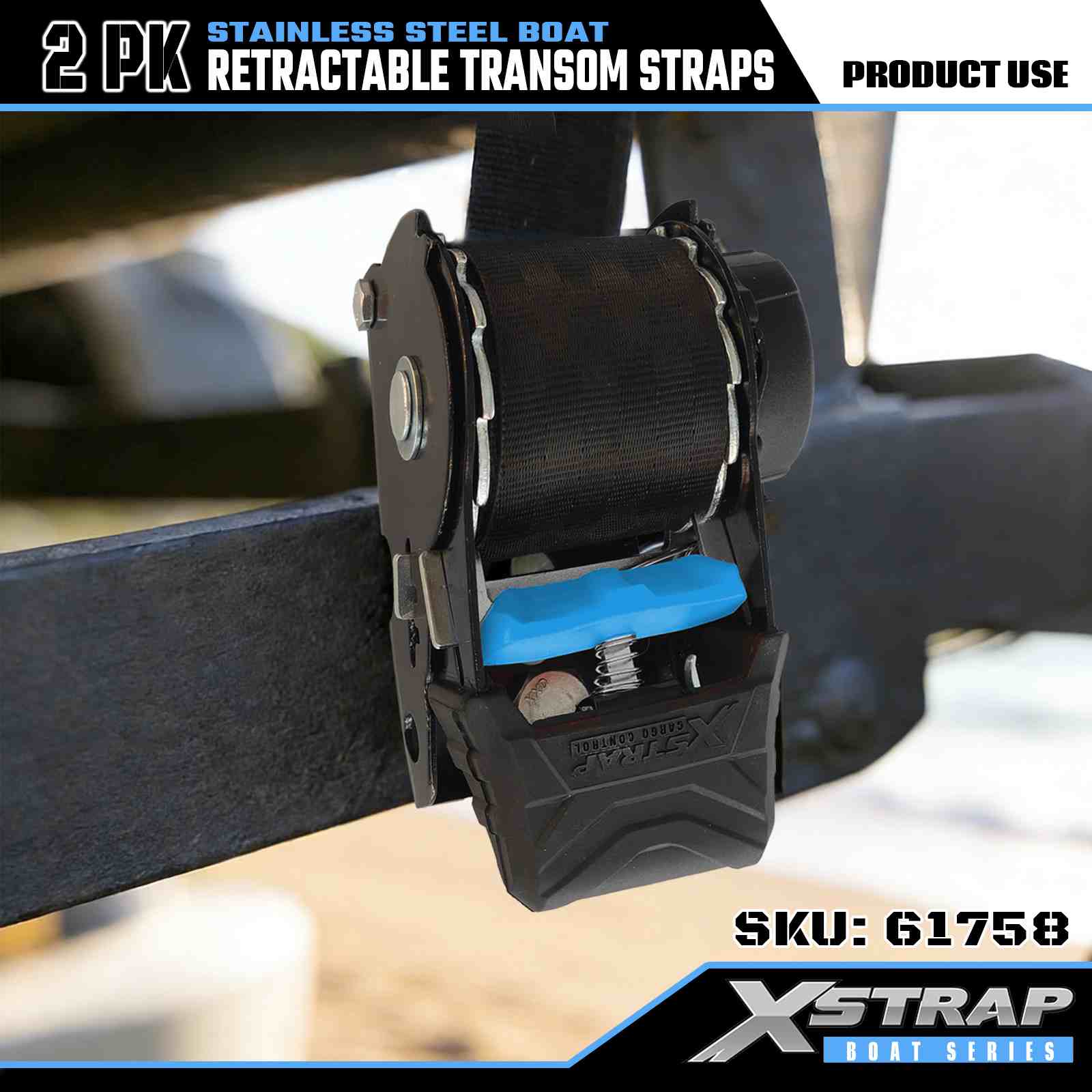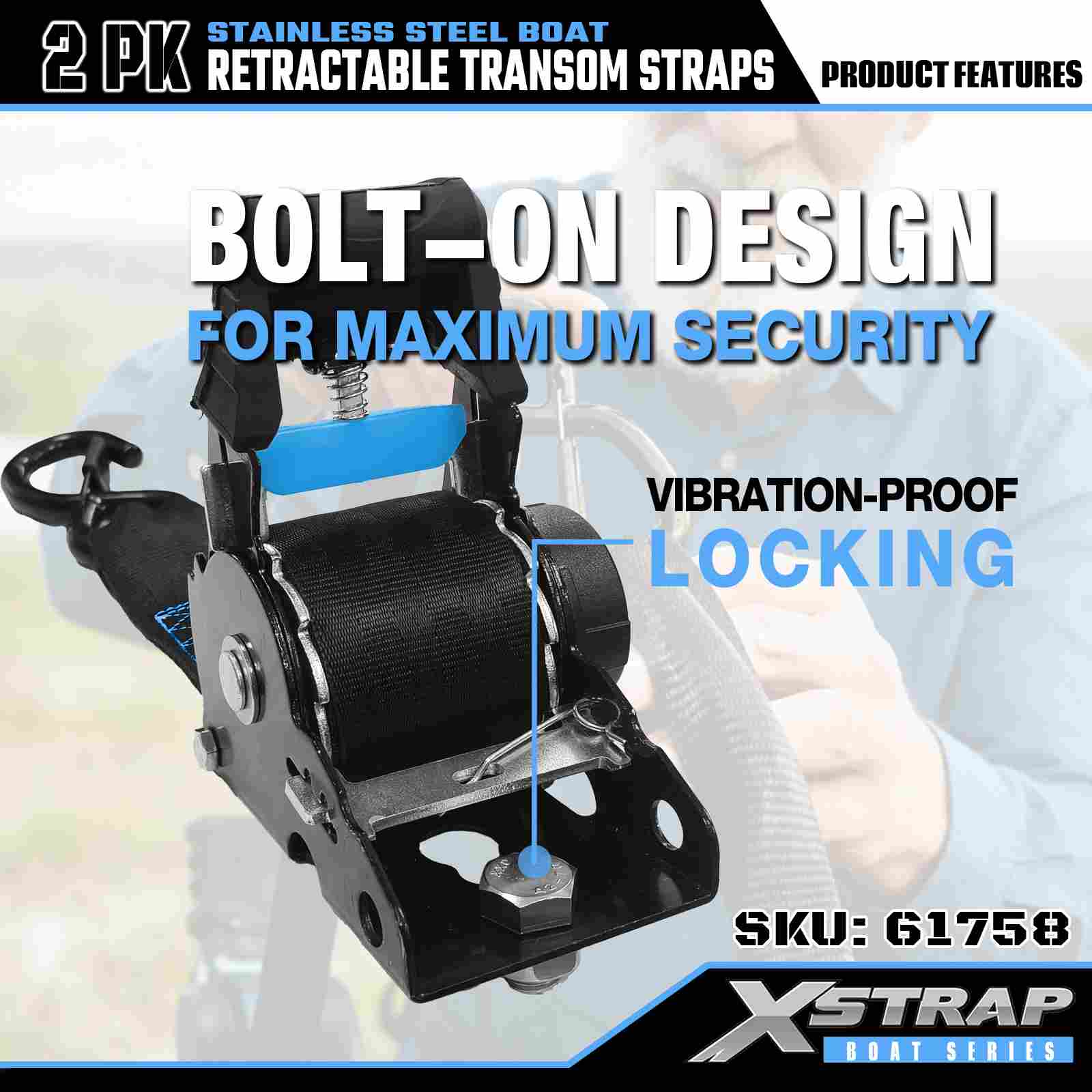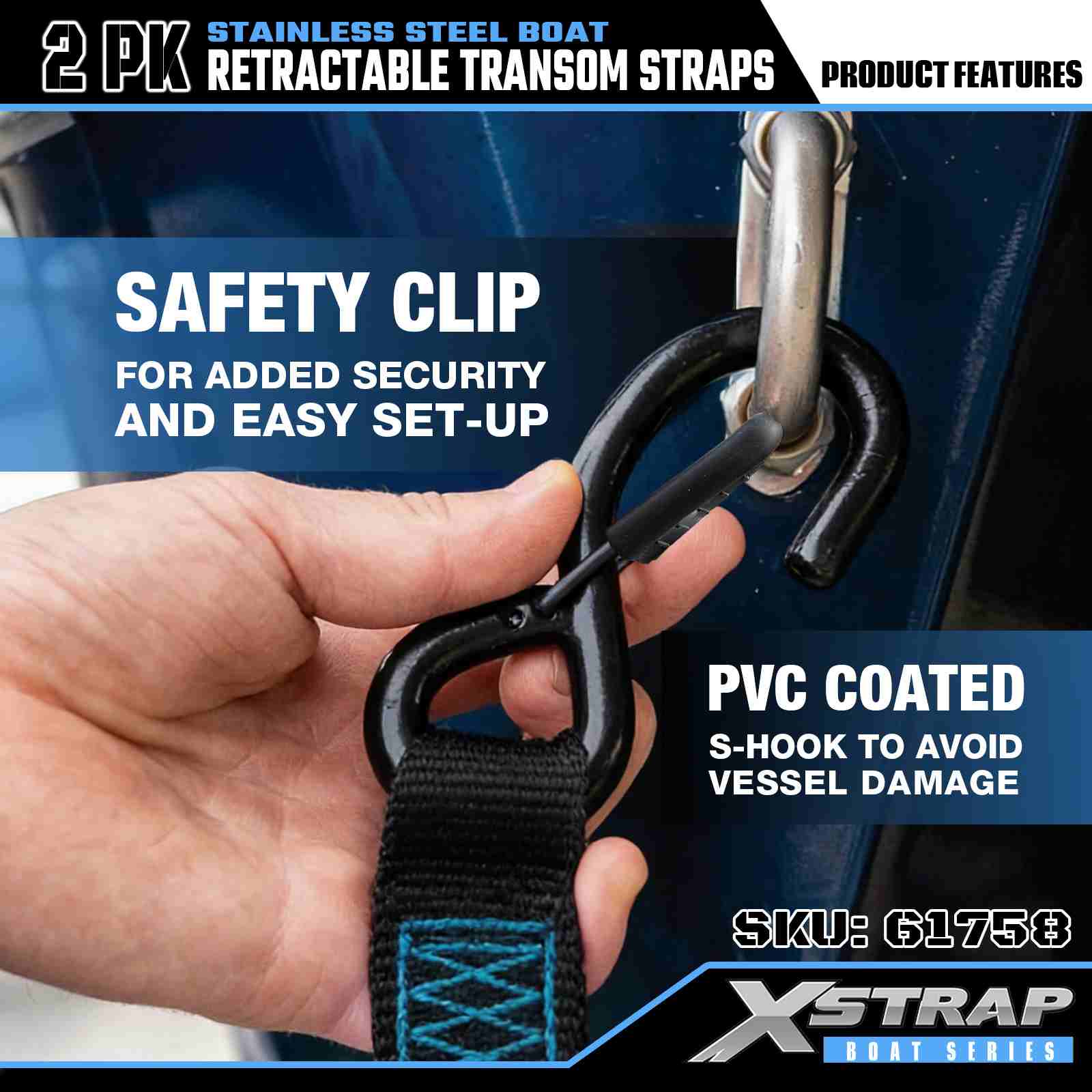สายรัดท้ายเรือแบบยืดหดได้ขนาด 2” x 3.6’ 2PK พร้อมตะขอนิรภัย S