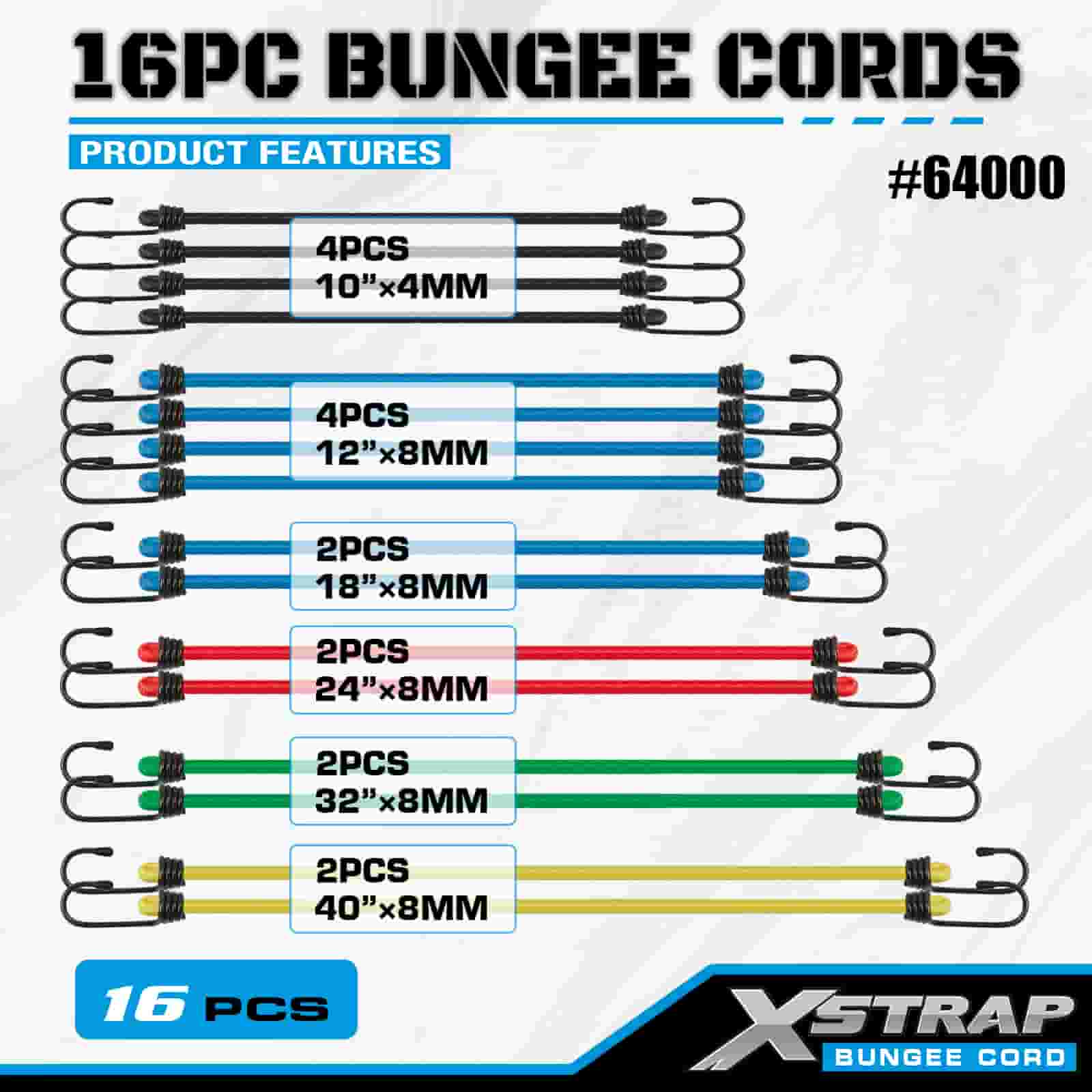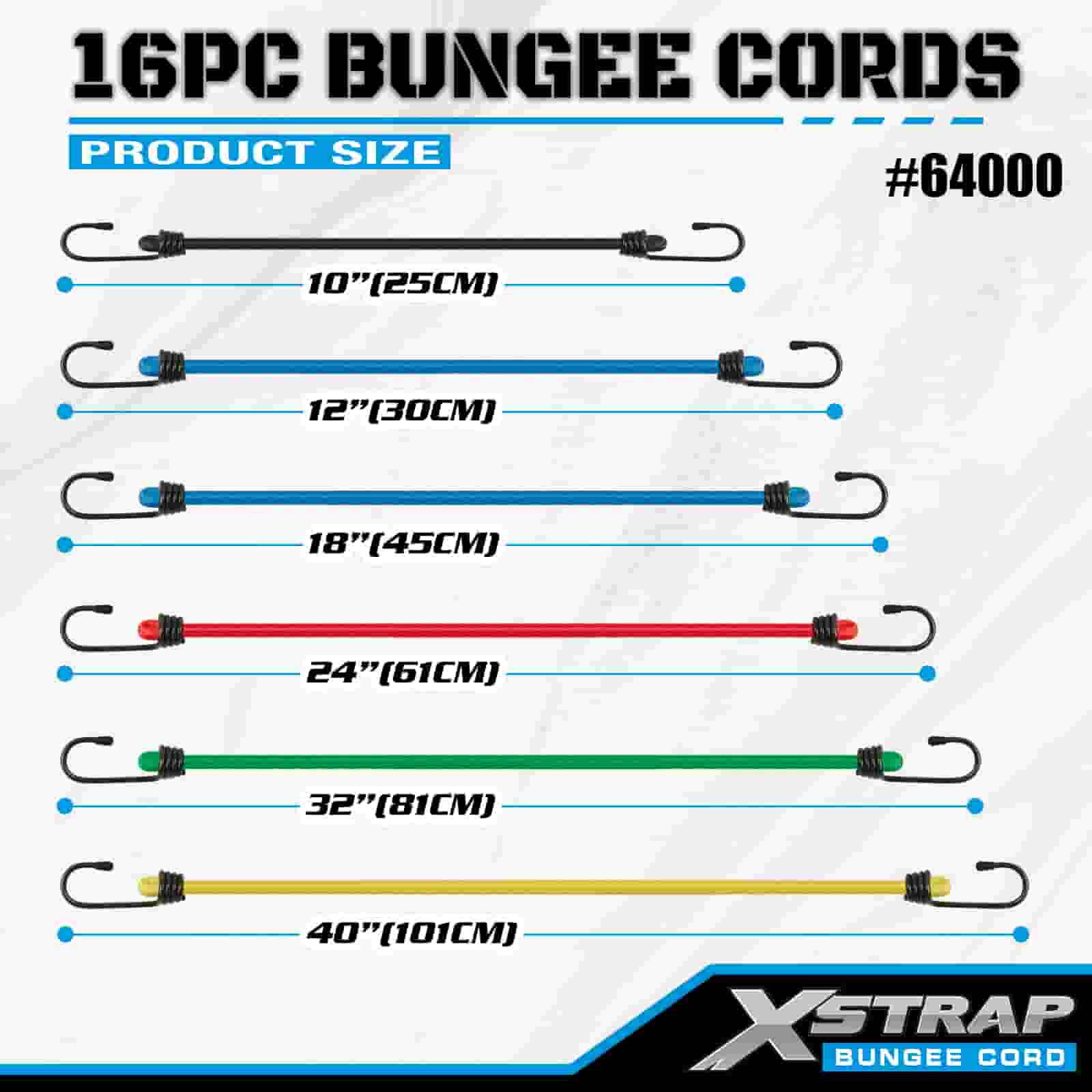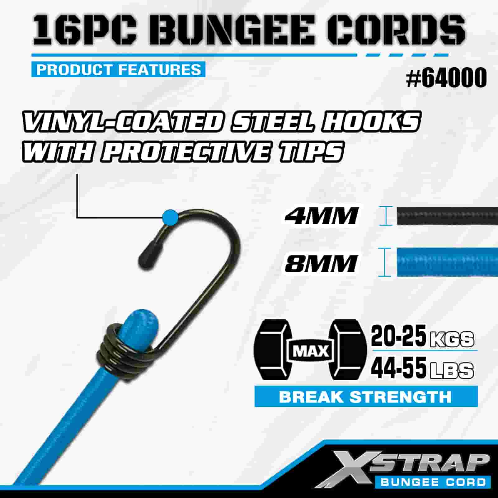 ชุดสายบันจี้จัม Xstrap 16PK 16PK 8 มม. x 12"/18"/24"/ 32"/40"; บันจี้จัมขนาดเล็ก 4 มม. x 10" ความแข็งแรงในการแตกหัก 44-55 ปอนด์พร้อมตะขอเหล็กเคลือบไวนิลพร้อมปลายป้องกันและตะขอสปริงมาตรฐาน