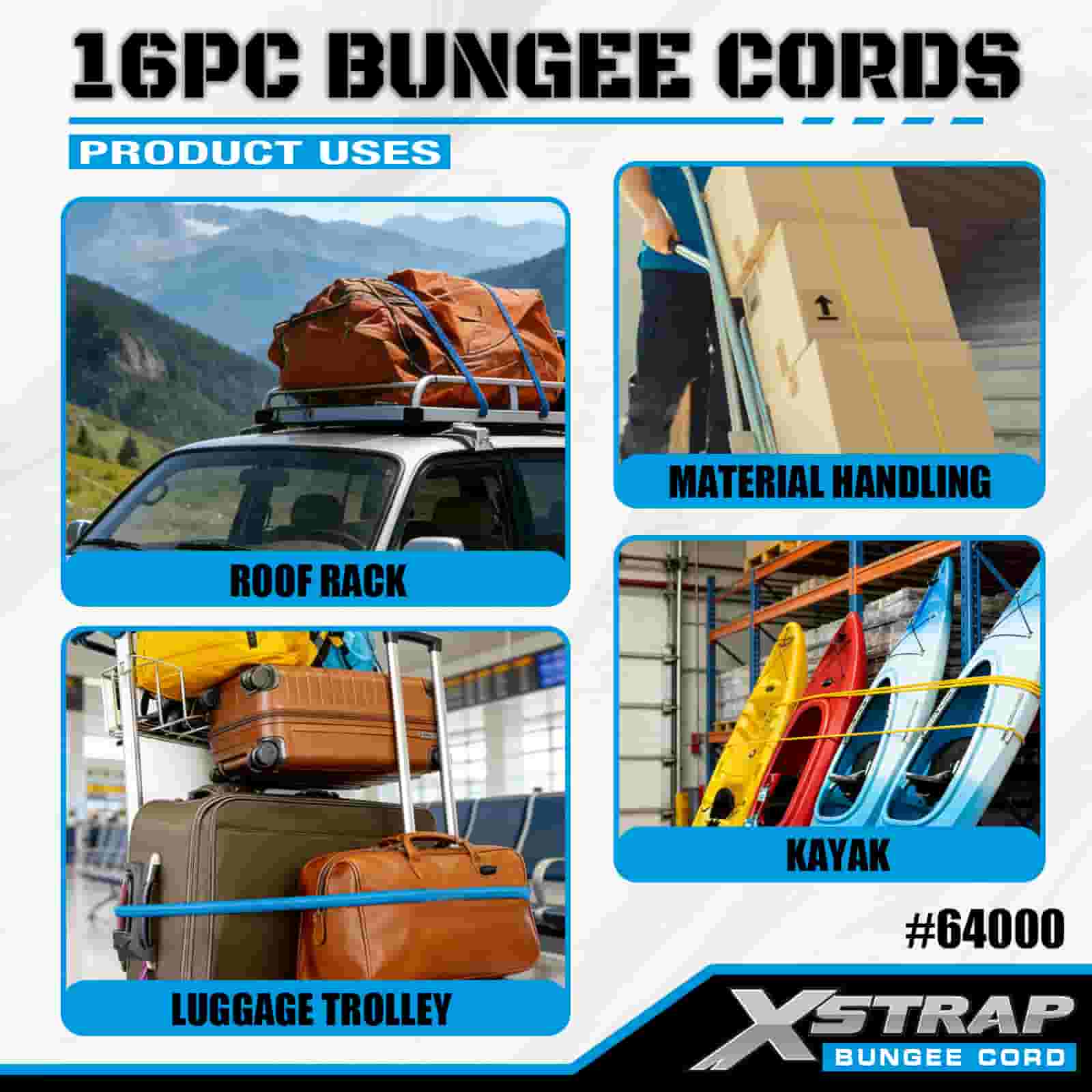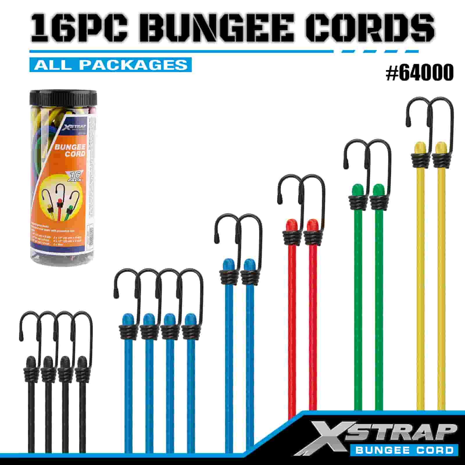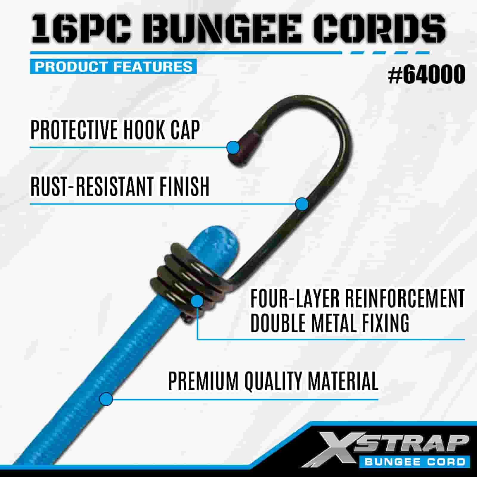 ชุดสายบันจี้จัม Xstrap 16PK 16PK 8 มม. x 12"/18"/24"/ 32"/40"; บันจี้จัมขนาดเล็ก 4 มม. x 10" ความแข็งแรงในการแตกหัก 44-55 ปอนด์พร้อมตะขอเหล็กเคลือบไวนิลพร้อมปลายป้องกันและตะขอสปริงมาตรฐาน