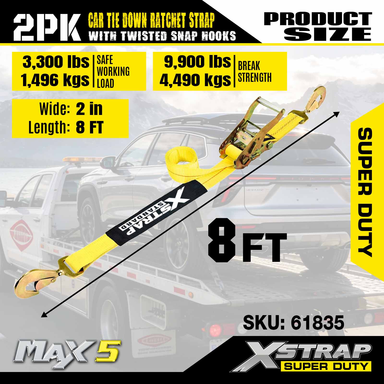 Xstrap รถ Tie Down สายรัดสำหรับรถพ่วง,2 นิ้ว x 8 นิ้ว Heavy Duty Car Hauler สายรัดวงล้อ, 2PK, 10,000lbs Break Strength