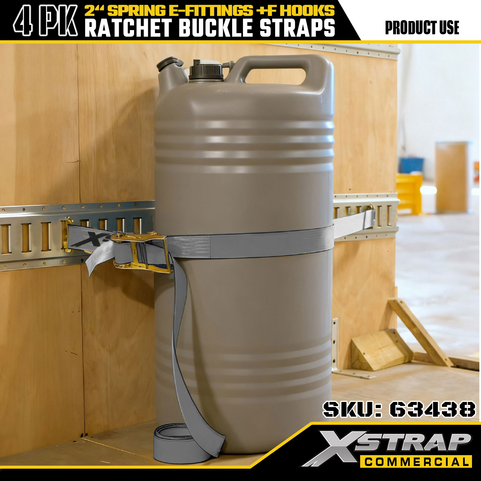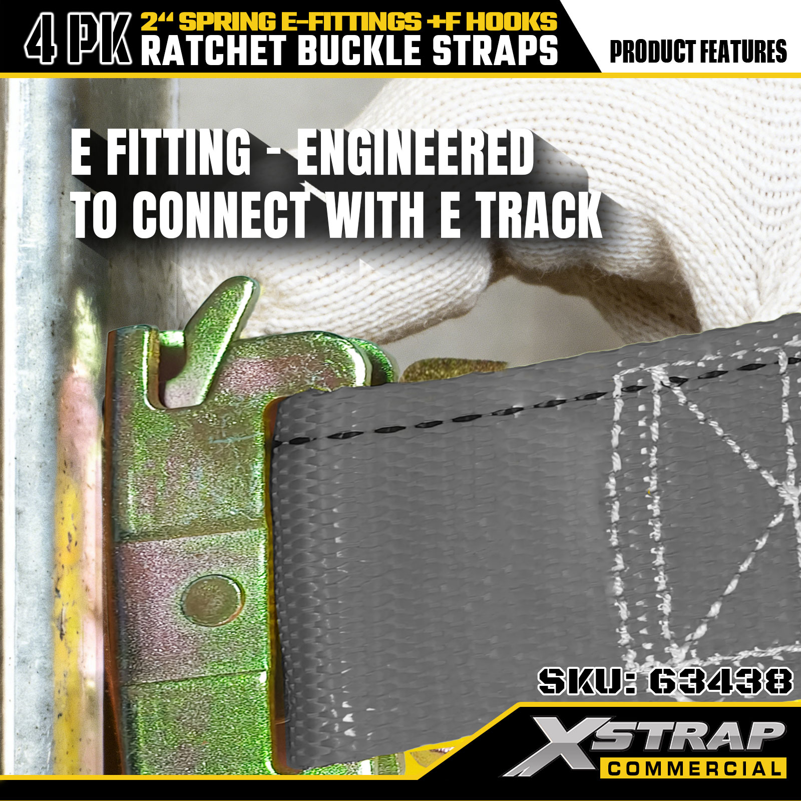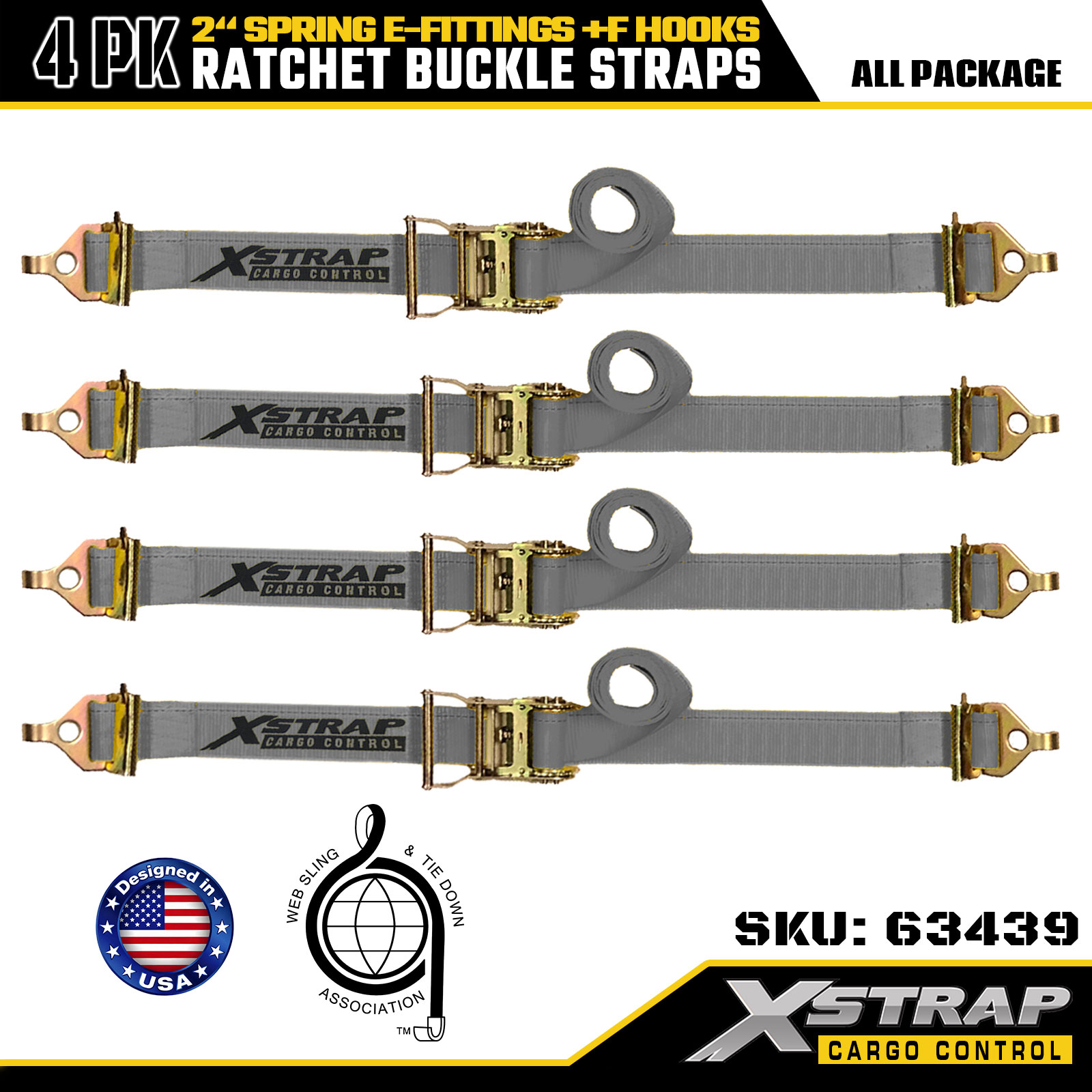 Xstrap 4 Pack 2" x 16' Ratchet Tie-Down Straps - โพลีเอสเตอร์สีเทาพร้อมสปริง E-Fitting และตะขอ F, 733 lbs SWL สำหรับการขนย้าย รถบรรทุก และขนส่งสินค้าทั่วไป