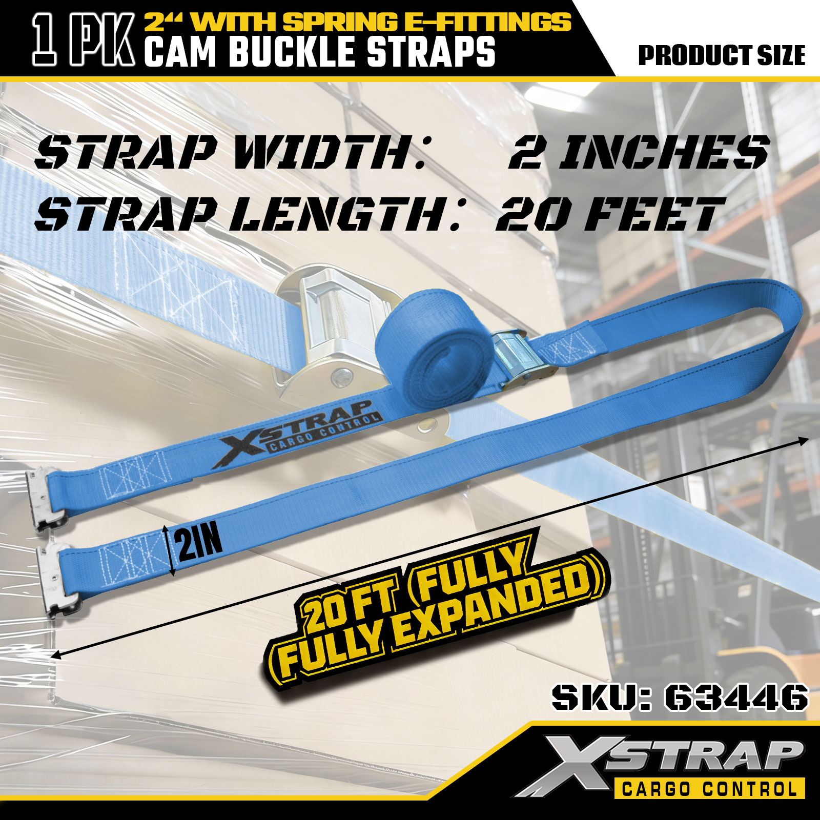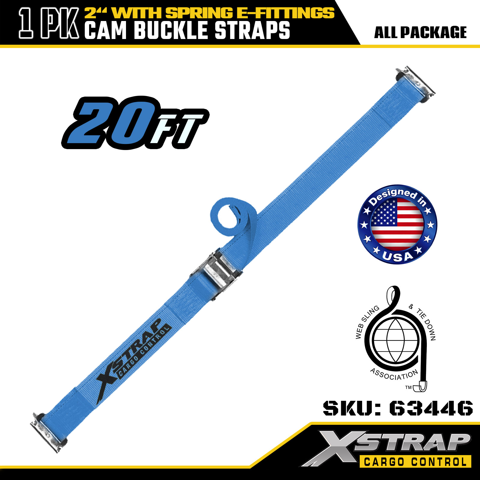 Xstrap 63446 Heavy-Duty Ratchet Strap 2" x 20' (1PK) - โพลีเอสเตอร์สีน้ำเงินพร้อมสปริง E-Fitting และตะขอ F, 733 lbs SWL และ 332 lbs Breaking Strength สำหรับการควบคุมสินค้า การเคลื่อนย้าย และการขนส่ง