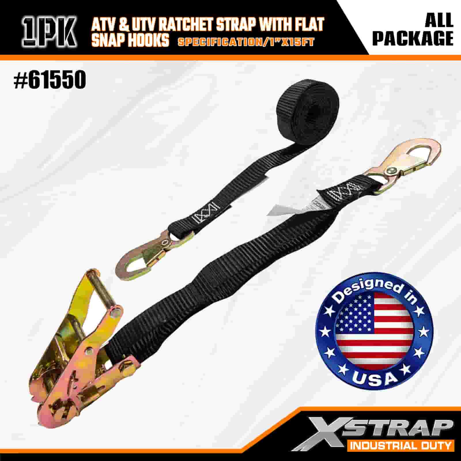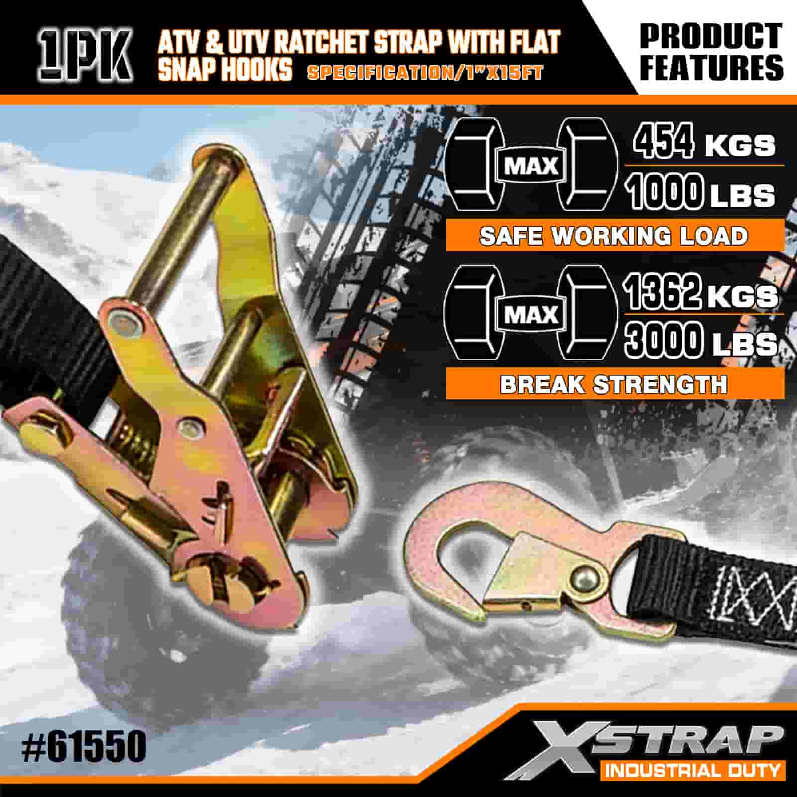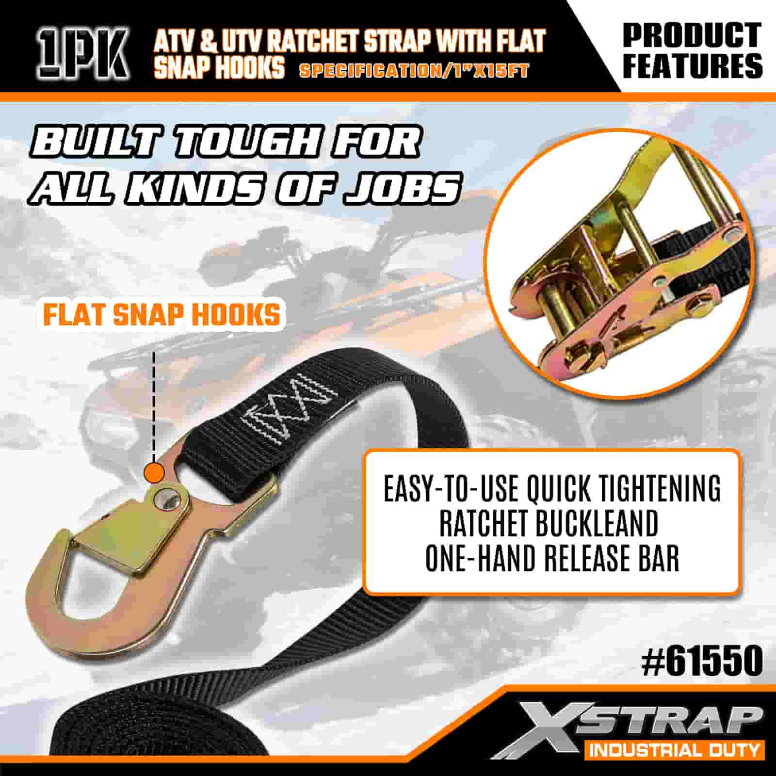 สายรัดวงล้อ Xstrap ATV และ AUV พร้อมตะขอเกี่ยวแบบแบน, สายรัดโพลีเอสเตอร์แบบผูกลงขนาด 1” x 15’ สายรัดแบบเฟืองวงล้อความจุ 1,000 ปอนด์ สายรัดยึดสายรัดสำหรับบรรทุกสินค้าพร้อมตัวล็อคแบบแบนสำหรับรถพ่วง รถพ่วงพื้นเรียบ เรือสกี รถขนาดเล็ก เครื่องจักรกลหนัก