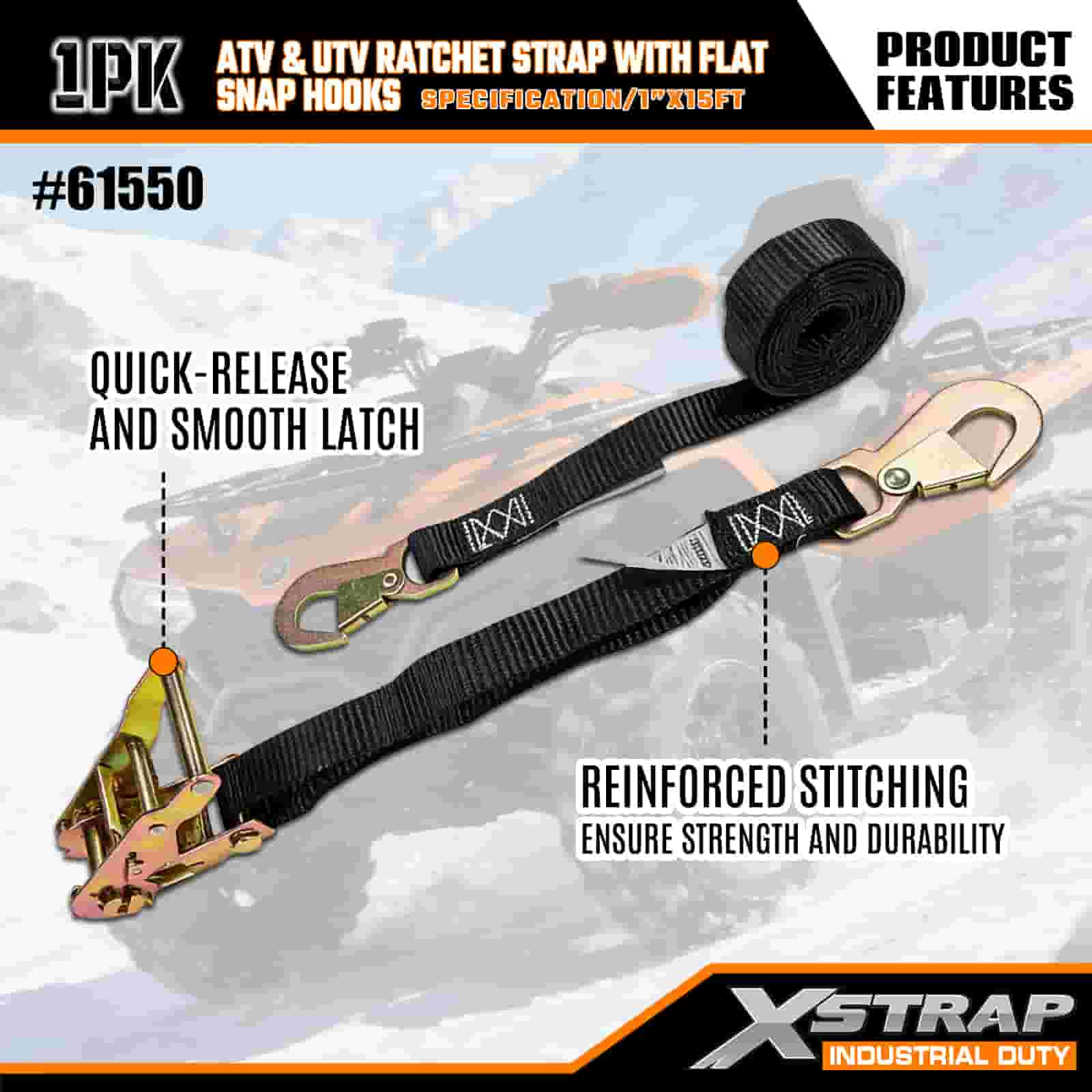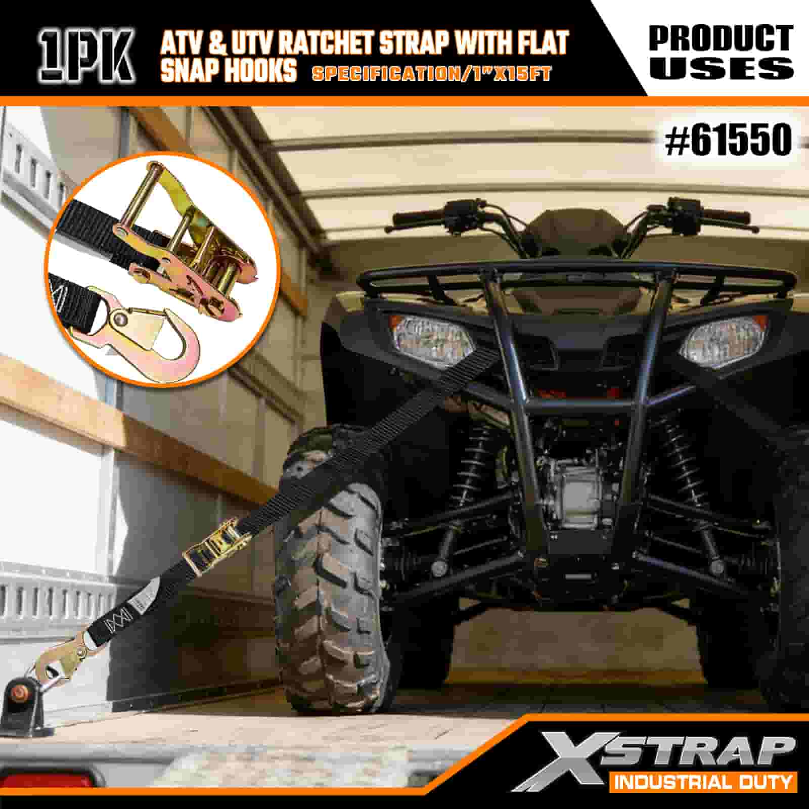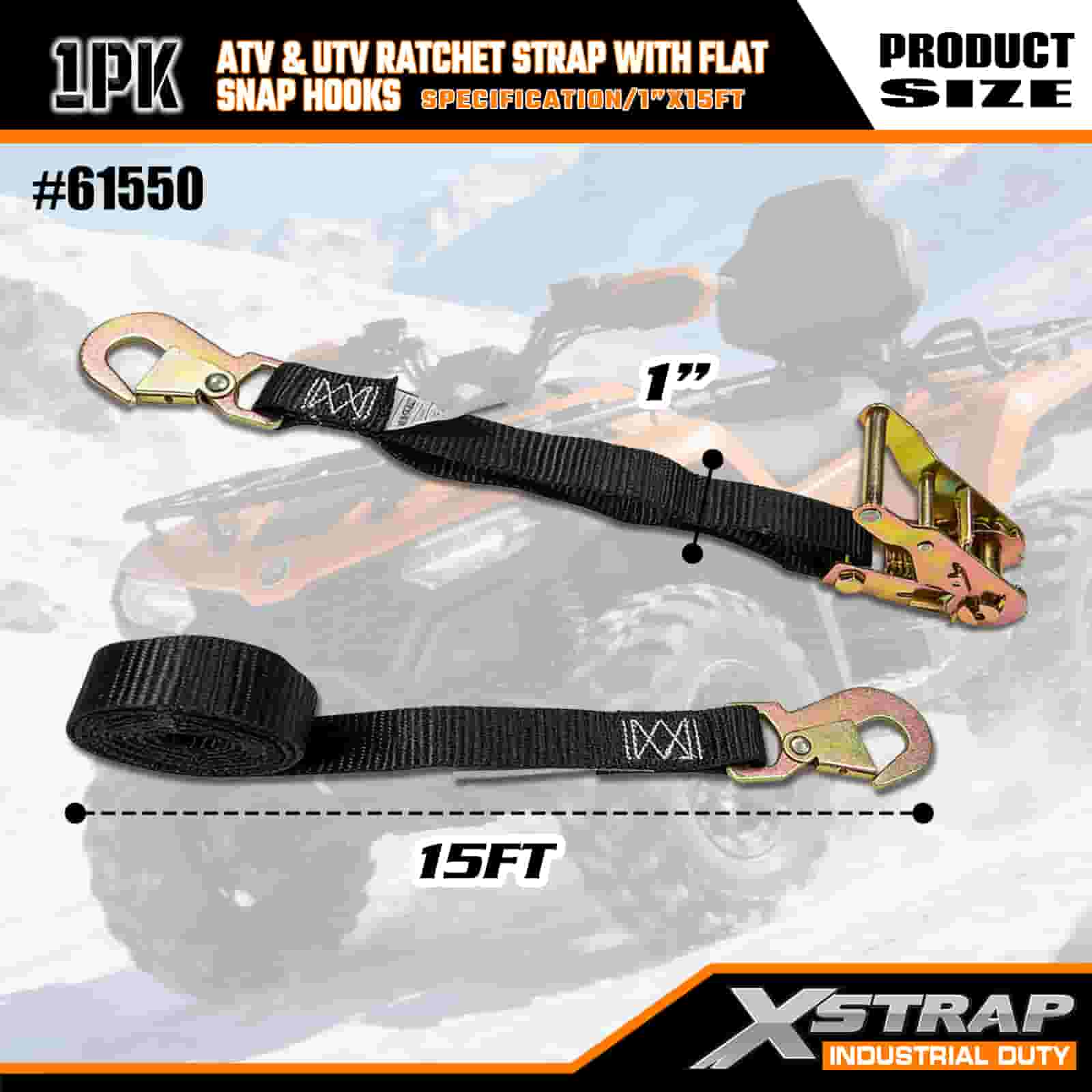 สายรัดวงล้อ Xstrap ATV และ AUV พร้อมตะขอเกี่ยวแบบแบน, สายรัดโพลีเอสเตอร์แบบผูกลงขนาด 1” x 15’ สายรัดแบบเฟืองวงล้อความจุ 1,000 ปอนด์ สายรัดยึดสายรัดสำหรับบรรทุกสินค้าพร้อมตัวล็อคแบบแบนสำหรับรถพ่วง รถพ่วงพื้นเรียบ เรือสกี รถขนาดเล็ก เครื่องจักรกลหนัก