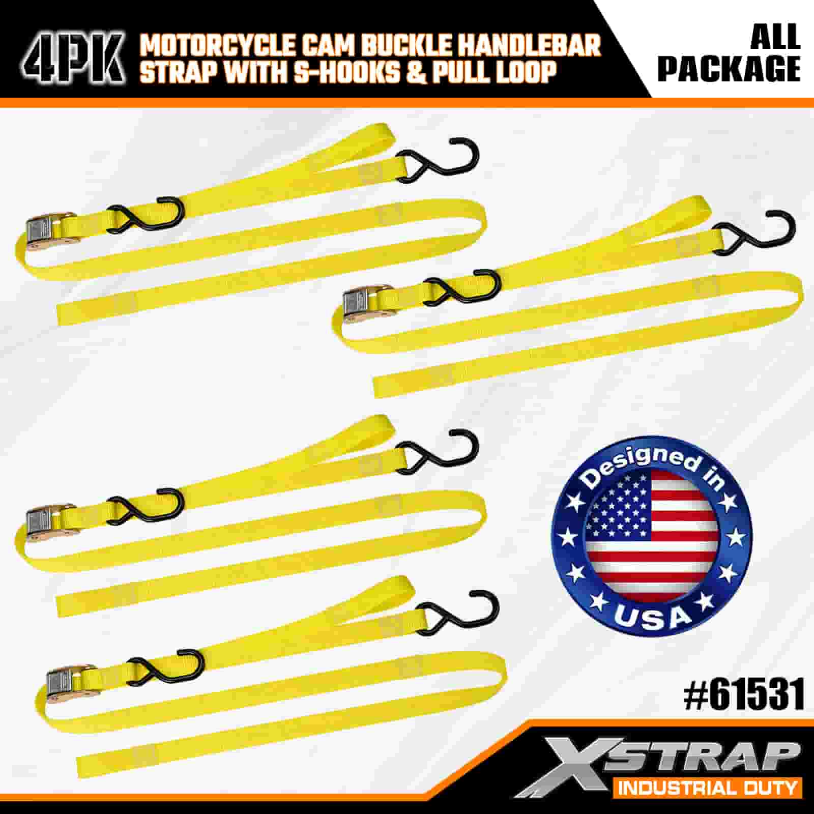 - สายรัดแพ็ค 6 ฟุต 4 ชิ้นสำหรับใช้กับรถจักรยานยนต์: ขายเป็นชุดสายรัด 4 เส้น (กว้าง 1 นิ้ว × ยาว 6 ฟุต) เหมาะสำหรับการยึดรถจักรยานยนต์ แฮนด์รถ และเกียร์ขนาดเล็กในกระบะท้ายรถบรรทุกหรือระหว่างการขนส่ง