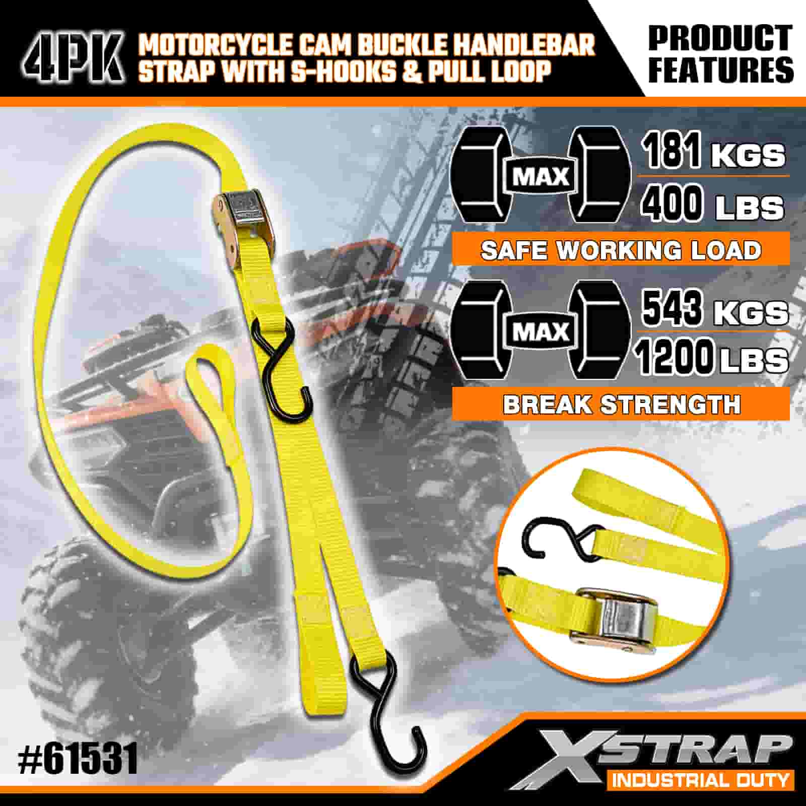 Xstrap 4PK สายรัดมือจับหัวเข็มขัดแคมรถจักรยานยนต์พร้อมตะขอ S และห่วงดึง, สายรัดโพลีเอสเตอร์ขนาด 1” x 6' สายรัดหัวเข็มขัดแบบดึง, สายรัดยึดสายรัดสินค้าความจุ 400 ปอนด์พร้อมตะขอ S สำหรับมืออาชีพที่จริงจังในการรักษาความปลอดภัยรถพ่วงบรรทุกสินค้า, รถพ่วงเตียงเรียบ, เรือสกี, รถยนต์ขนาดเล็ก
