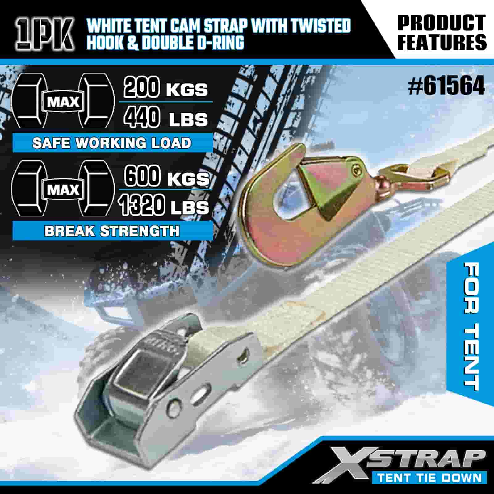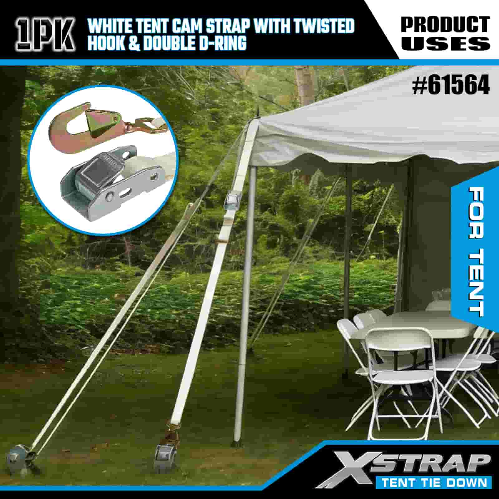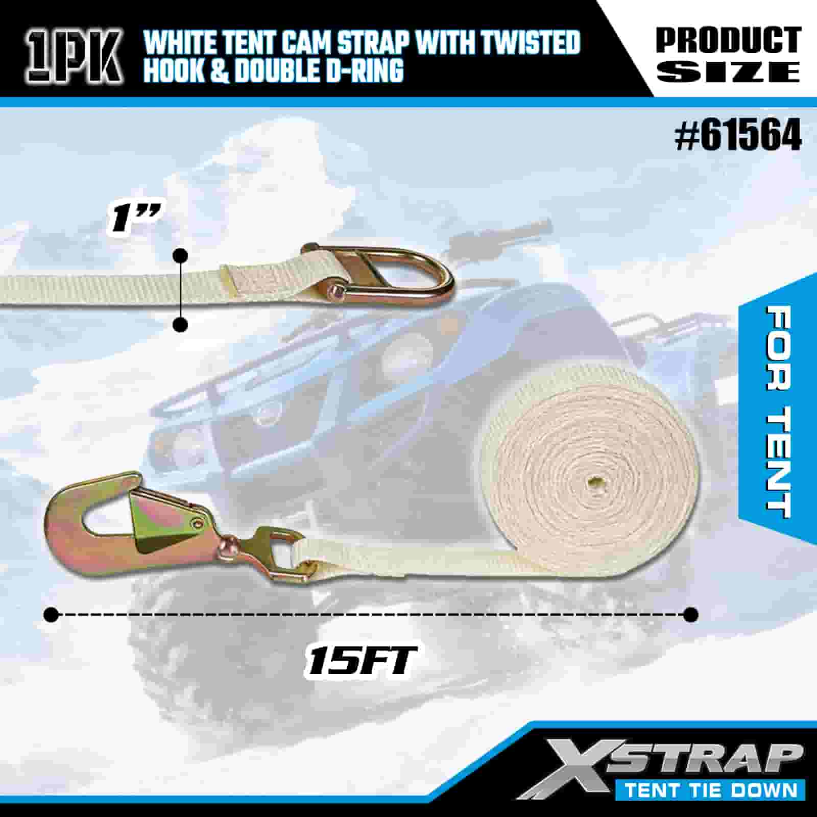 สายรัดกล้องเต็นท์สีขาว Xstrap พร้อมตะขอบิดและแหวน D คู่, สายรัดโพลีเอสเตอร์แบบผูกลงขนาด 1” x 15' สายรัดแบบวงล้อ, สายรัดยึดสายรัดสินค้าความจุ 440 ปอนด์พร้อม ตะขอบิดและแหวน D คู่ สำหรับการควบคุมสินค้า การยึดเต็นท์