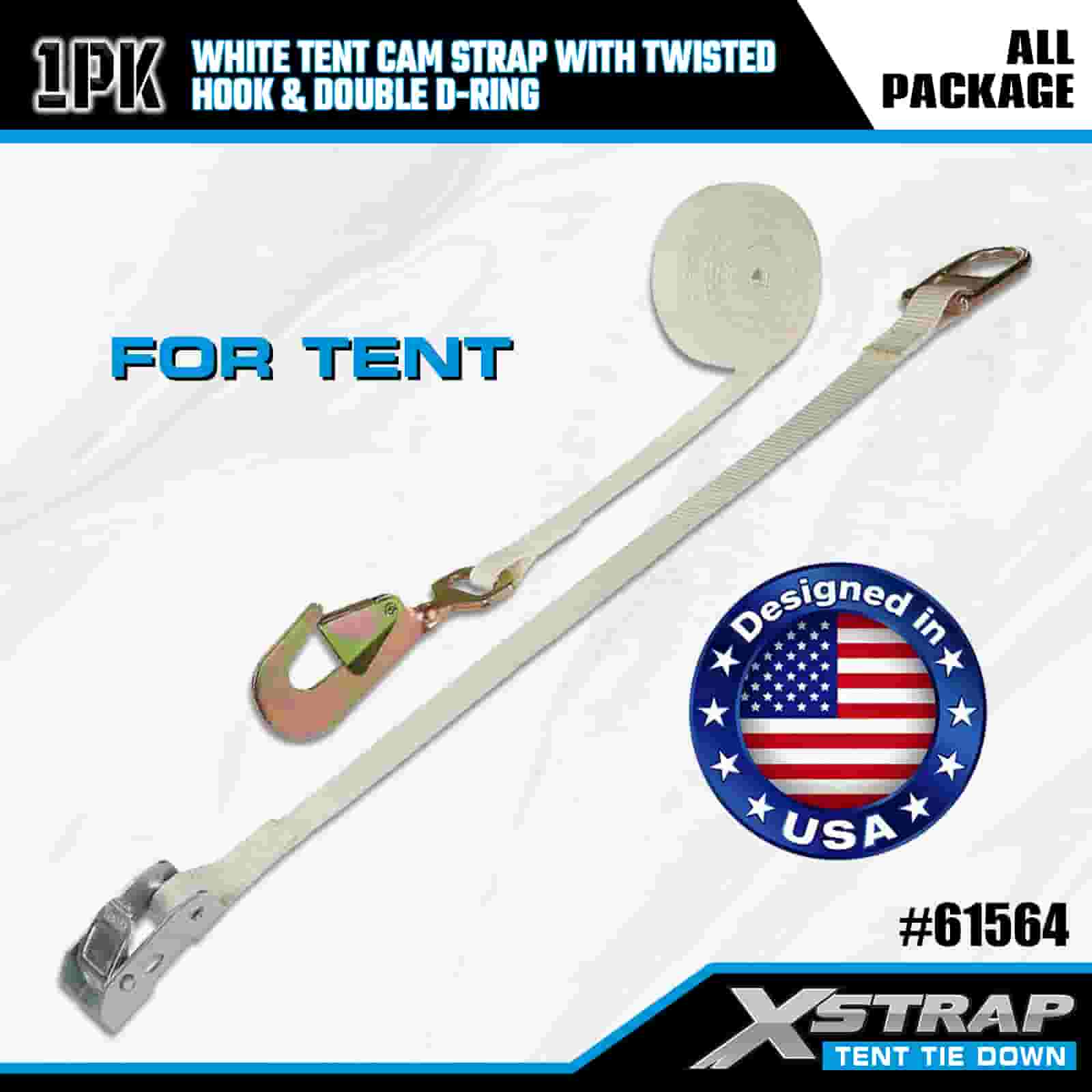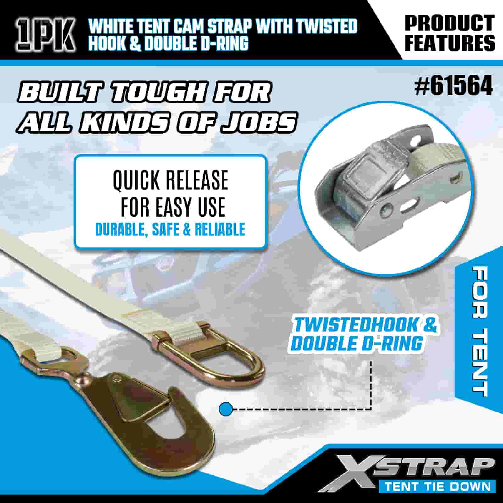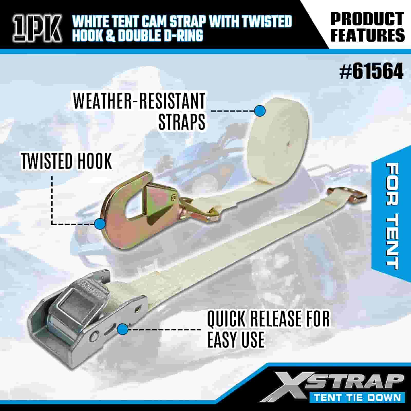 สายรัดกล้องเต็นท์สีขาว Xstrap พร้อมตะขอบิดและแหวน D คู่, สายรัดโพลีเอสเตอร์แบบผูกลงขนาด 1” x 15' สายรัดแบบวงล้อ, สายรัดยึดสายรัดสินค้าความจุ 440 ปอนด์พร้อม ตะขอบิดและแหวน D คู่ สำหรับการควบคุมสินค้า การยึดเต็นท์
