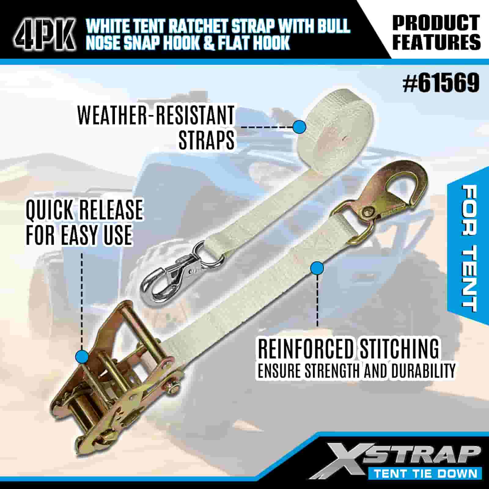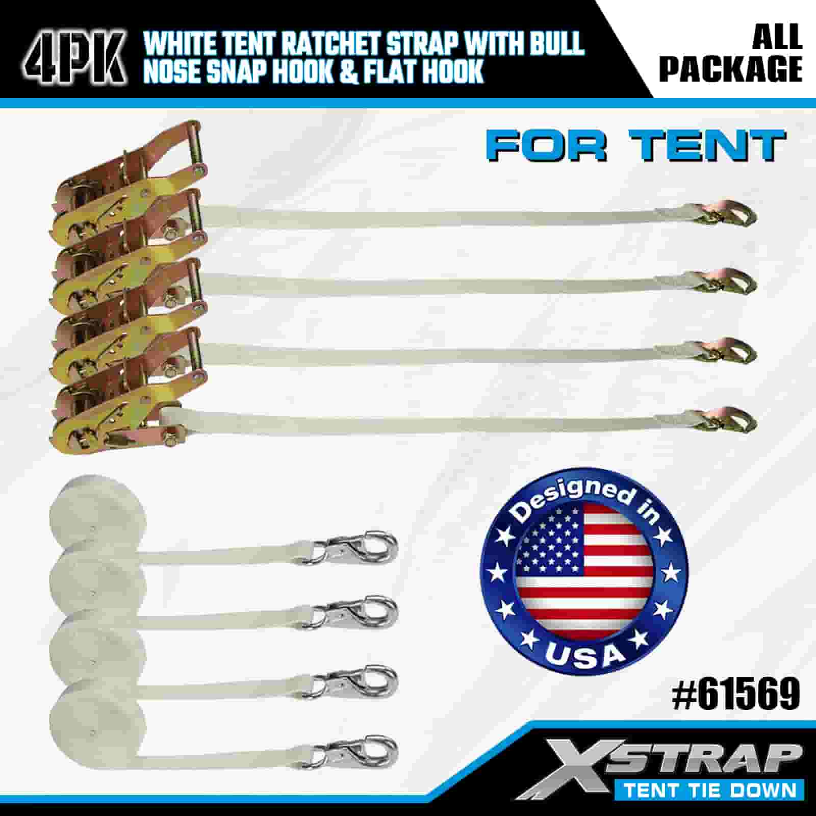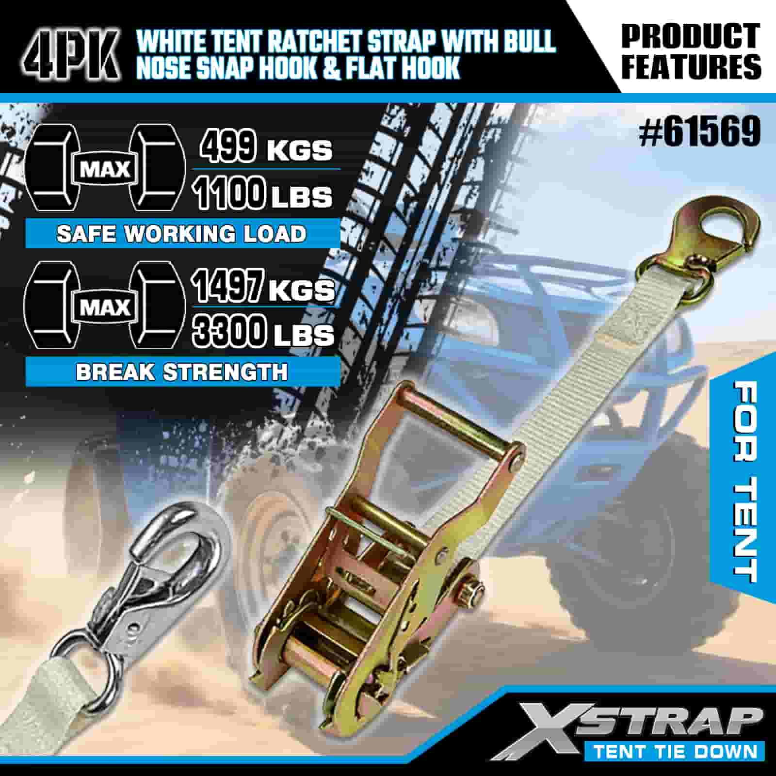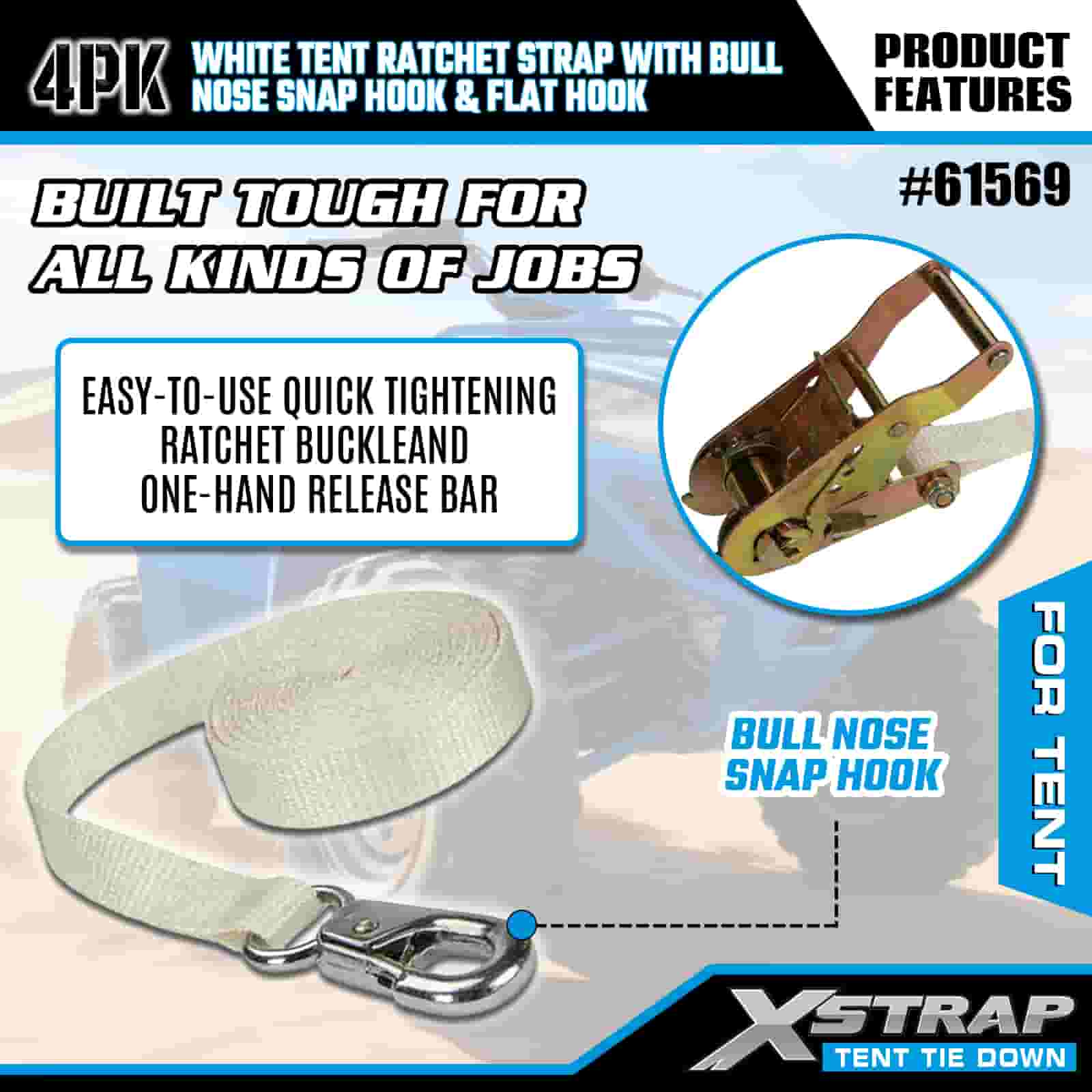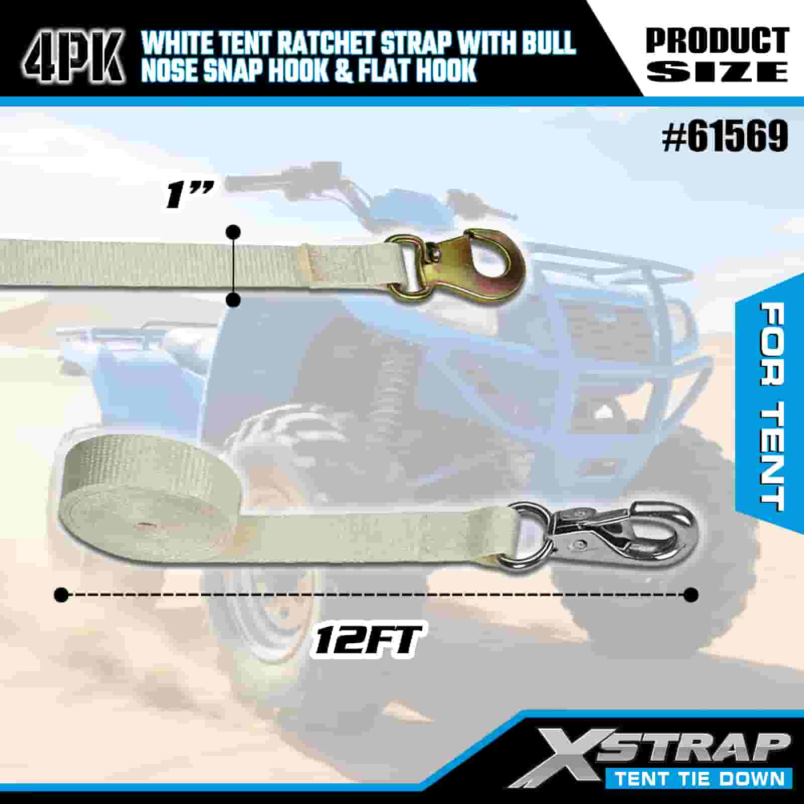 สายรัดเต็นท์ Xstrap 4PK สีขาวพร้อมตะขอเกี่ยวจมูกกระทิงและตะขอแบบแบน สายรัดโพลีเอสเตอร์แบบผูกลงขนาด 1” x 12’ สายรัดแบบเฟืองล้อความจุ 1100 ปอนด์ สายรัดยึดสายรัดสำหรับบรรทุกสินค้าพร้อมตะขอเกี่ยวจมูกและตะขอแบบแบนสำหรับการควบคุมสินค้า การยึดเต็นท์