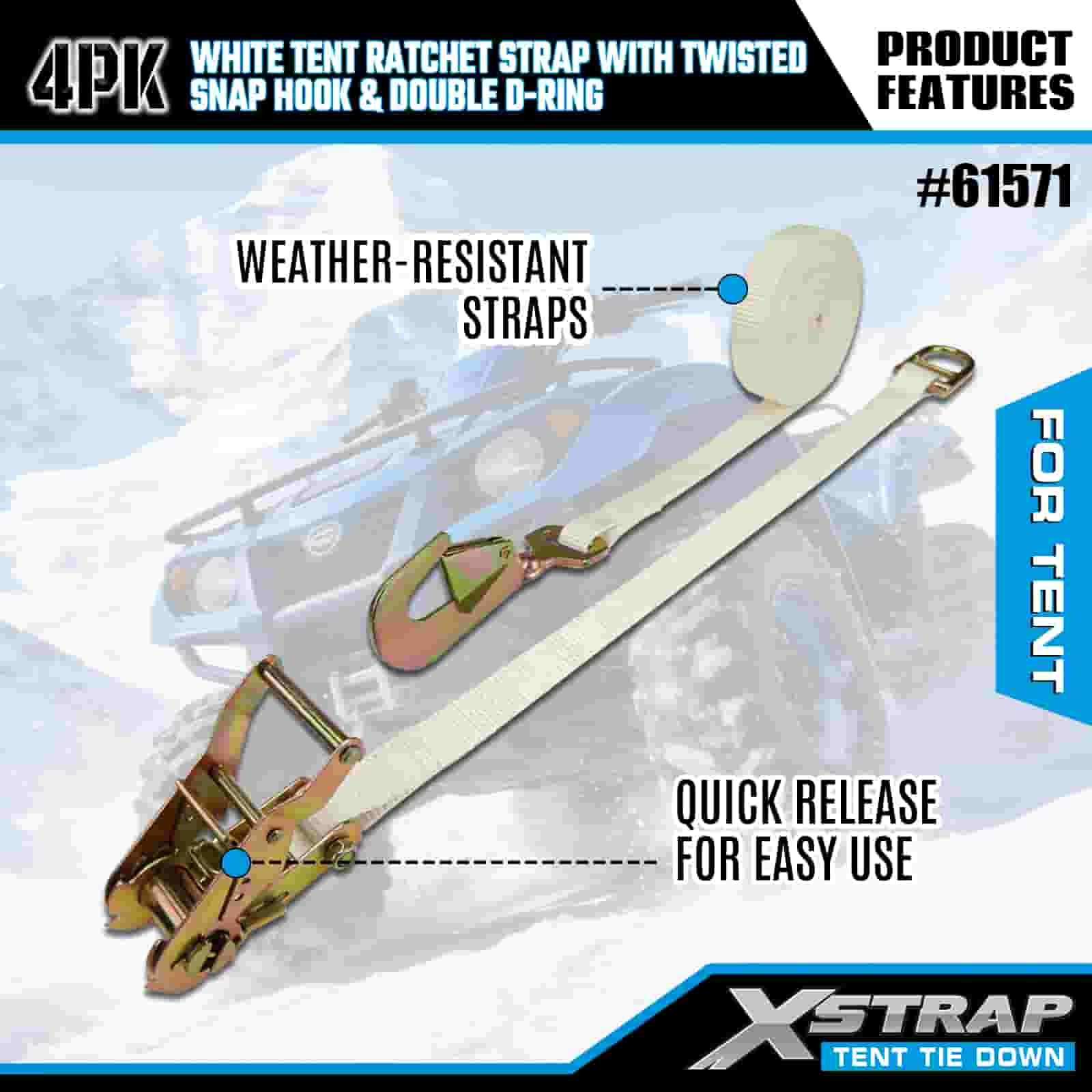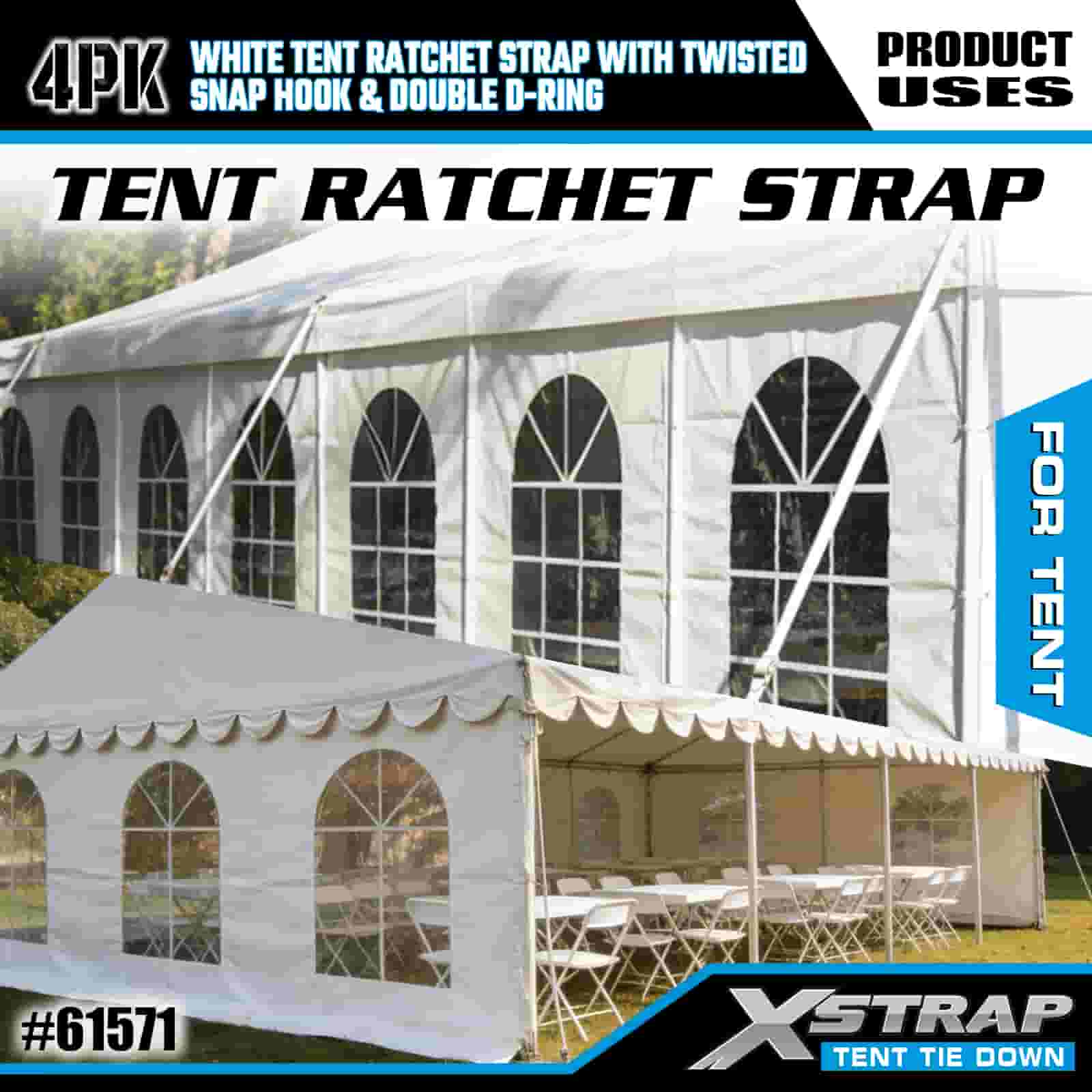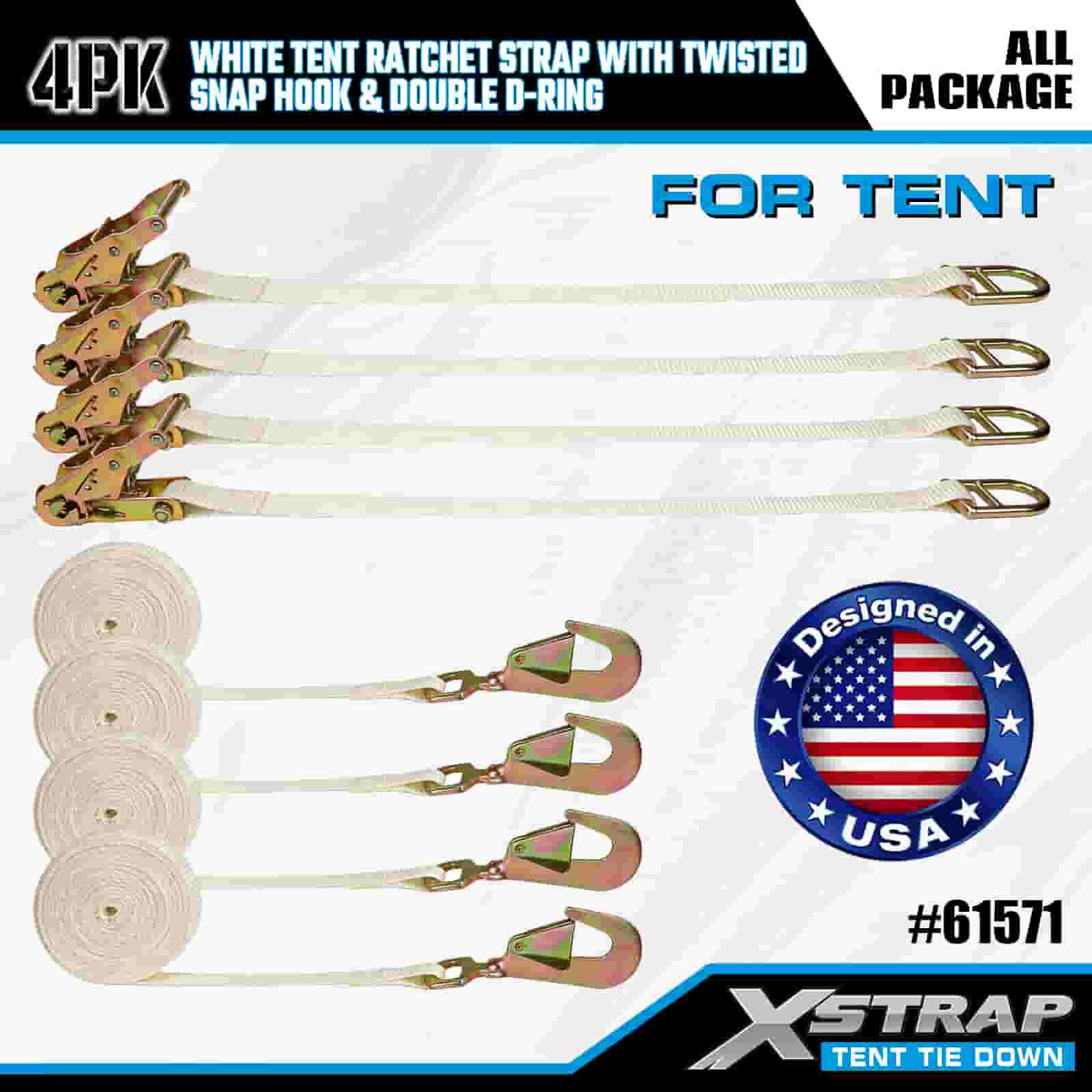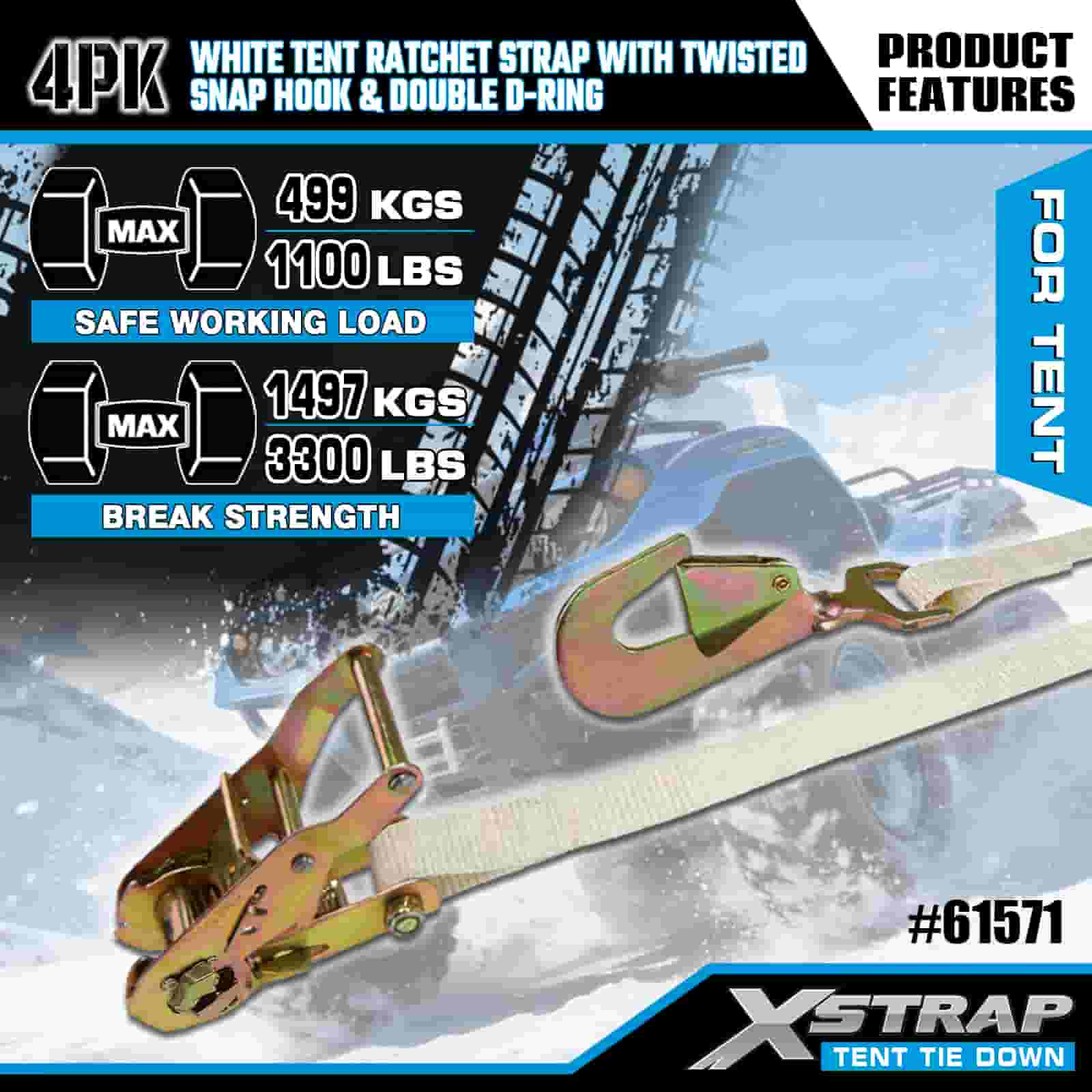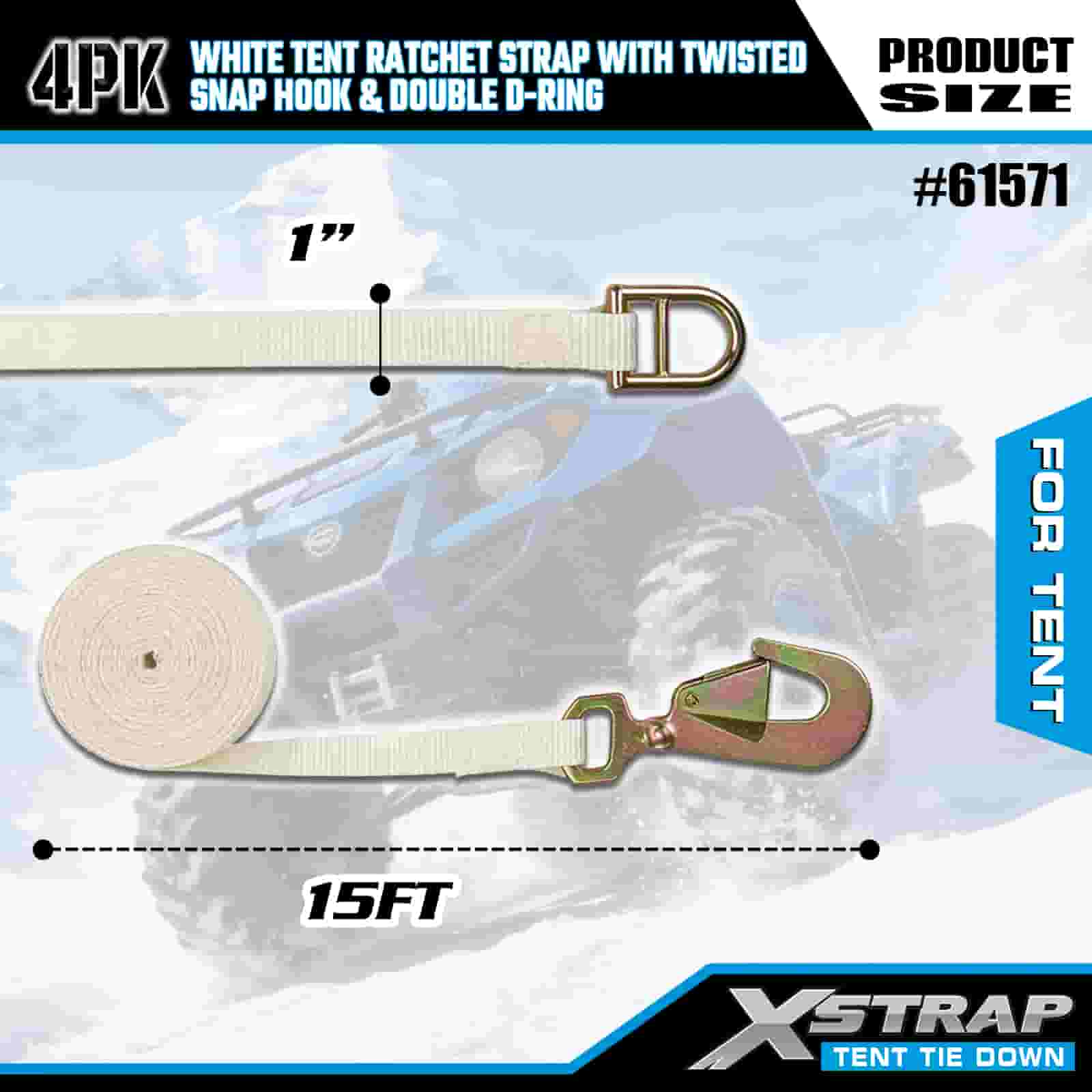 Xstrap 4PK สายรัดวงล้อเต็นท์สีขาวพร้อมตะขอเกี่ยวแบบบิดและแหวน D คู่, สายรัดโพลีเอสเตอร์แบบผูกลง 1” x 15' สายรัดแบบเฟืองล้อ, สายรัดยึดสายรัดสำหรับบรรทุกสินค้าความจุ 1100 ปอนด์พร้อมตะขอเกี่ยวแบบบิดและแหวน D คู่สำหรับการควบคุมสินค้า การยึดเต็นท์