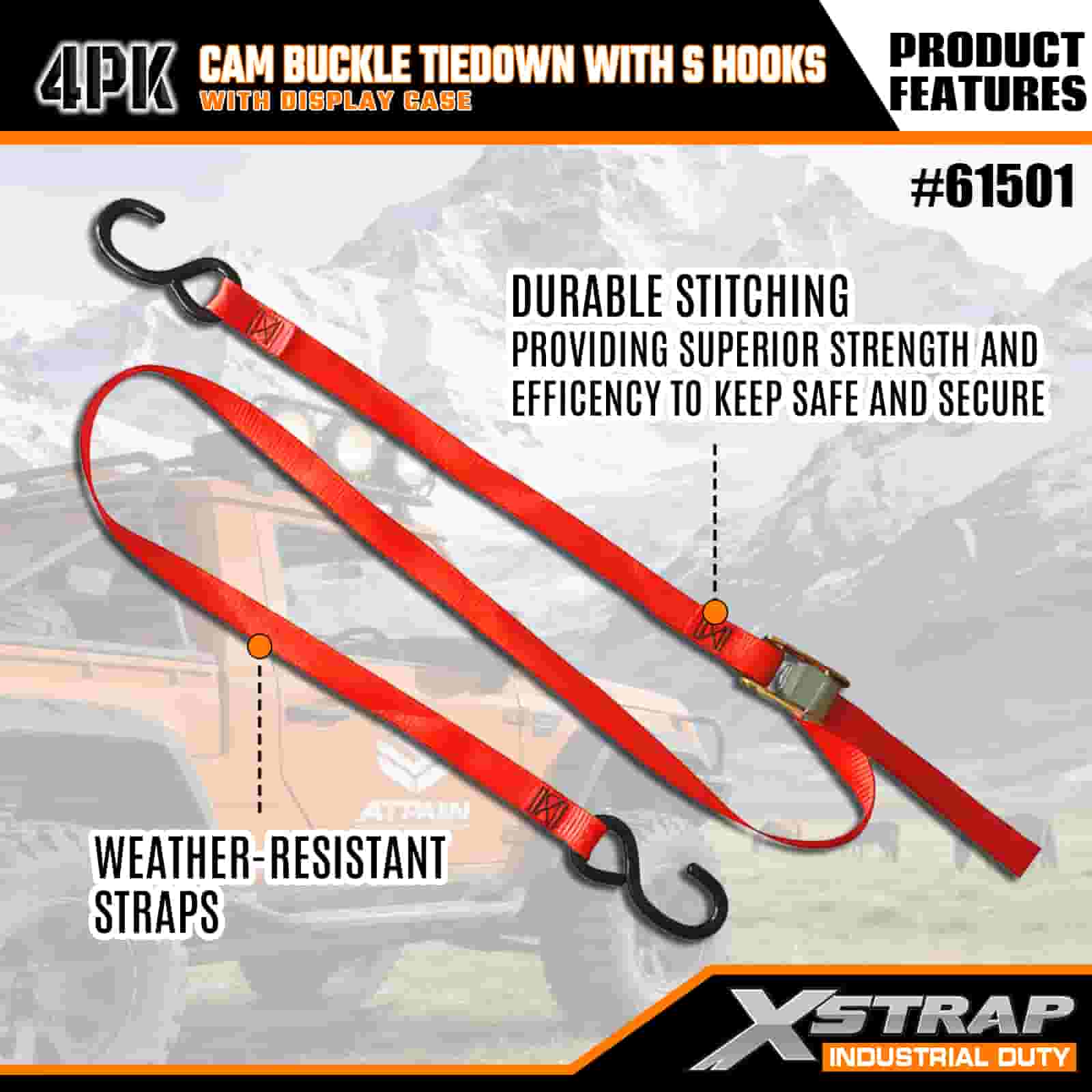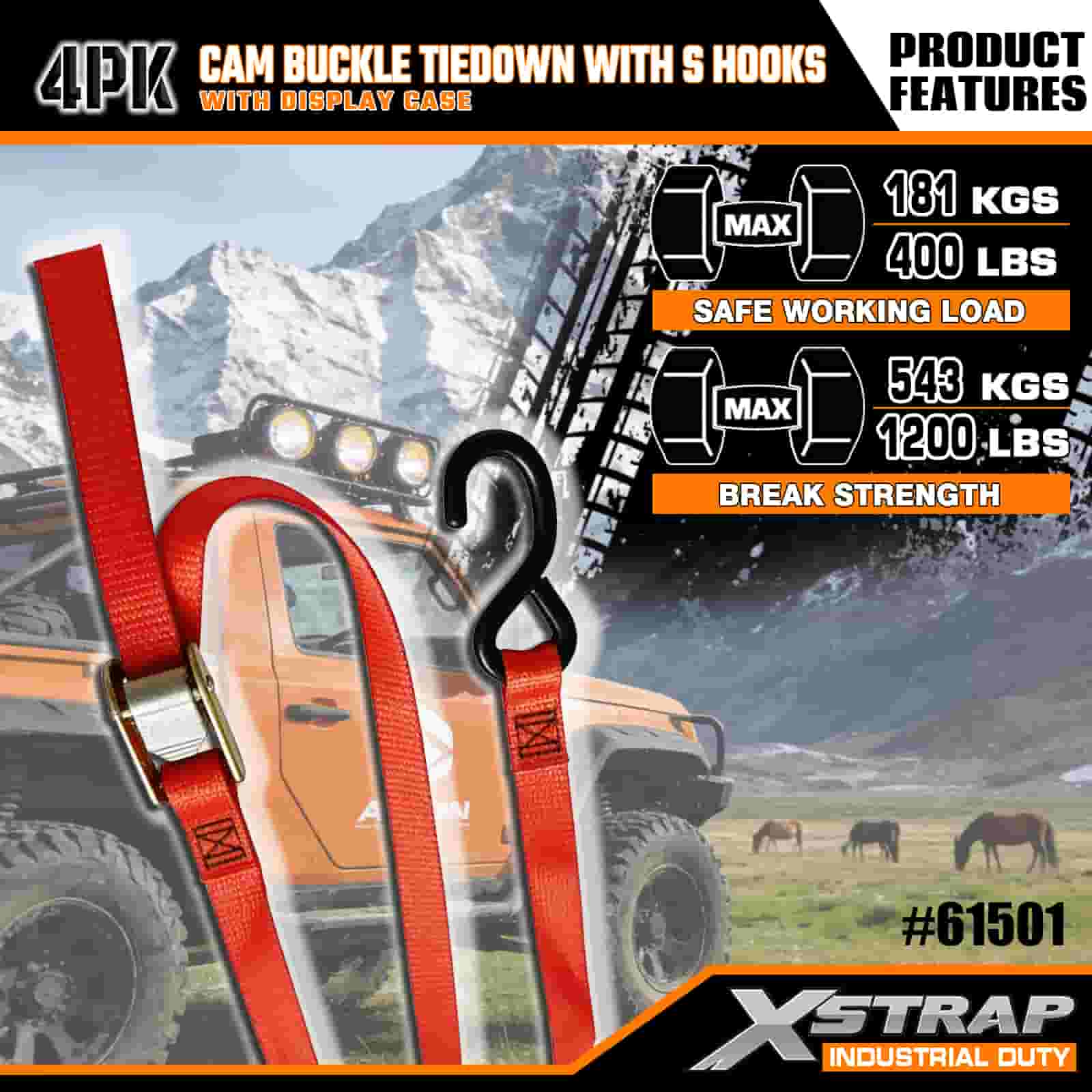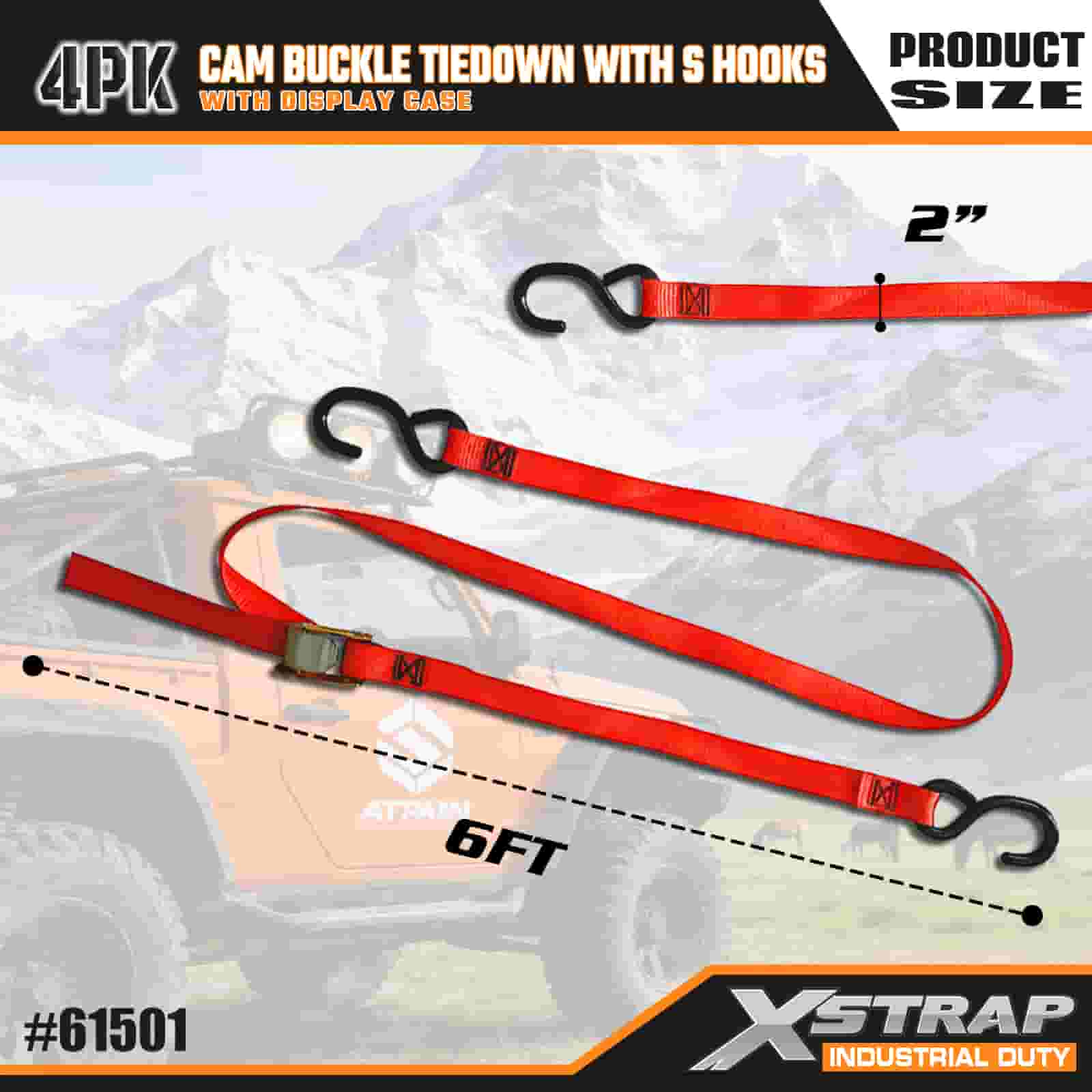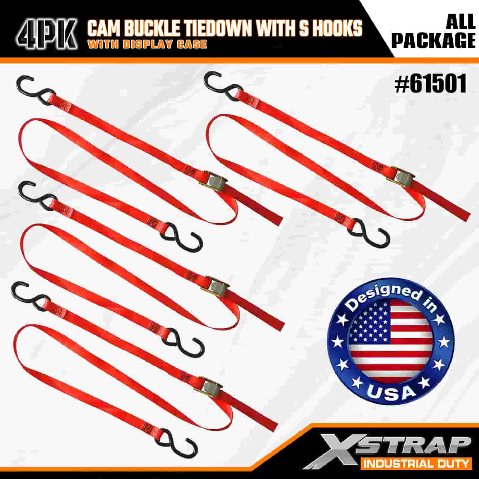 Xstrap 4 Pack Cam Buckle Tie Down พร้อมตะขอ S, สายรัดโพลีเอสเตอร์ 2” x 6' พร้อมหัวเข็มขัด Cam, สายรัดยึดสินค้าความจุ 400 ปอนด์พร้อมตะขอ S สำหรับมืออาชีพที่จริงจังในการรักษาความปลอดภัยของรถพ่วงบรรทุกสินค้า, รถพ่วงพื้นเรียบ, เรือสกี, รถยนต์ขนาดเล็ก