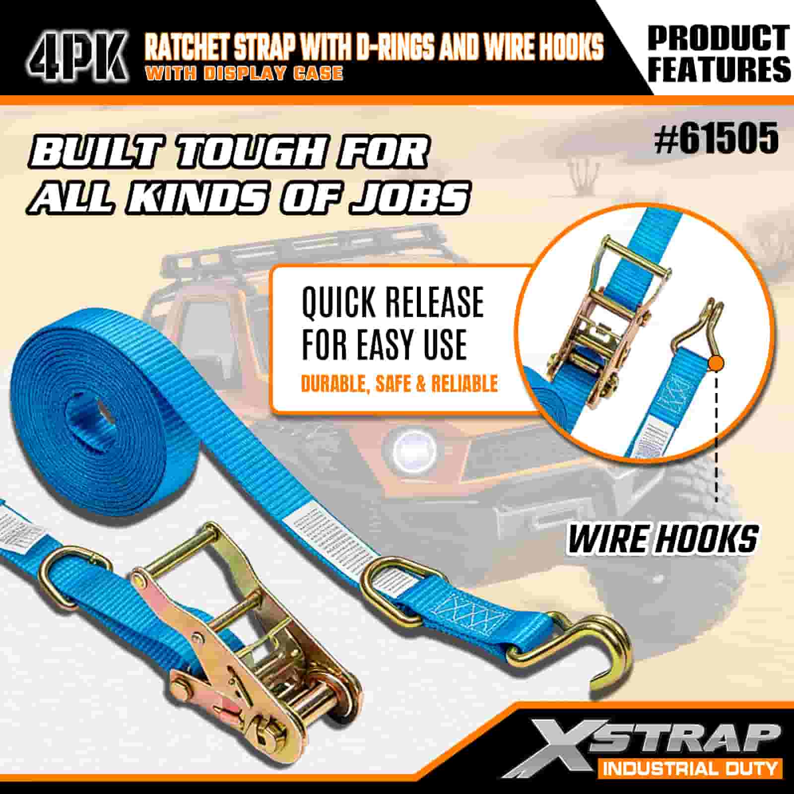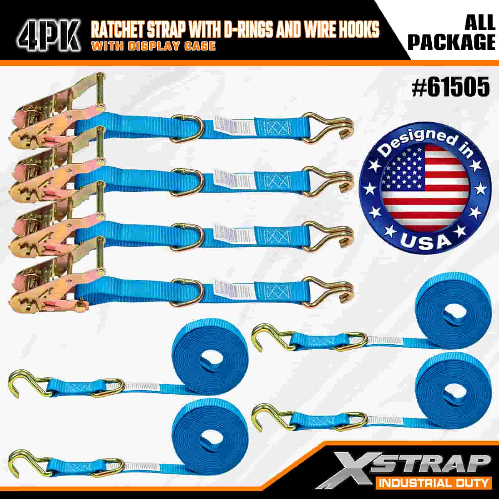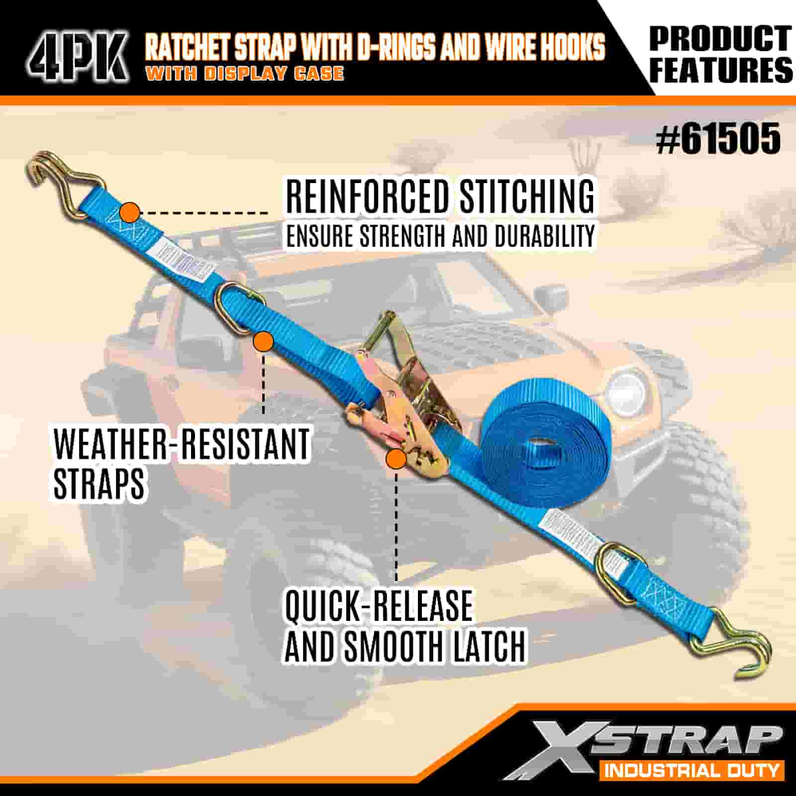 Xstrap 4 Pack Cam Buckle Tie Down พร้อมห่วง D-Ring และตะขอลวด, สายรัดโพลีเอสเตอร์แบบดึงลงขนาด 1” x 15' สายรัดแบบดึงวงล้อ, สายรัดยึดสายรัดสินค้าความจุ 400 ปอนด์พร้อมตะขอลวดสำหรับมืออาชีพที่จริงจังในการรักษาความปลอดภัยของรถพ่วงบรรทุกสินค้า, รถพ่วงเตียงเรียบ, เรือสกี, รถยนต์ขนาดเล็ก