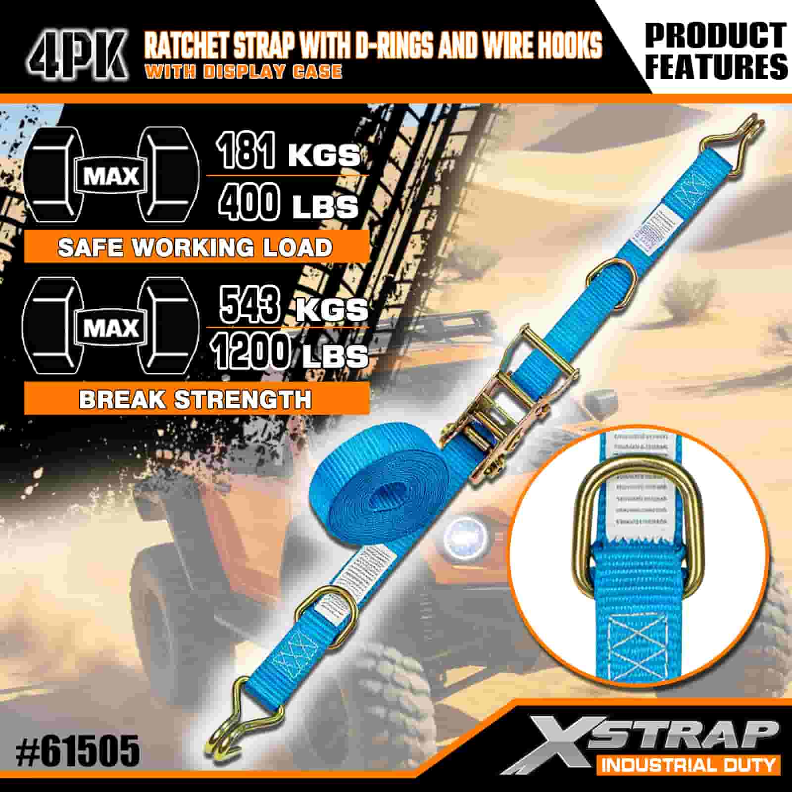- เครื่องหมายโหลดเพื่อความปลอดภัยที่ชัดเจน: สายรัดแต่ละเส้นมีป้ายกำกับชัดเจนด้วยน้ำหนักการทำงานที่ปลอดภัย 181 KGS/400 LBS และความต้านทานการแตกหัก 543 KGS/1200 LBS ให้แนวทางด้านความปลอดภัยที่ชัดเจนเพื่อการใช้งานที่เหมาะสมและปลอดภัย