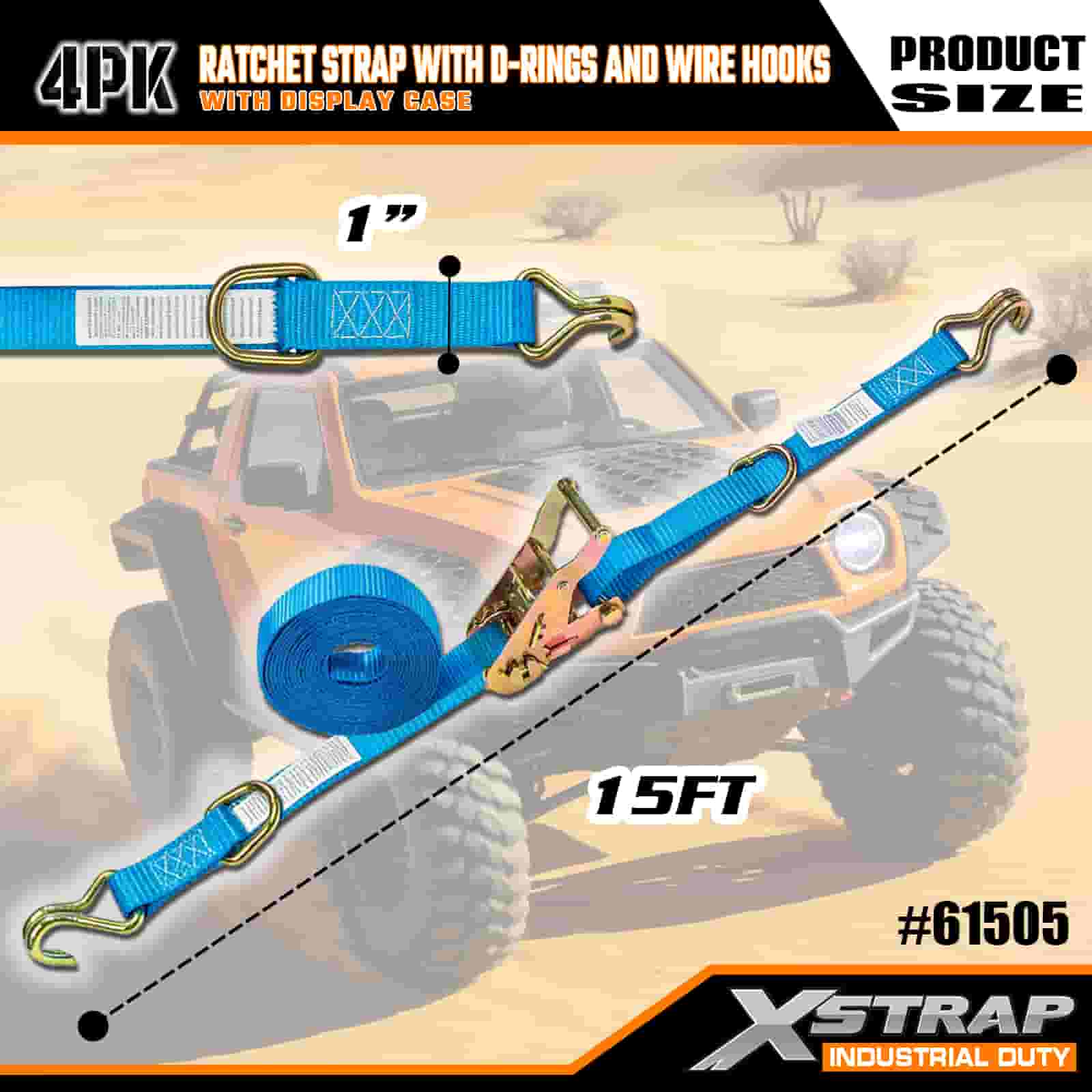 สายรัดวงล้อ 4PK ขนาด 1” x 15’ พร้อมห่วงรูปตัว D และตะขอลวด