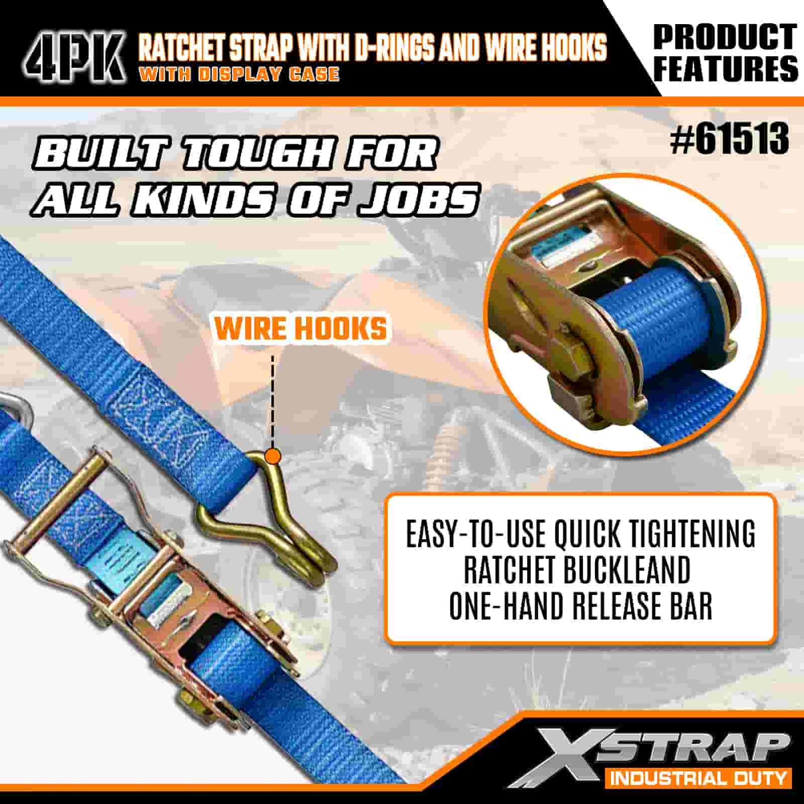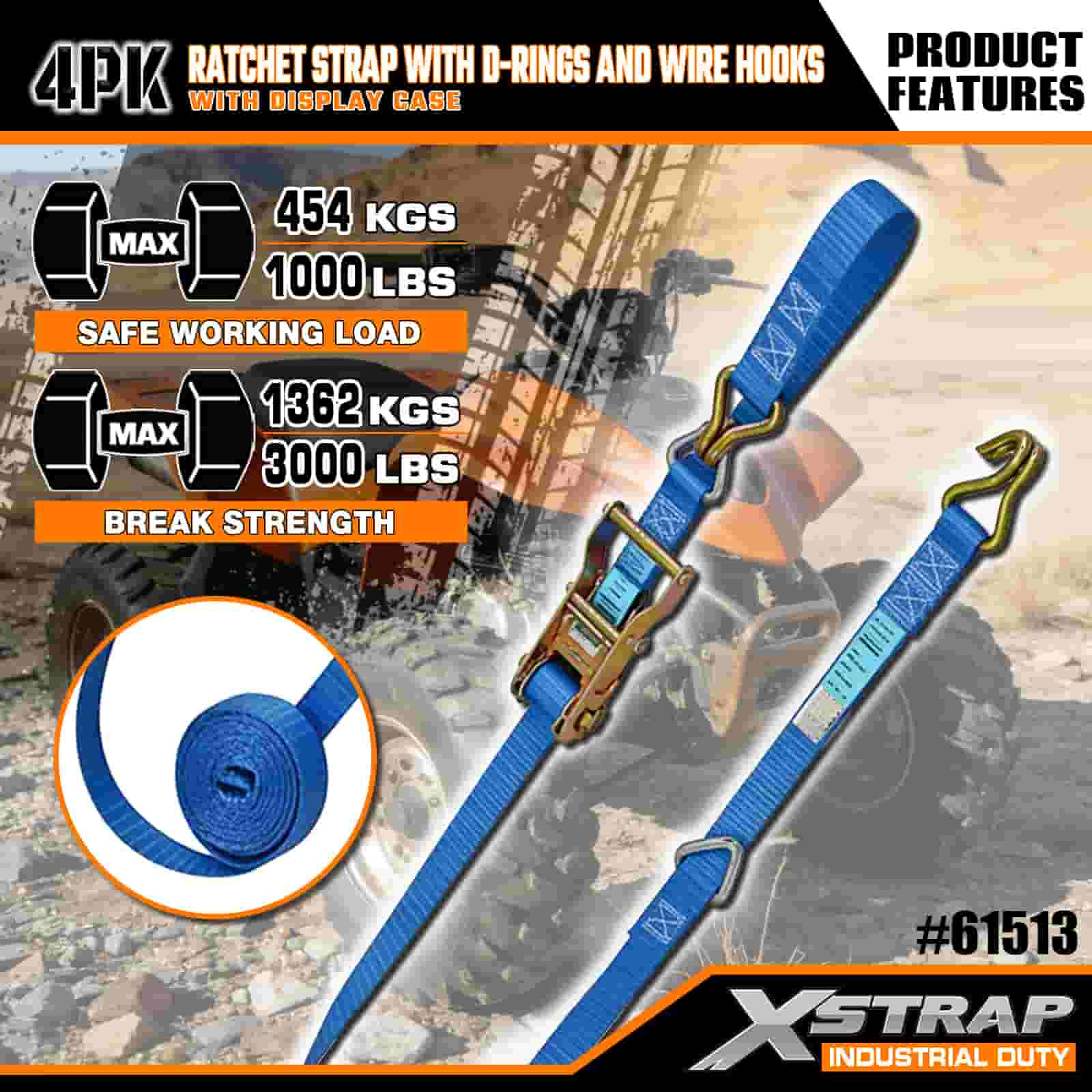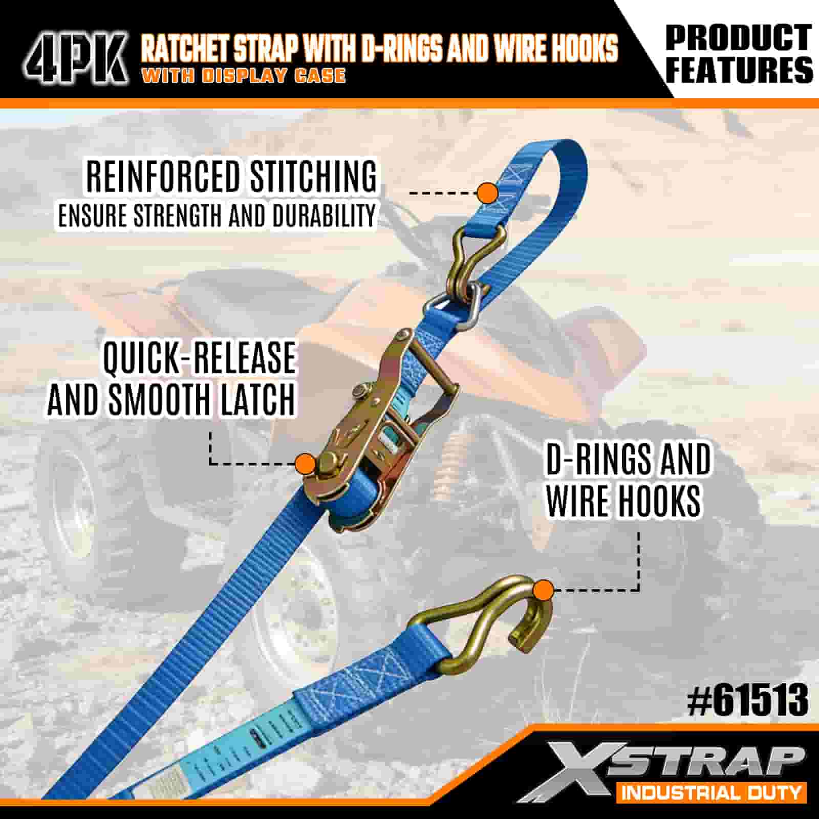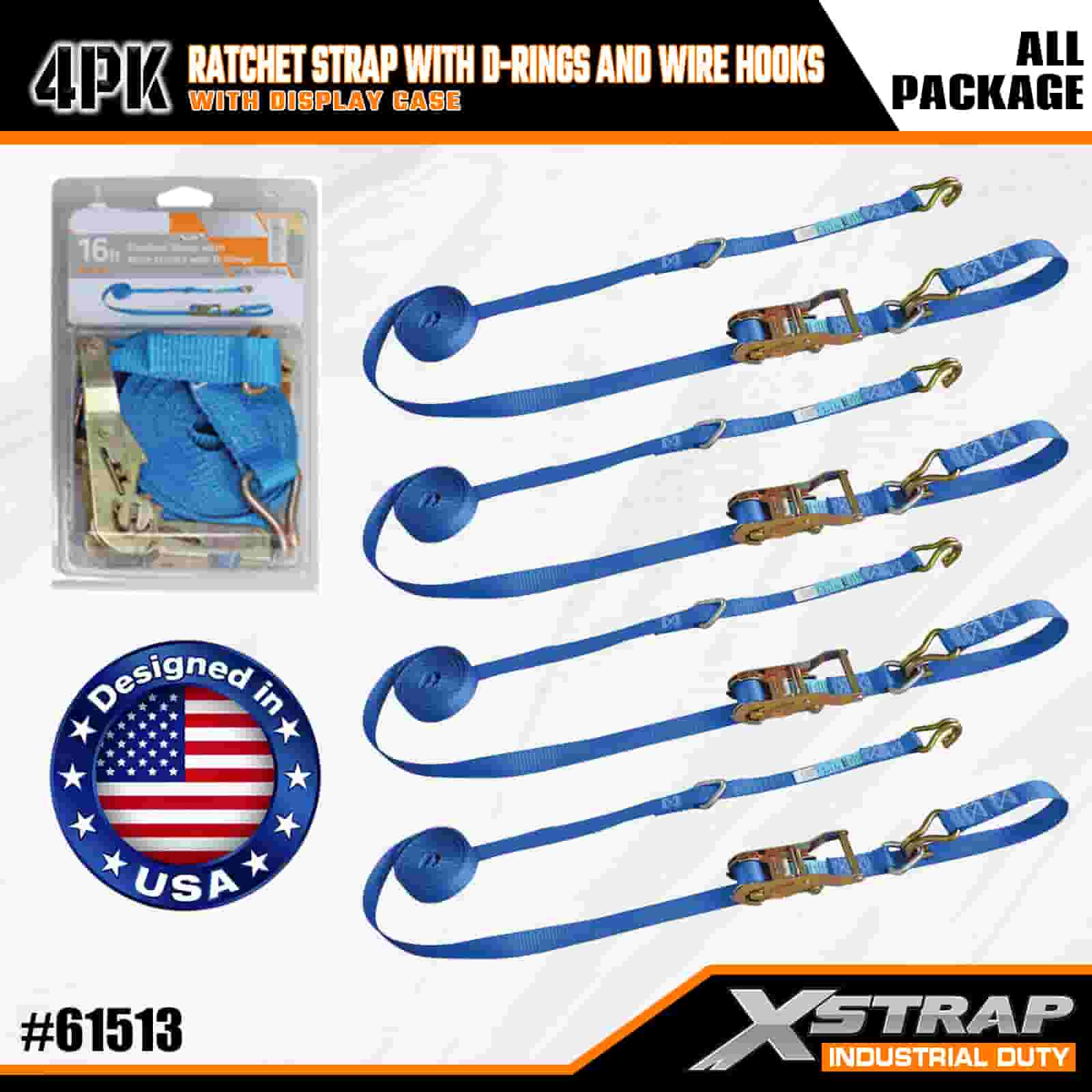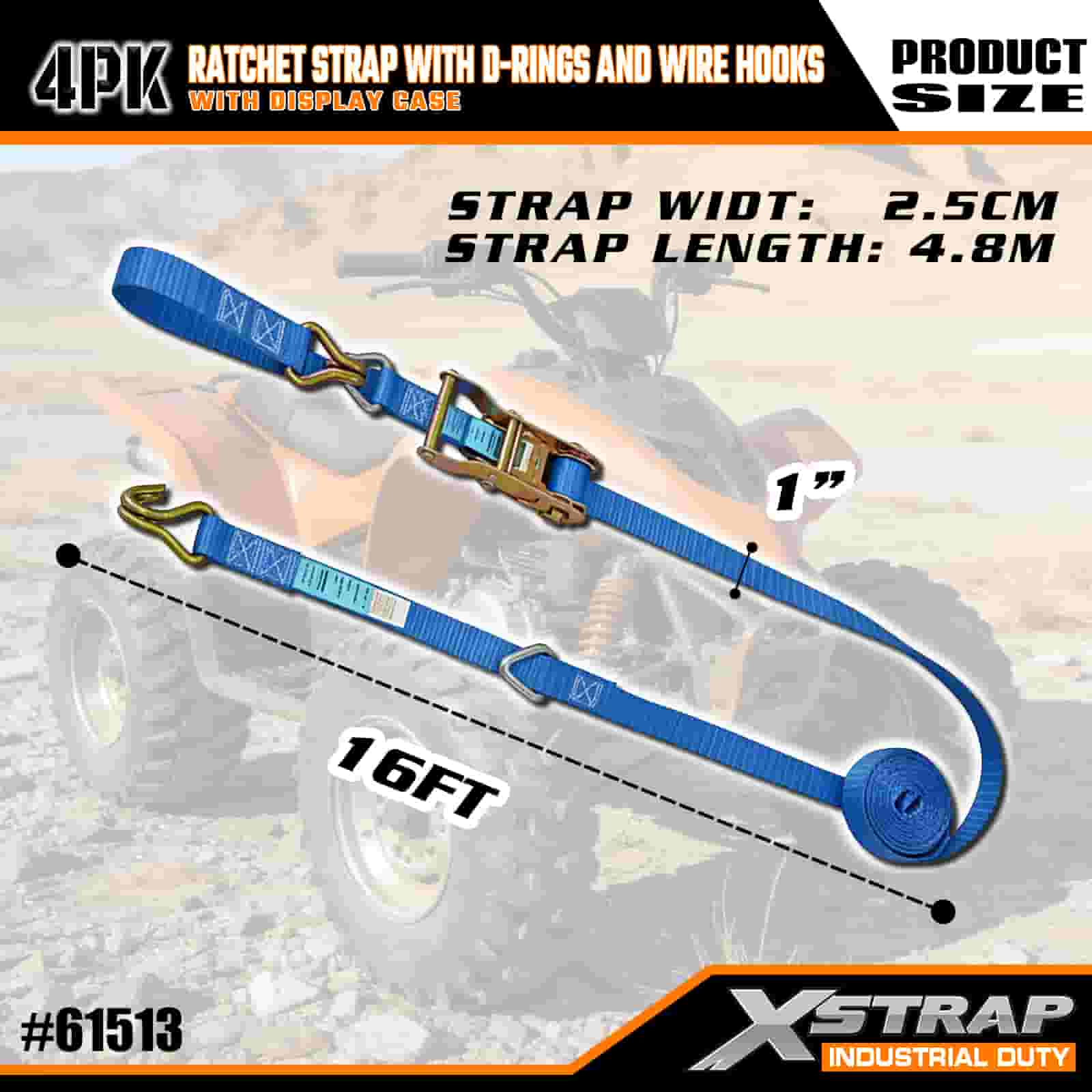 สายรัดวงล้อ Xstrap 4 แพ็คพร้อมห่วง D และตะขอลวด, สายรัดโพลีเอสเตอร์แบบดึงลงขนาด 1” x 16’ สายรัดแบบวงล้อดึง, สายรัดยึดสายรัดบรรทุกสินค้าความจุ 1,000 ปอนด์พร้อมตะขอลวดสำหรับมืออาชีพที่จริงจังในการรักษาความปลอดภัยของรถพ่วงบรรทุกสินค้า, รถพ่วงพื้นเรียบ, เรือสกี, รถยนต์ขนาดเล็ก