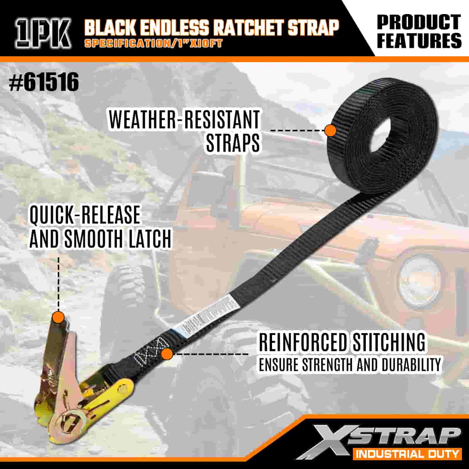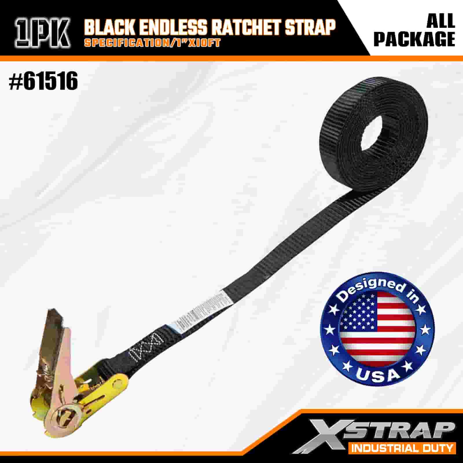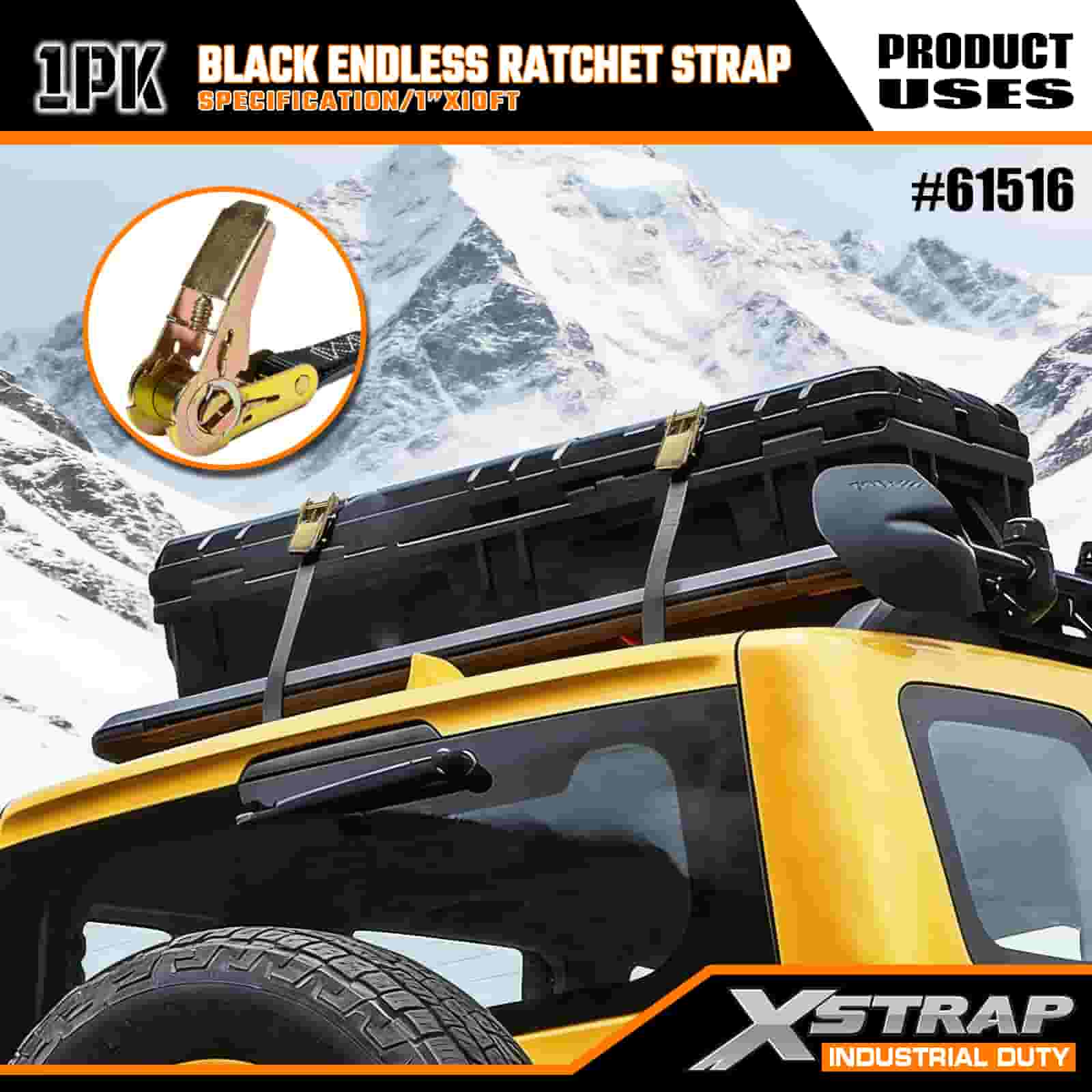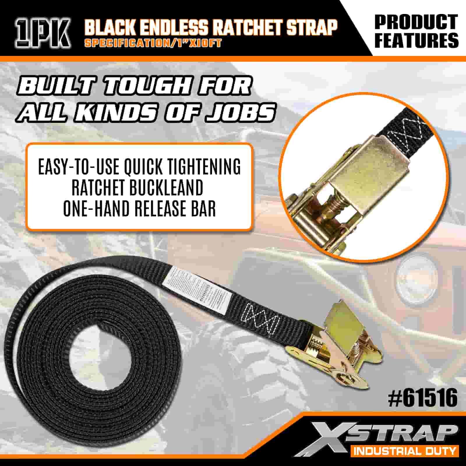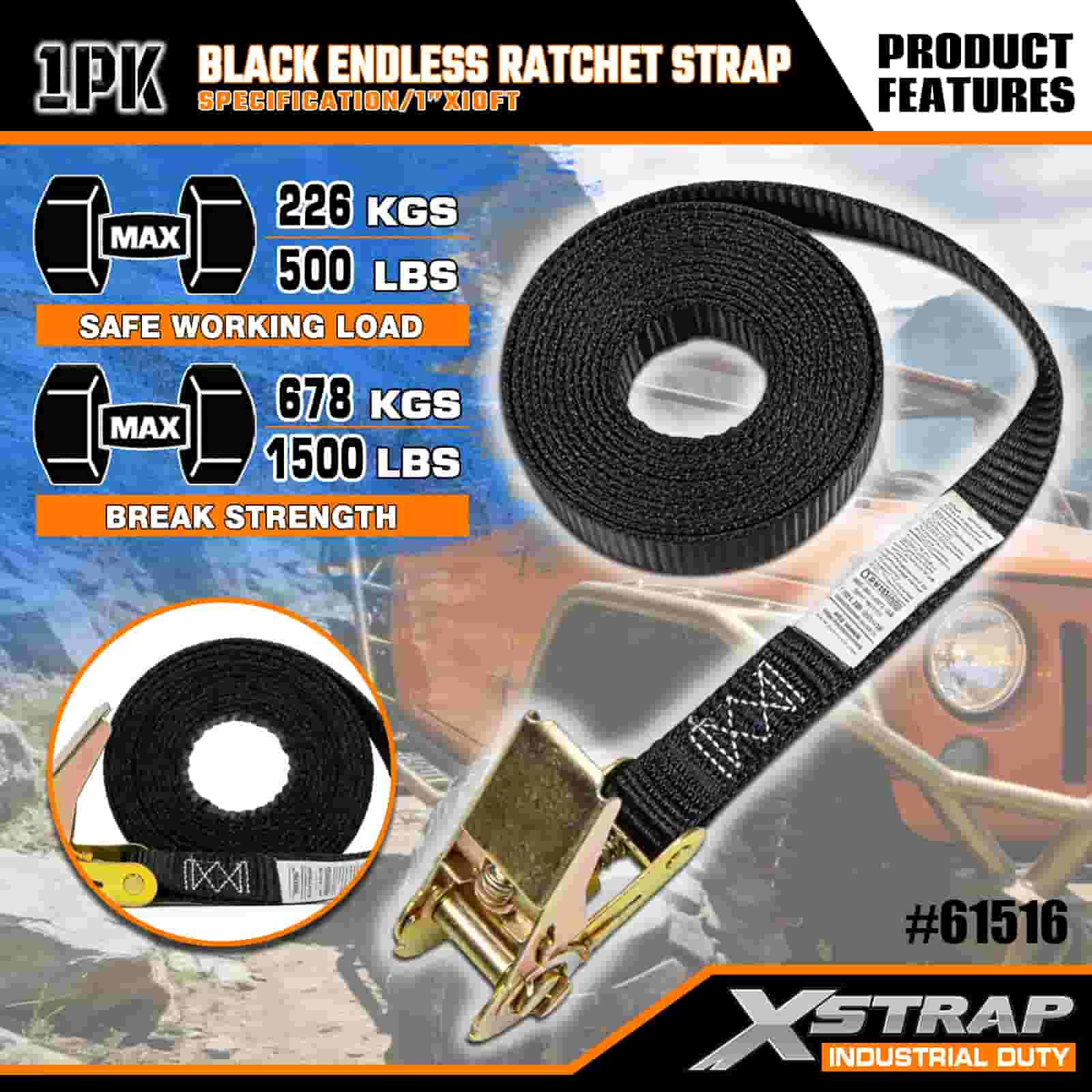 Xstrap สายรัดวงล้อไม่มีที่สิ้นสุดสีดำ, สายรัดโพลีเอสเตอร์แบบผูกลงขนาด 1” x 10' สายรัดแบบดึงสายรัด, การเฆี่ยนสินค้าด้วยความจุ 500 ปอนด์ สายรัดเพื่อความปลอดภัยสำหรับมืออาชีพที่จริงจังในการรักษาความปลอดภัยของรถพ่วงบรรทุกสินค้า, รถพ่วงพื้นเรียบ, เรือสกี, รถยนต์ขนาดเล็ก
