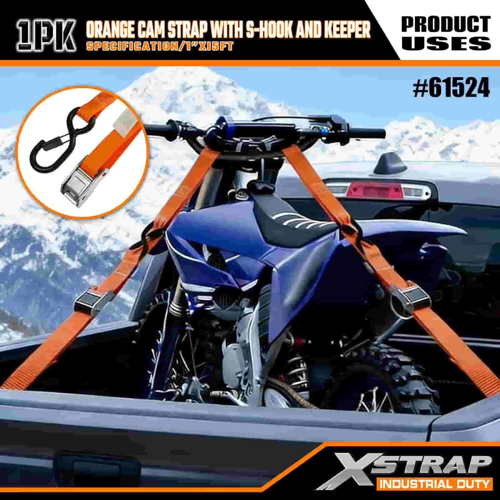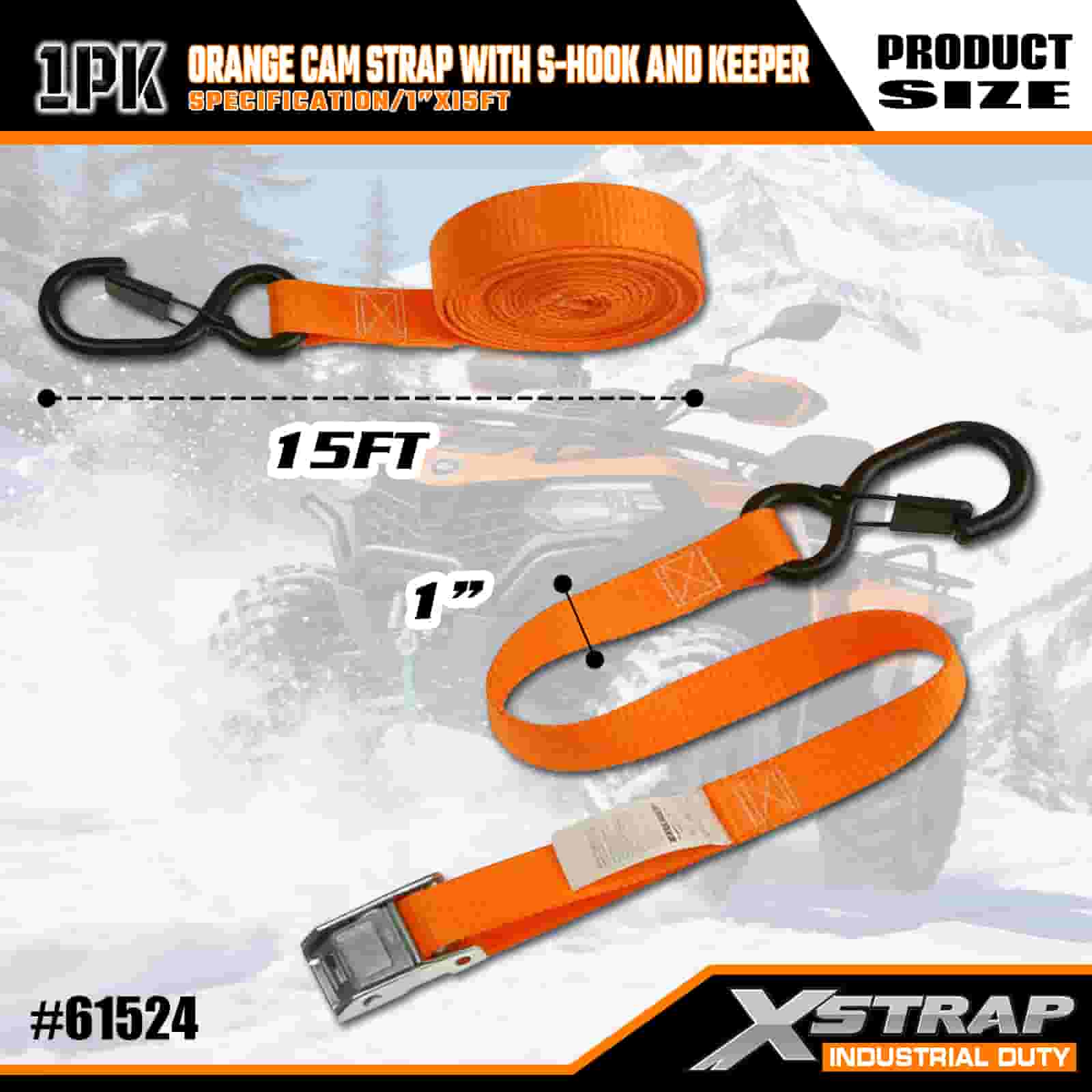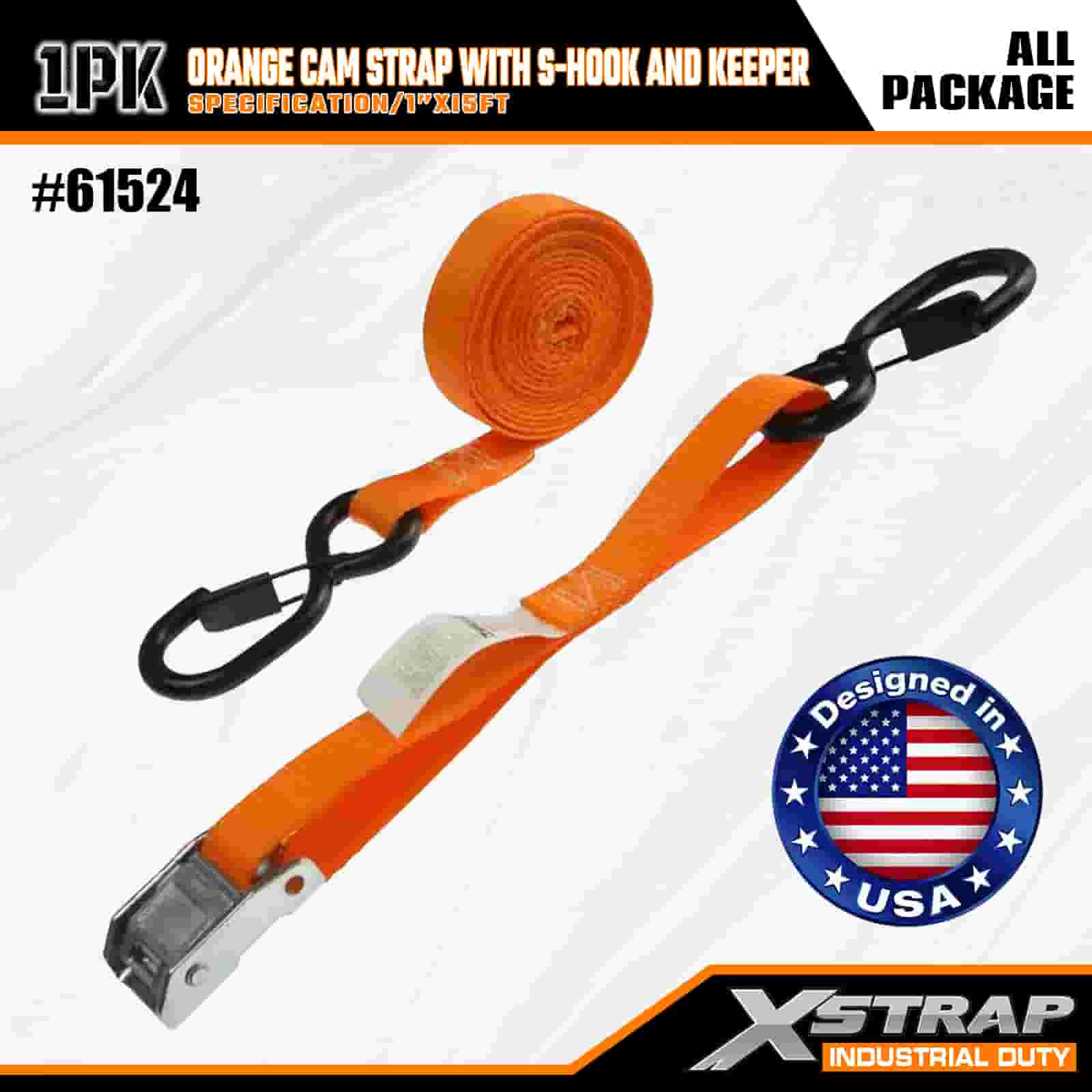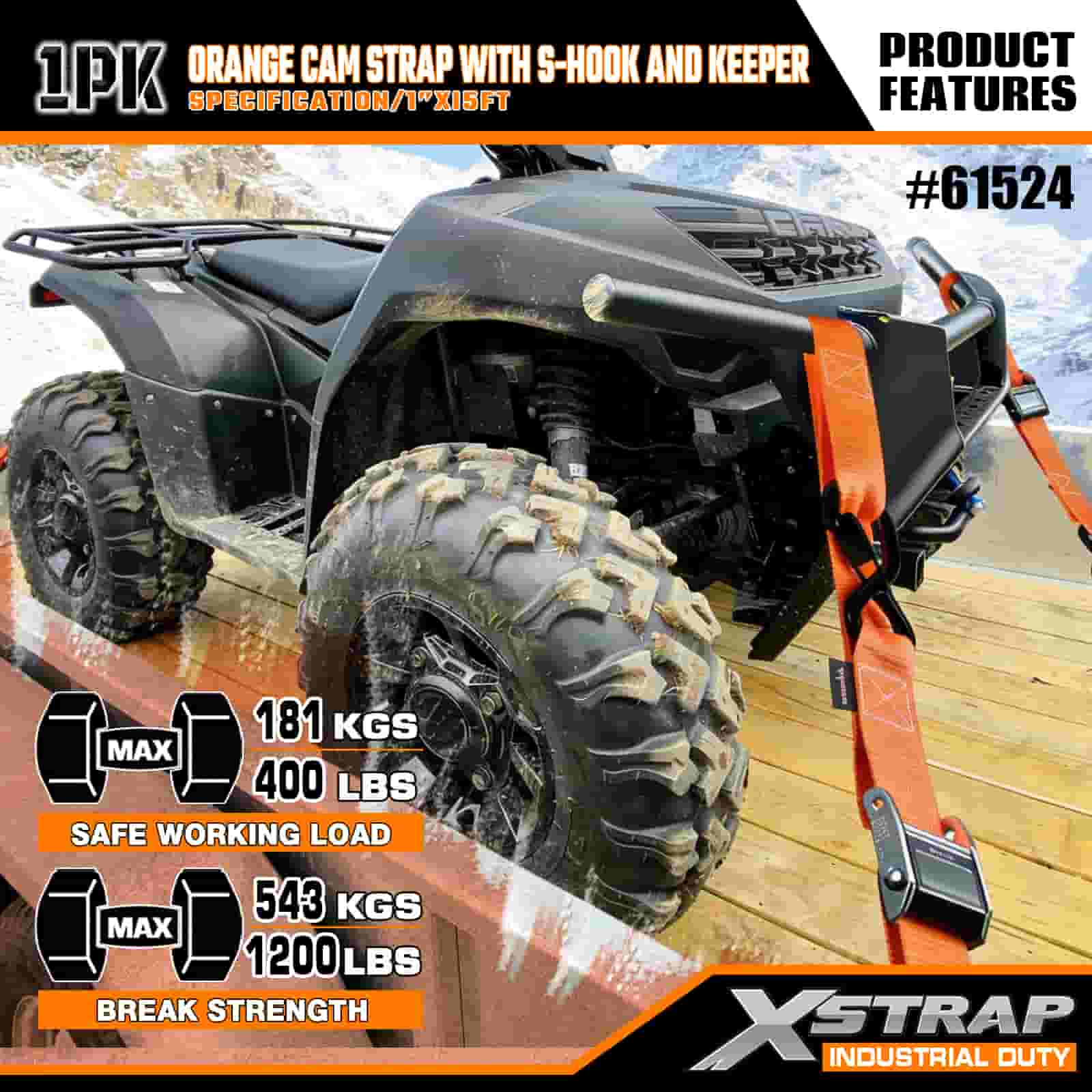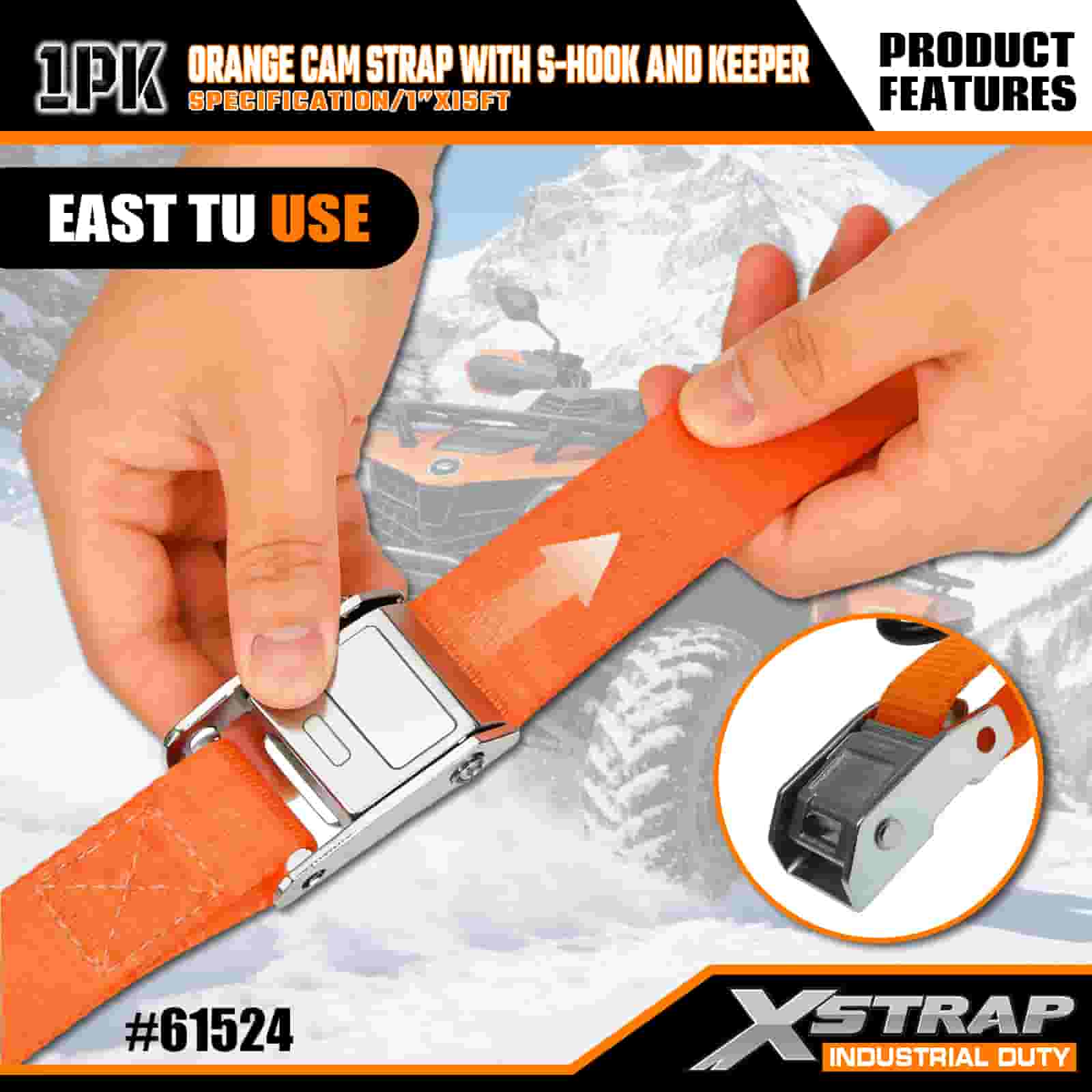 สายรัด Xstrap Qrange Cam พร้อมตะขอรูปตัว S และตัวรักษา, สายรัดโพลีเอสเตอร์แบบดึงลงขนาด 1” x 15’ สายรัดแบบวงล้อดึง, สายรัดยึดสายรัดสำหรับบรรทุกสินค้าความจุ 400 ปอนด์พร้อมตะขอรูปตัว S เพื่อความปลอดภัยสำหรับมืออาชีพที่จริงจังในการรักษาความปลอดภัยของรถพ่วงบรรทุกสินค้า, รถพ่วงพื้นเรียบ, เรือสกี, รถยนต์ขนาดเล็ก