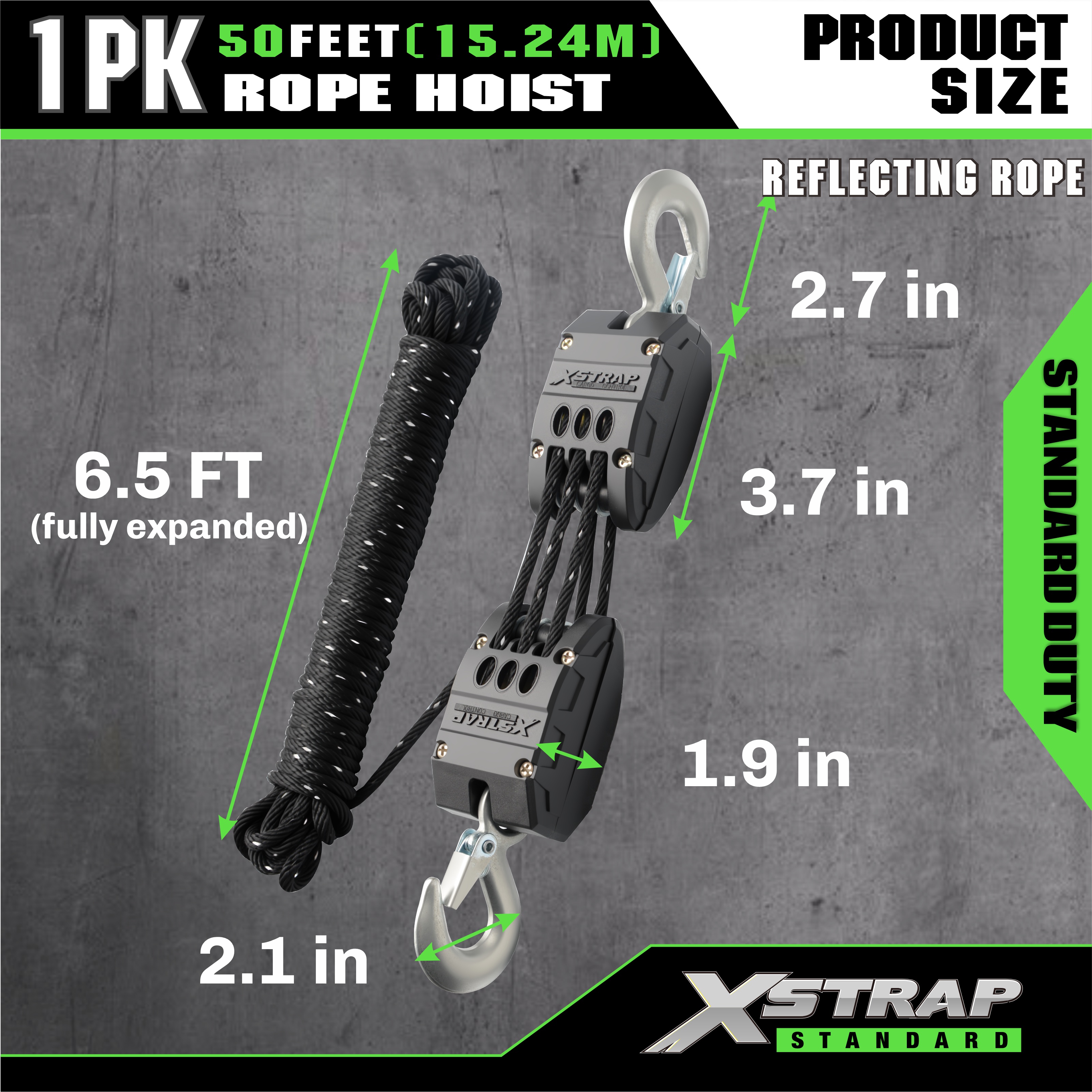นี่คือรอกสลิงสะท้อนแสง XSTRAP STANDARD Heavy-Duty 2,000LB มันถูกออกแบบให้มีระบบบล็อกล้อและแท็กเกิลขนาด 50 ฟุต และในชุดนี้ยังมีห่วงแบบนุ่มขนาด 18 นิ้ว 2 ชุด และถุงมือทำงาน 1 คู่