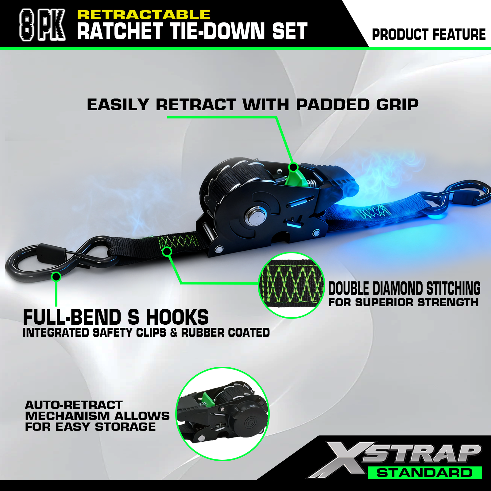 - สายรัดวงล้อแบบดึงกลับอัตโนมัติ - คุณสามารถดึงสายรัดกลับได้อย่างง่ายดายเพียงกดปุ่ม มันใช้งานง่ายมากและช่วยคุณประหยัดเวลาได้มาก