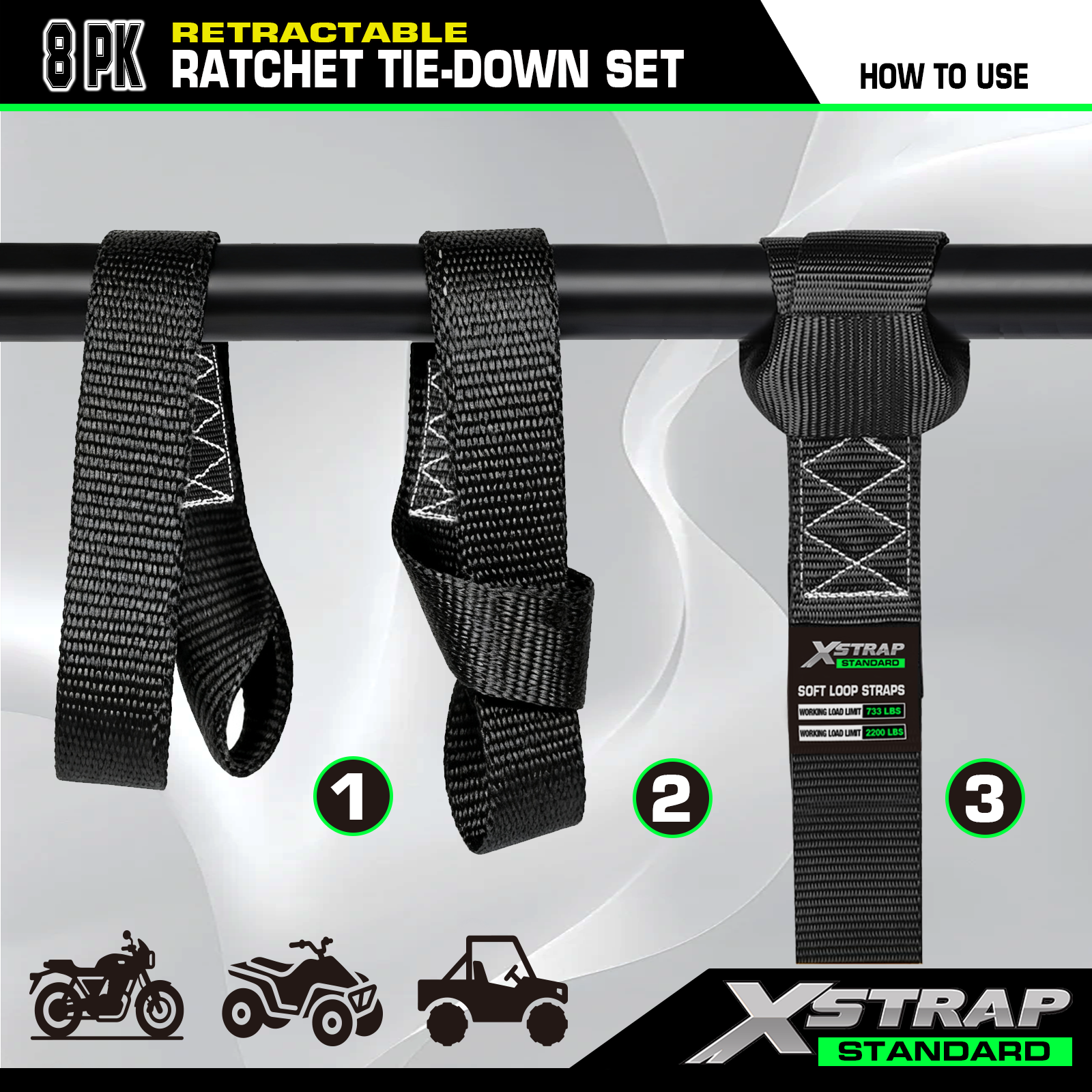 - สายรัดยึดวงล้อแบบยืดหดได้คุณภาพสูง - โหลดการทำงานคือ 500 ปอนด์ และโหลดที่จำกัดคือ 1,500 ปอนด์ สายรัดจะได้รับการทดสอบก่อนที่จะส่งออก ดังนั้นเราจึงสามารถมั่นใจได้ว่าสินค้าของคุณมีความปลอดภัยในระหว่างการขนส่ง