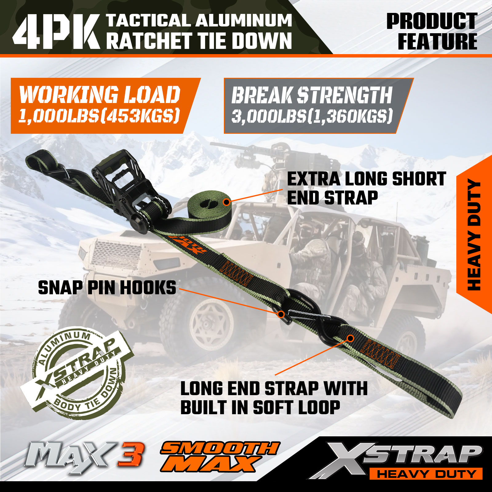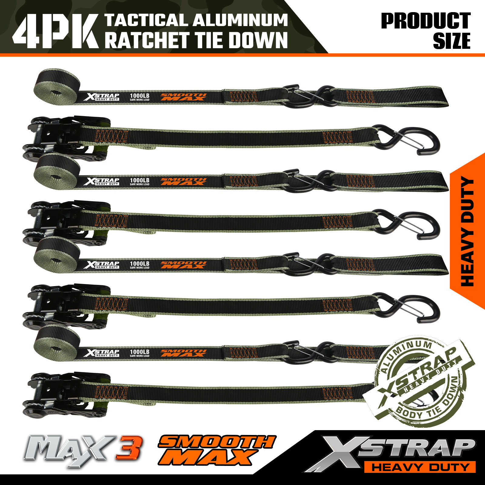 Xstrap Tactical Ratchet Tie Down คือ 1.25 นิ้ว x 12 ฟุต โหลดงานที่ปลอดภัยคือ 1,000 ปอนด์ และความแข็งแกร่งในการแตกหักคือ 3,000 ปอนด์
