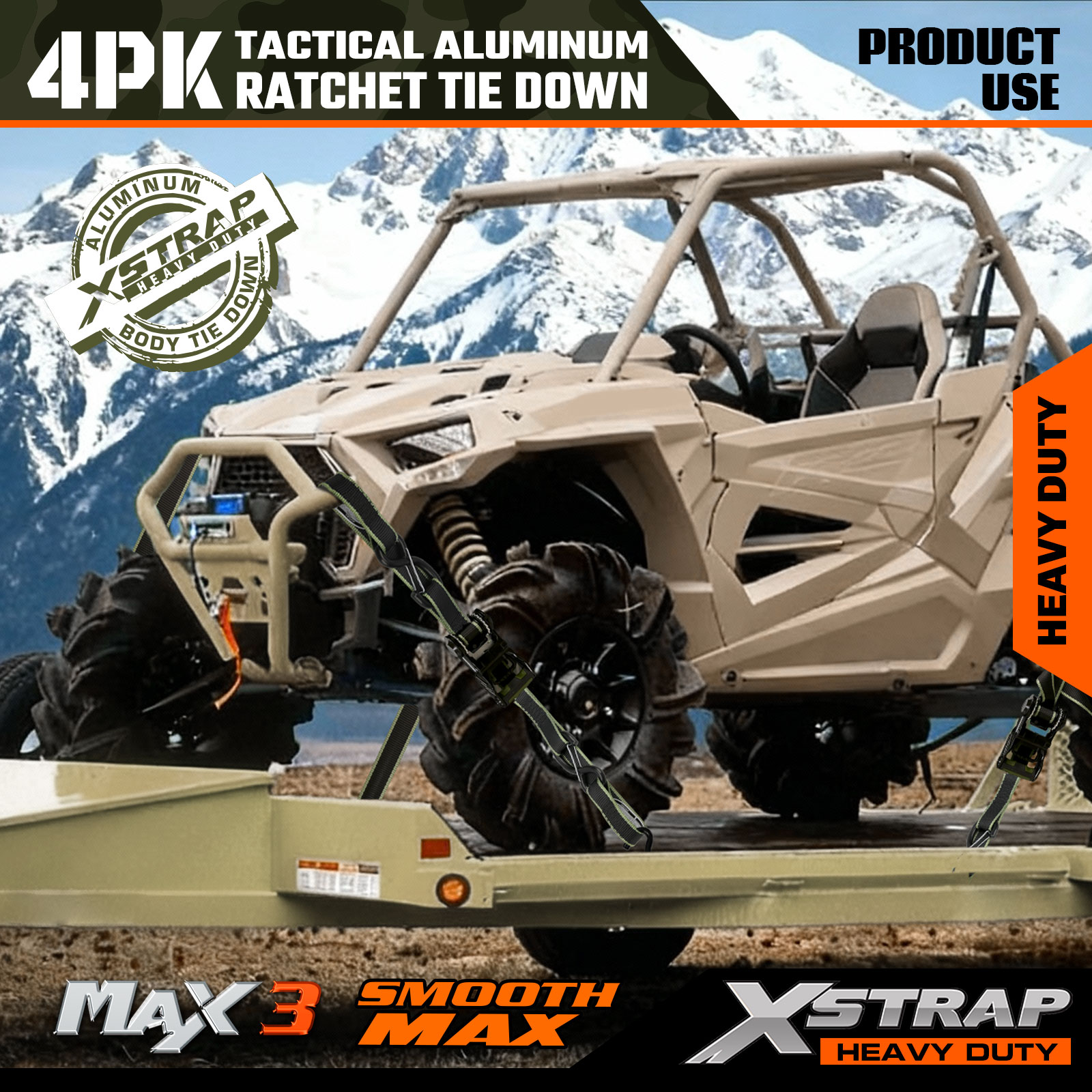 Xstrap Tactical Ratchet Tie Downs มีความแข็งแกร่งและใช้งานได้ง่ายกว่าการผูกวงล้อแบบมาตรฐาน การออกแบบห่วงแบบอ่อนสามารถช่วยรักษาความปลอดภัยของสินค้าได้โดยไม่ทำลายสีหรือโครเมียม ด้ามจับลายเพชรช่วยเพิ่มการยึดเกาะและกันชนยางตลอดวงล้อช่วยปกป้องสินค้าของคุณจากรอยขีดข่วน สายรัดมีการเข้าเกียร์อย่างแม่นยำด้วยฟัน 16 ซี่ตามแนวเฟืองของเฟืองวงล้อ
