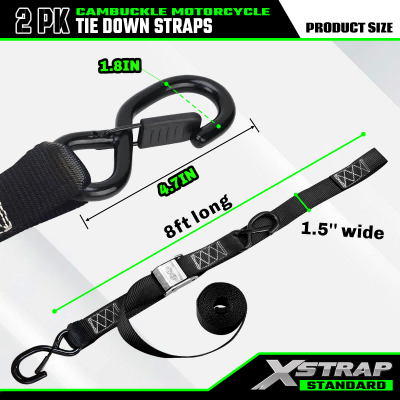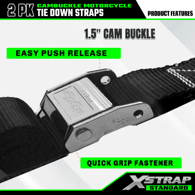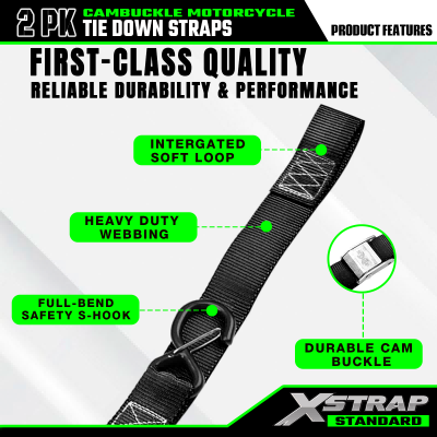 - การออกแบบมาตรฐานสำหรับงานหนัก: สายรัดผูกรถจักรยานยนต์ Xstrap สร้างขึ้นด้วยสายรัดที่มีความแข็งแรงสูงและมีความแข็งแรงในการแตกหักถึง 2,200 ปอนด์ ทำให้เป็นตัวเลือกที่ดีที่สุดสำหรับการยึดรถจักรยานยนต์, ATV, UTV และจักรยานวิบาก เมื่อคุณใช้สายรัดหัวเข็มขัดของเราสำหรับการเดินทางอย่างรวดเร็ว สายรัด Xstrap จะรับประกันความทนทานและความปลอดภัยที่ไม่มีใครเทียบได้