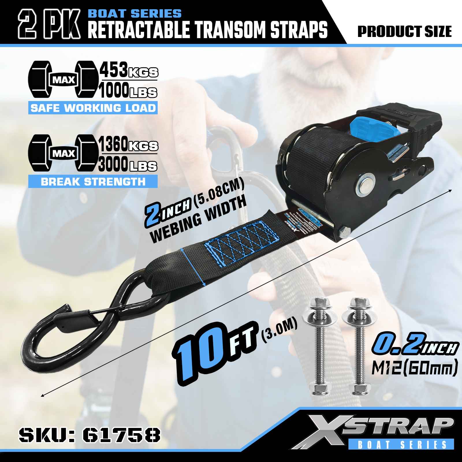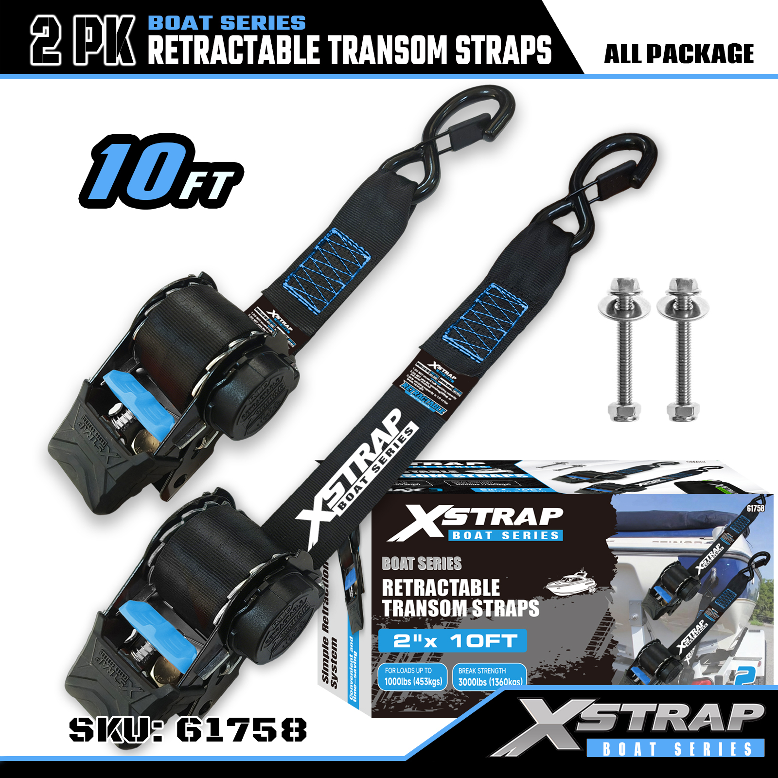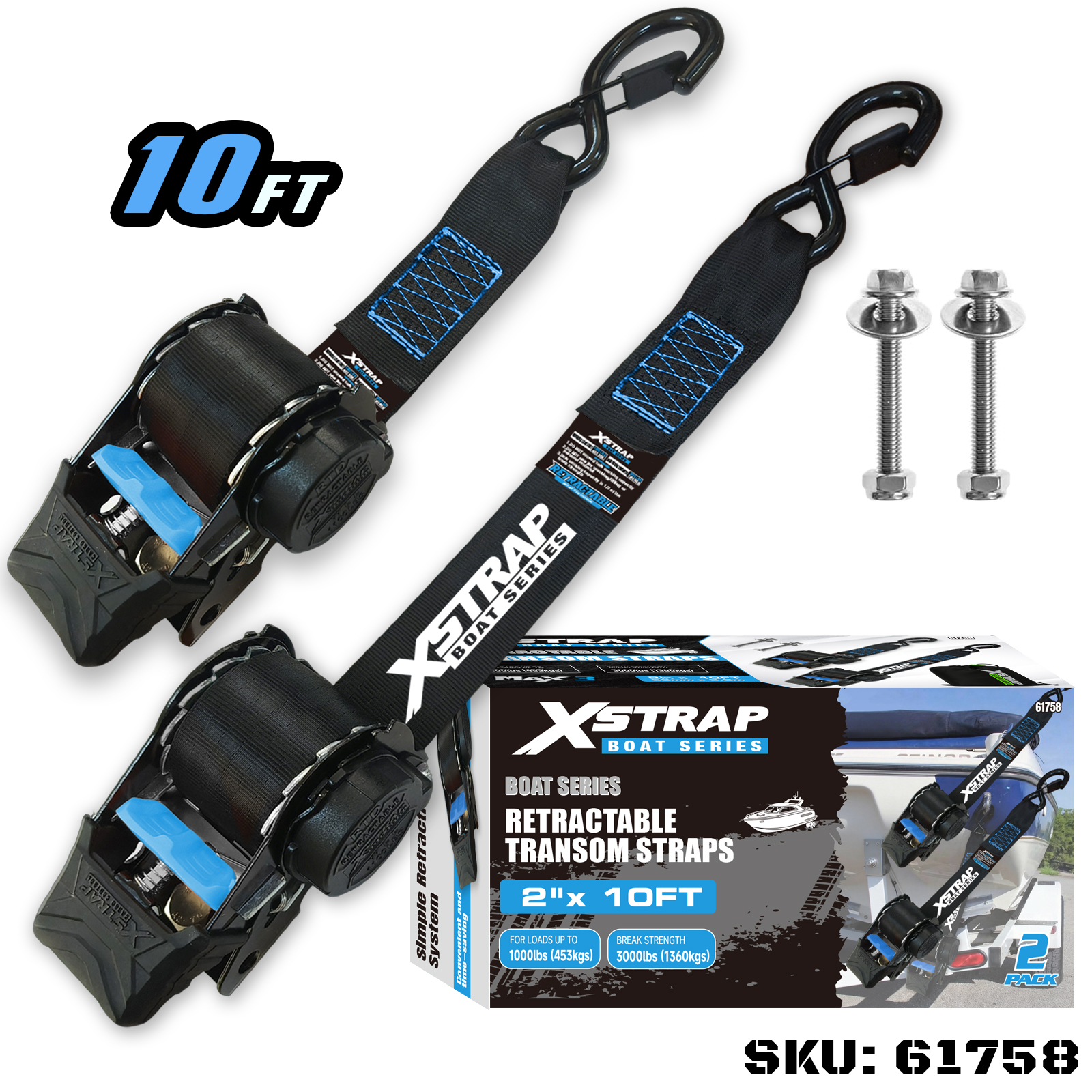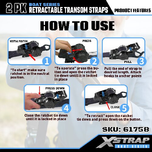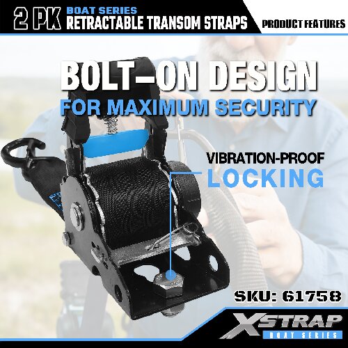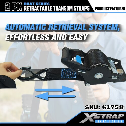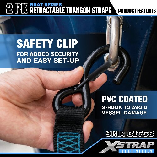 นี่คือ Xstrap Retractable Transom Tie Down Straps พร้อมตะขอนิรภัย S ภาระงานที่ปลอดภัยคือ 1,000 ปอนด์ และแรงแตกหักคือ 3,000 ปอนด์