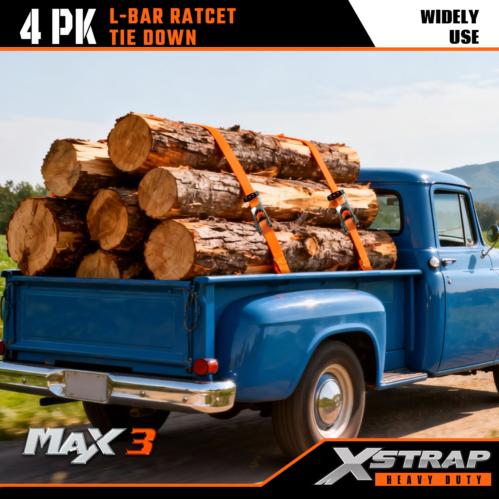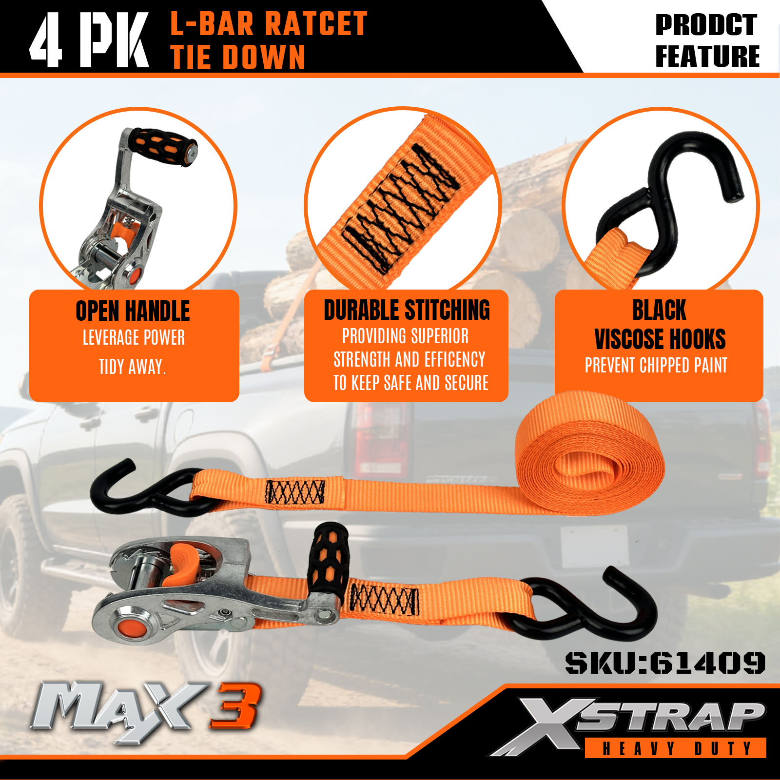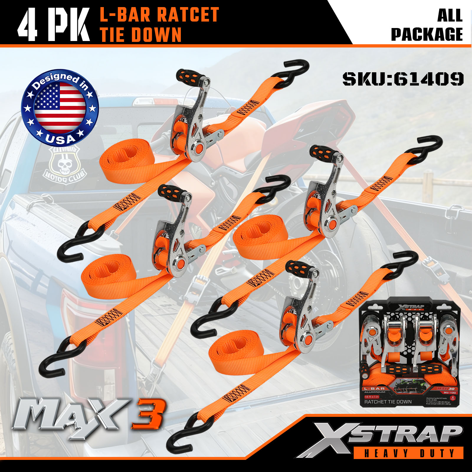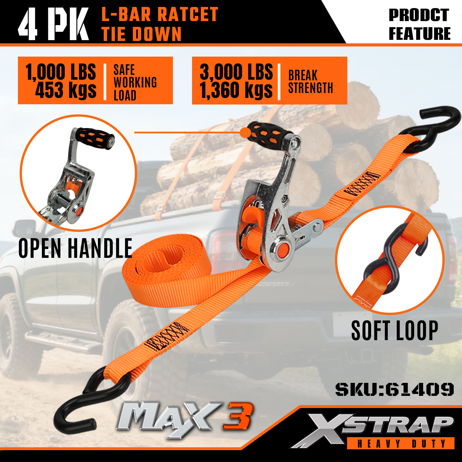 Xstrap 4 Pack L Bar Tie Down สายรัด, สายรัดโพลีเอสเตอร์ 1” x 14’ ดึงสายรัดวงล้อ, สายรัดยึดสายรัดสินค้าความจุ 1,000 ปอนด์พร้อมตะขอ S สำหรับรถบรรทุก, SUV, ชั้นวางของบนรถรถจักรยานยนต์