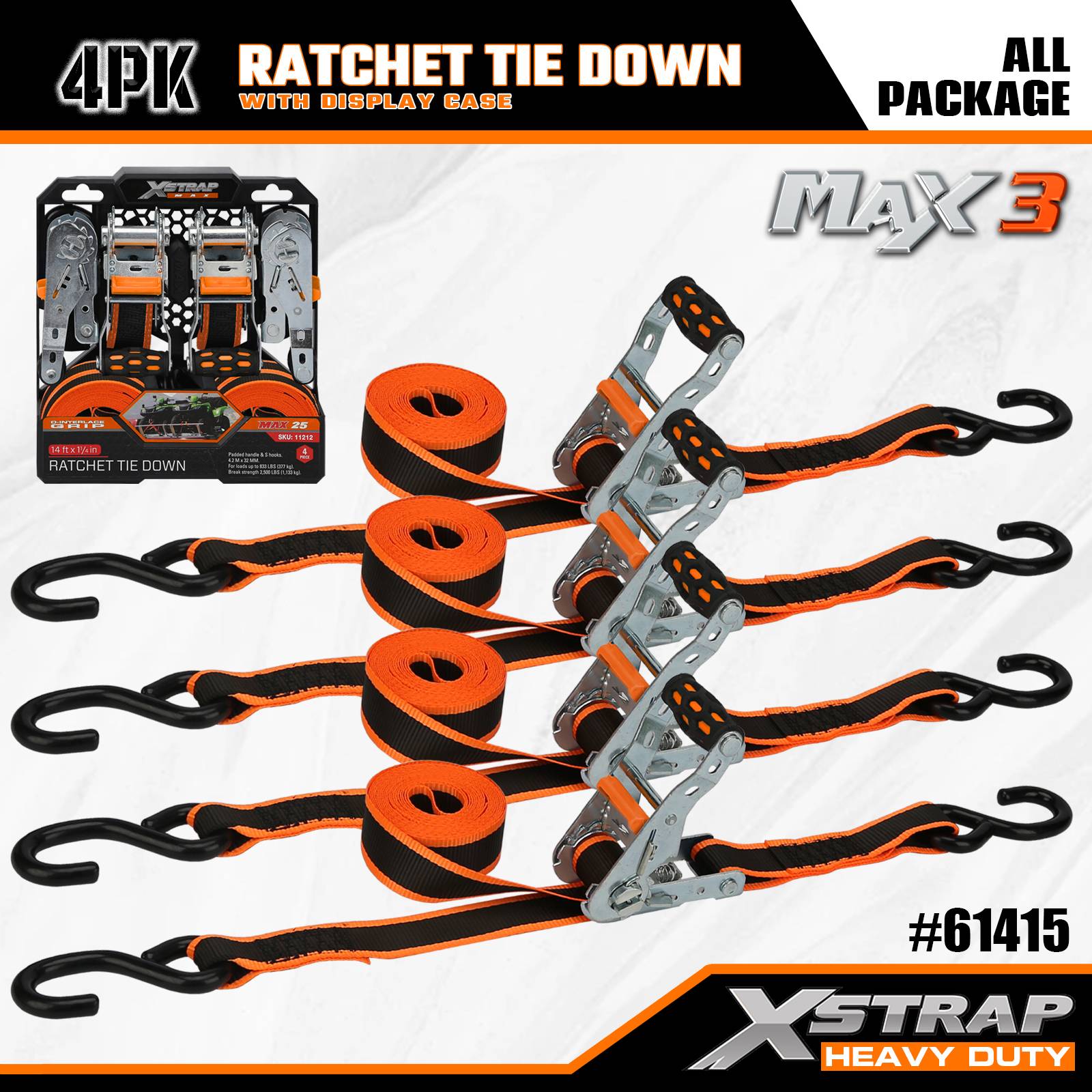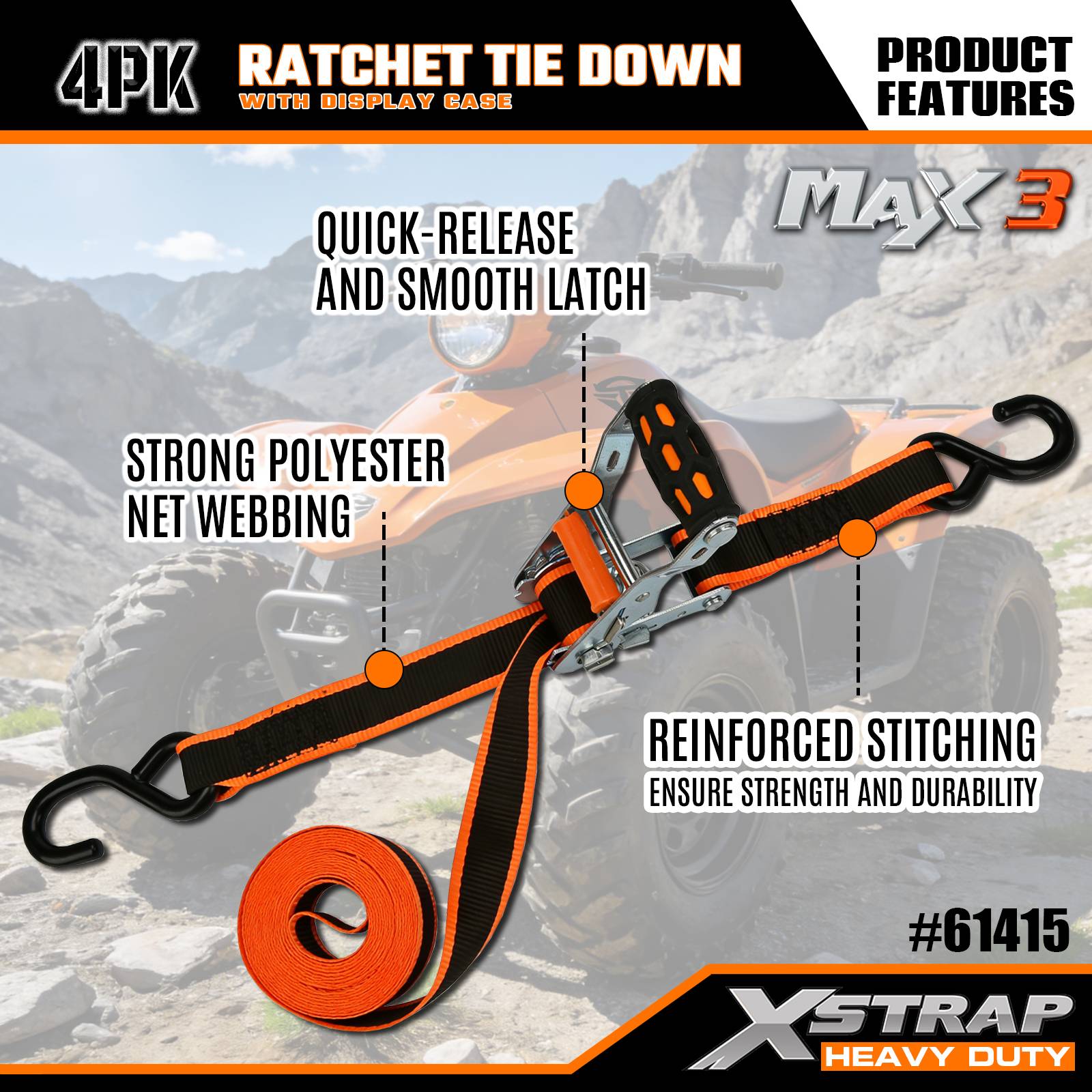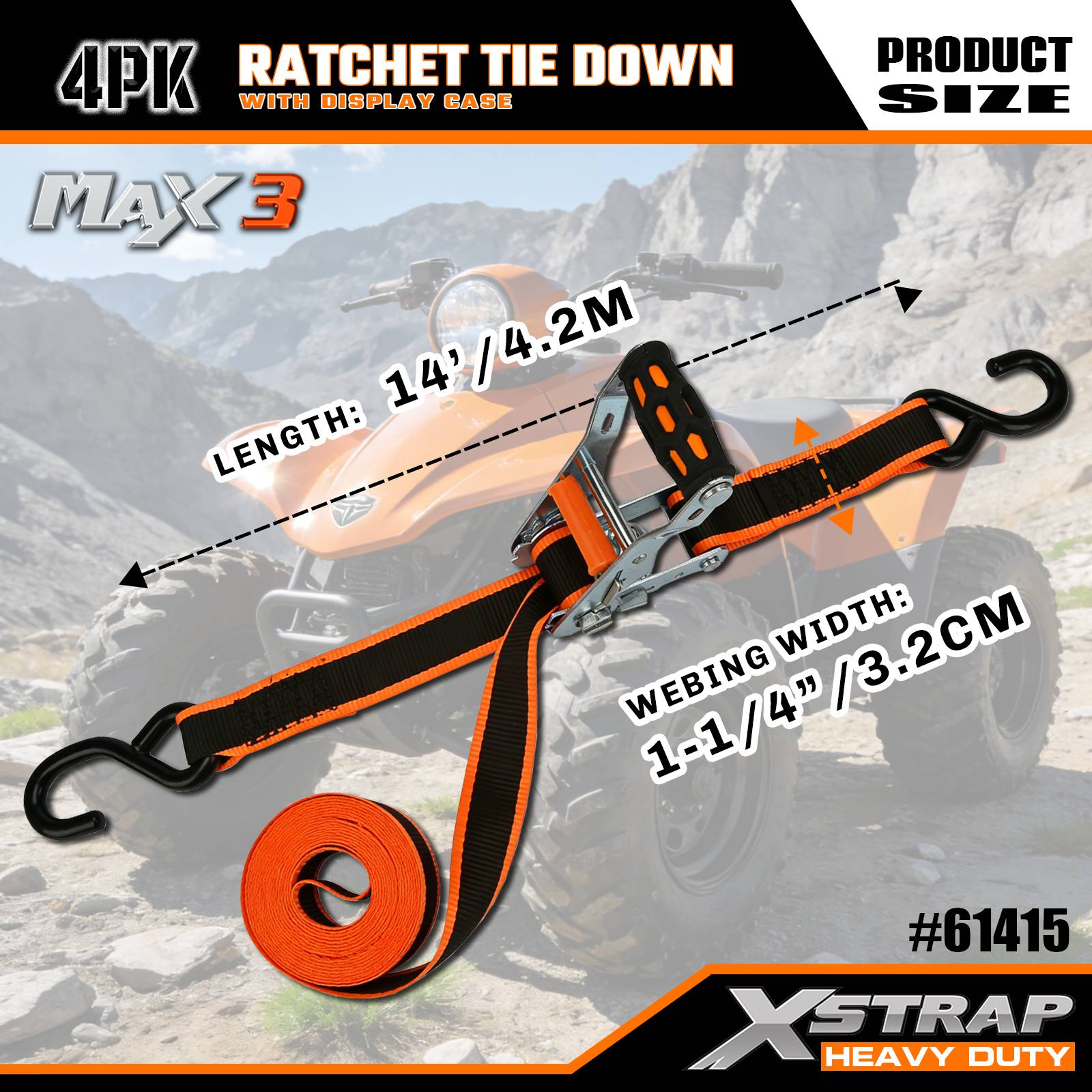 Xstrap 4 Pack Ratchet Tie Down, 1-1/4” x 14’ สายรัดโพลีเอสเตอร์แบบดึงสายรัดวงล้อ, สายรัดยึดสายรัดบรรทุกสินค้าความจุ 1,000 ปอนด์พร้อมตะขอ S สำหรับรถบรรทุก, SUV, ชั้นวางของบนรถรถจักรยานยนต์