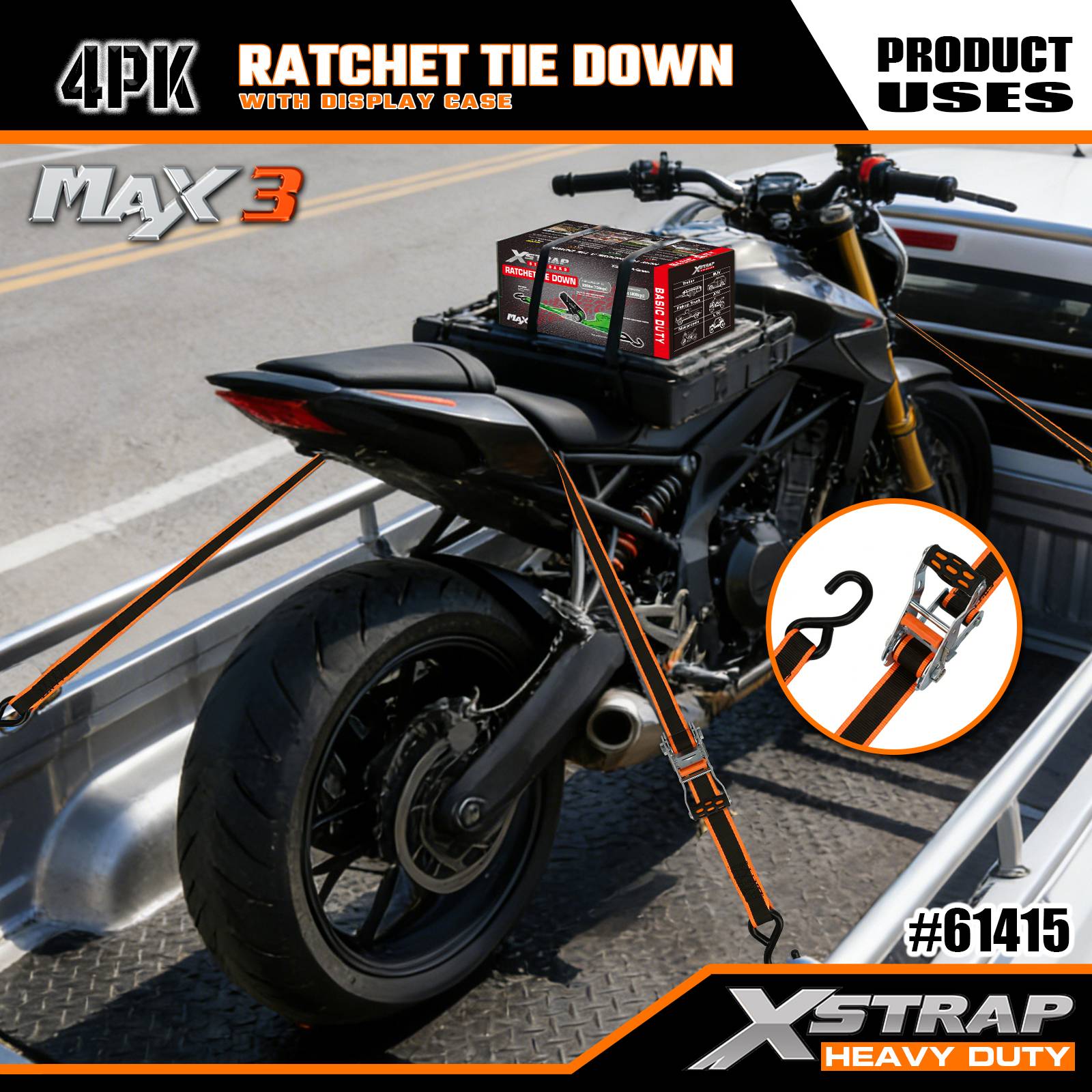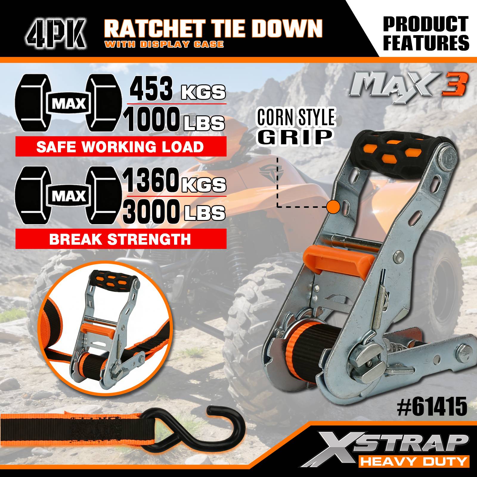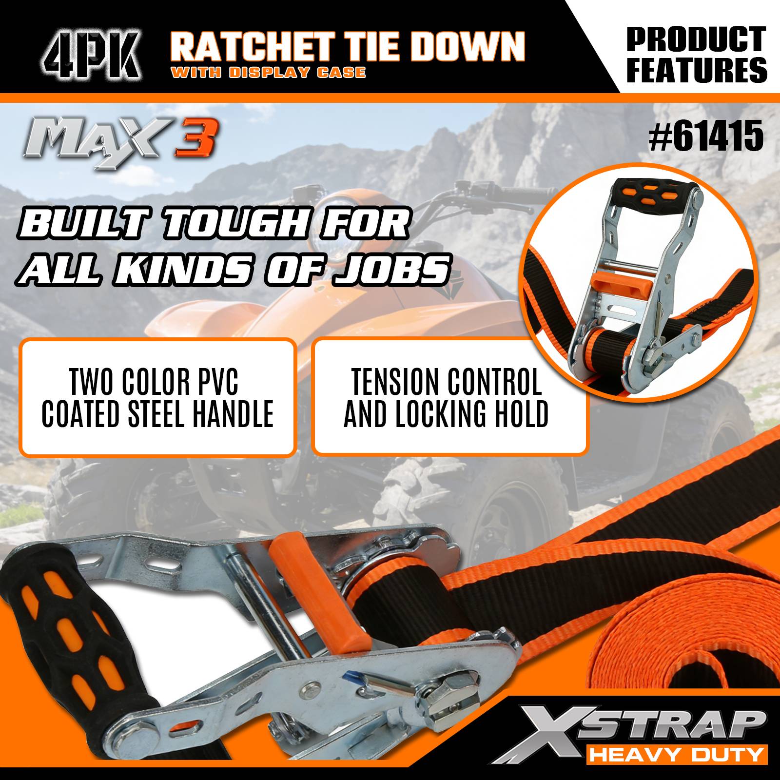 Xstrap 4 Pack Ratchet Tie Down, 1-1/4” x 14’ สายรัดโพลีเอสเตอร์แบบดึงสายรัดวงล้อ, สายรัดยึดสายรัดบรรทุกสินค้าความจุ 1,000 ปอนด์พร้อมตะขอ S สำหรับรถบรรทุก, SUV, ชั้นวางของบนรถรถจักรยานยนต์