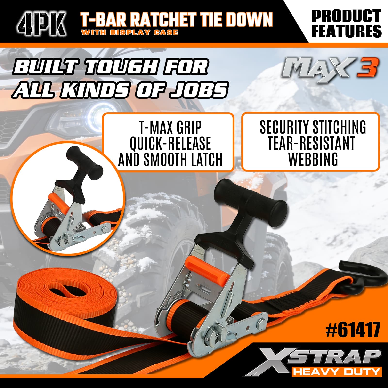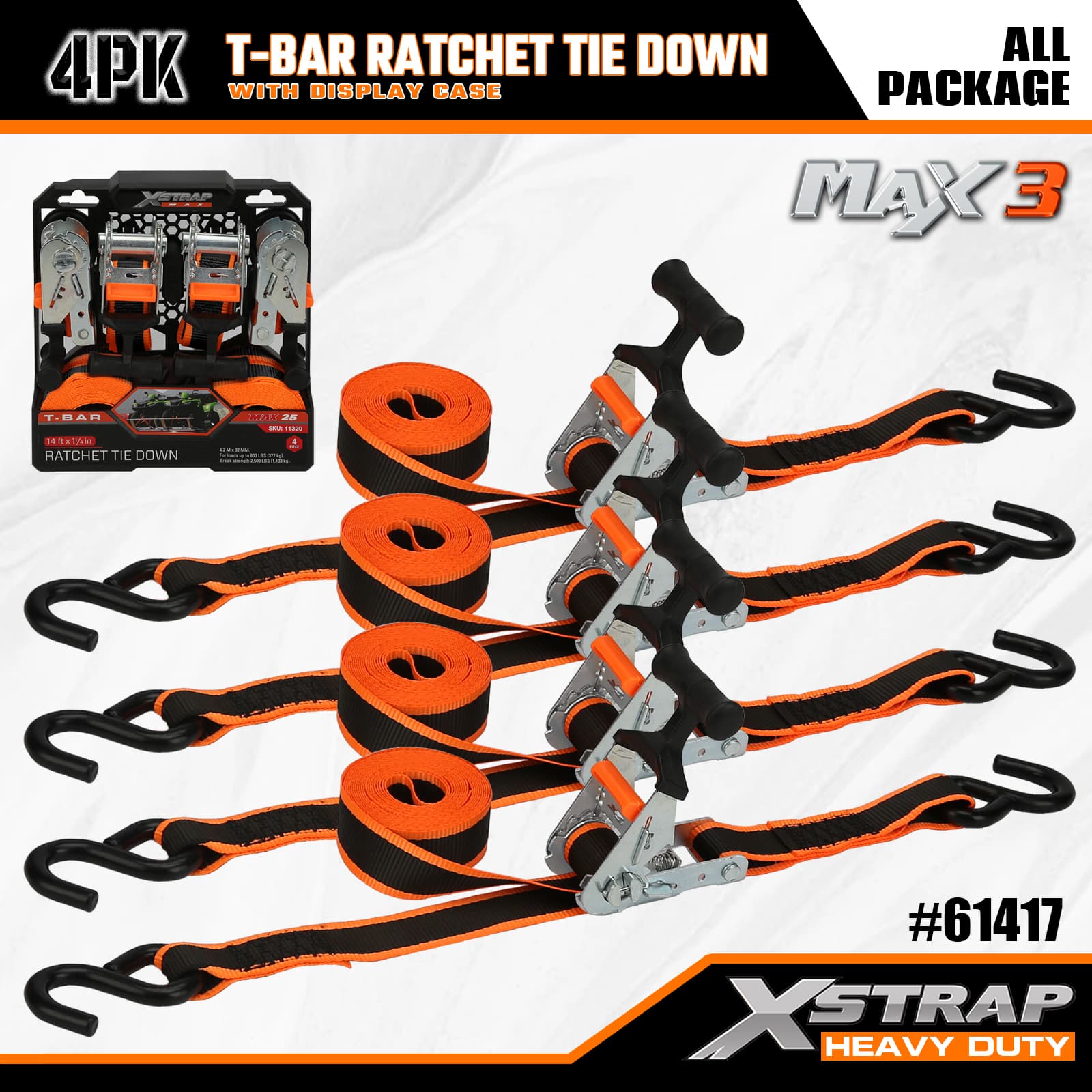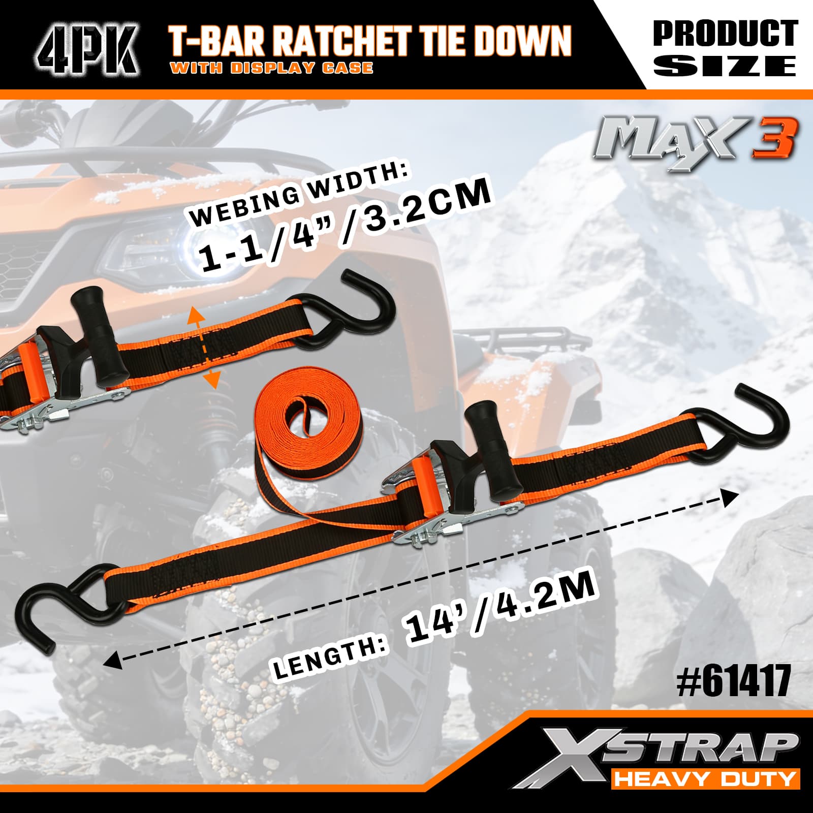 Xstrap 4 Pack T-Max Grip Ratchet Tie Down, 1-1/4 ” x 14’ สายรัดโพลีเอสเตอร์แบบดึงสายรัดวงล้อ, สายรัดยึดสายรัดยึดสินค้าความจุ 1,000 ปอนด์พร้อมตะขอ S สำหรับรถกระบะ, SUV, ชั้นวางของบนรถ รถจักรยานยนต์, เรือตกปลาขนาดเล็ก, เจ็ตสกี, รถเคลื่อนบนหิมะ, รถแทรกเตอร์สนามหญ้า