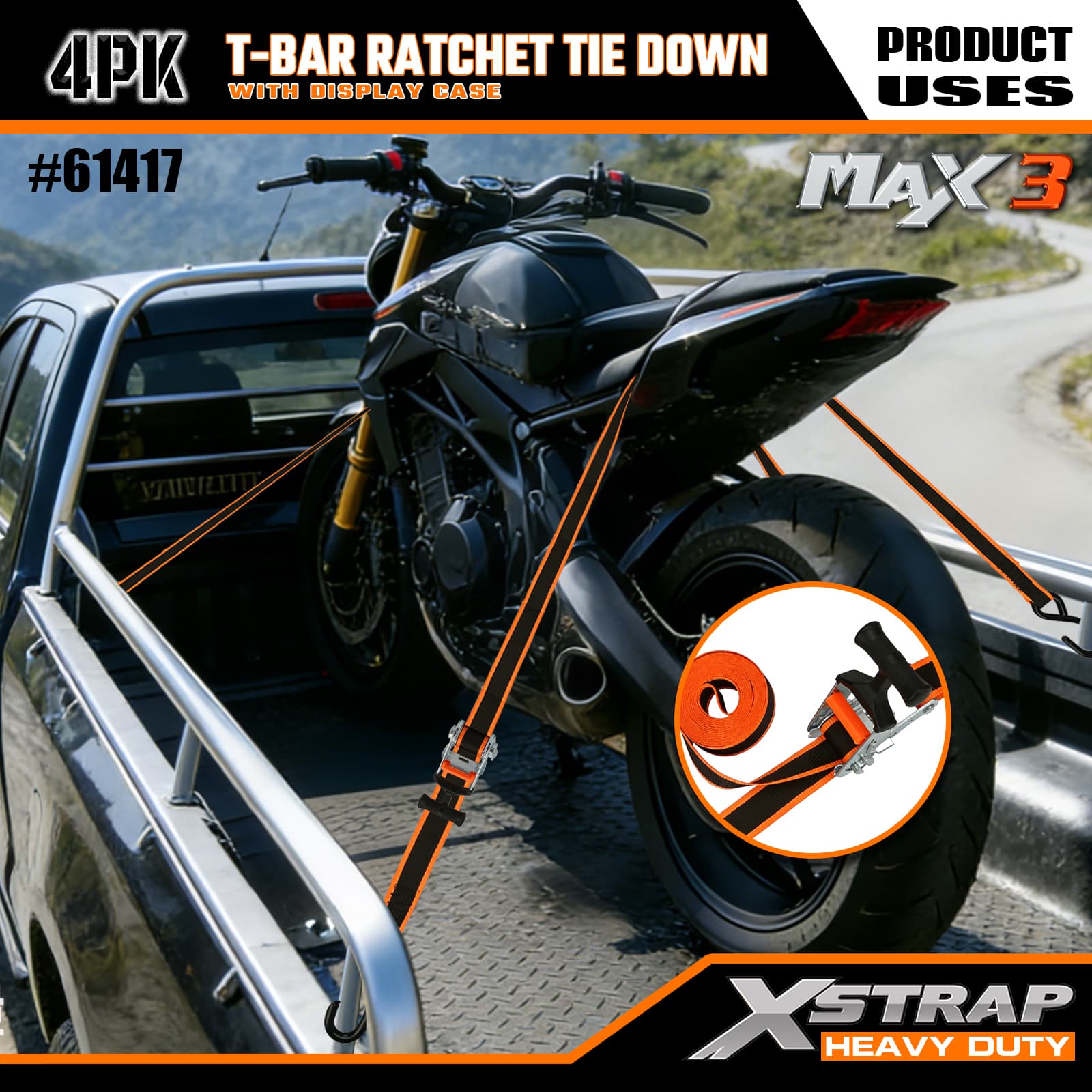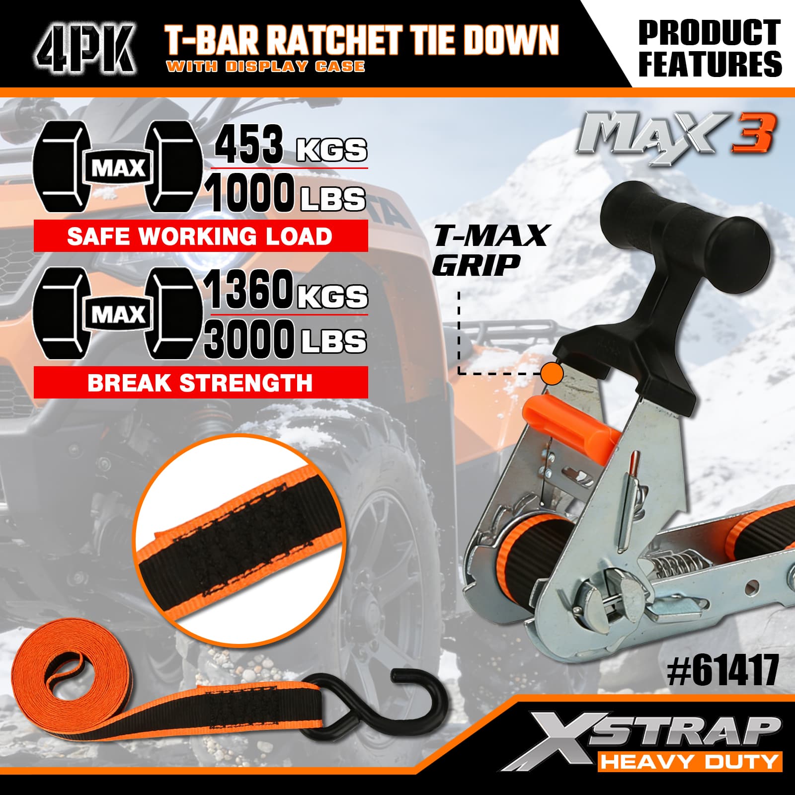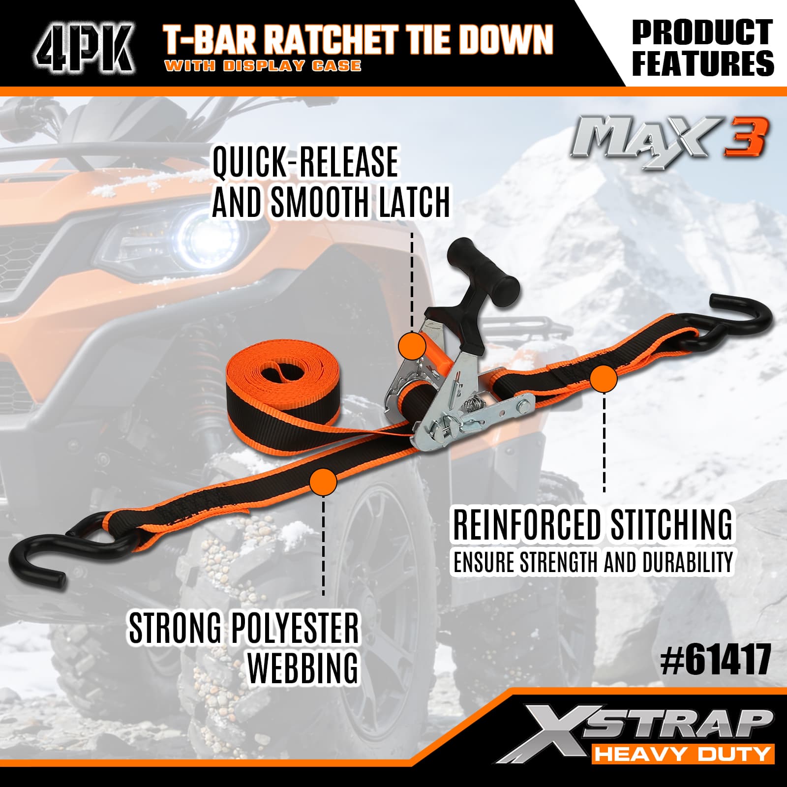 Xstrap 4 Pack T-Max Grip Ratchet Tie Down, 1-1/4 ” x 14’ สายรัดโพลีเอสเตอร์แบบดึงสายรัดวงล้อ, สายรัดยึดสายรัดยึดสินค้าความจุ 1,000 ปอนด์พร้อมตะขอ S สำหรับรถกระบะ, SUV, ชั้นวางของบนรถ รถจักรยานยนต์, เรือตกปลาขนาดเล็ก, เจ็ตสกี, รถเคลื่อนบนหิมะ, รถแทรกเตอร์สนามหญ้า