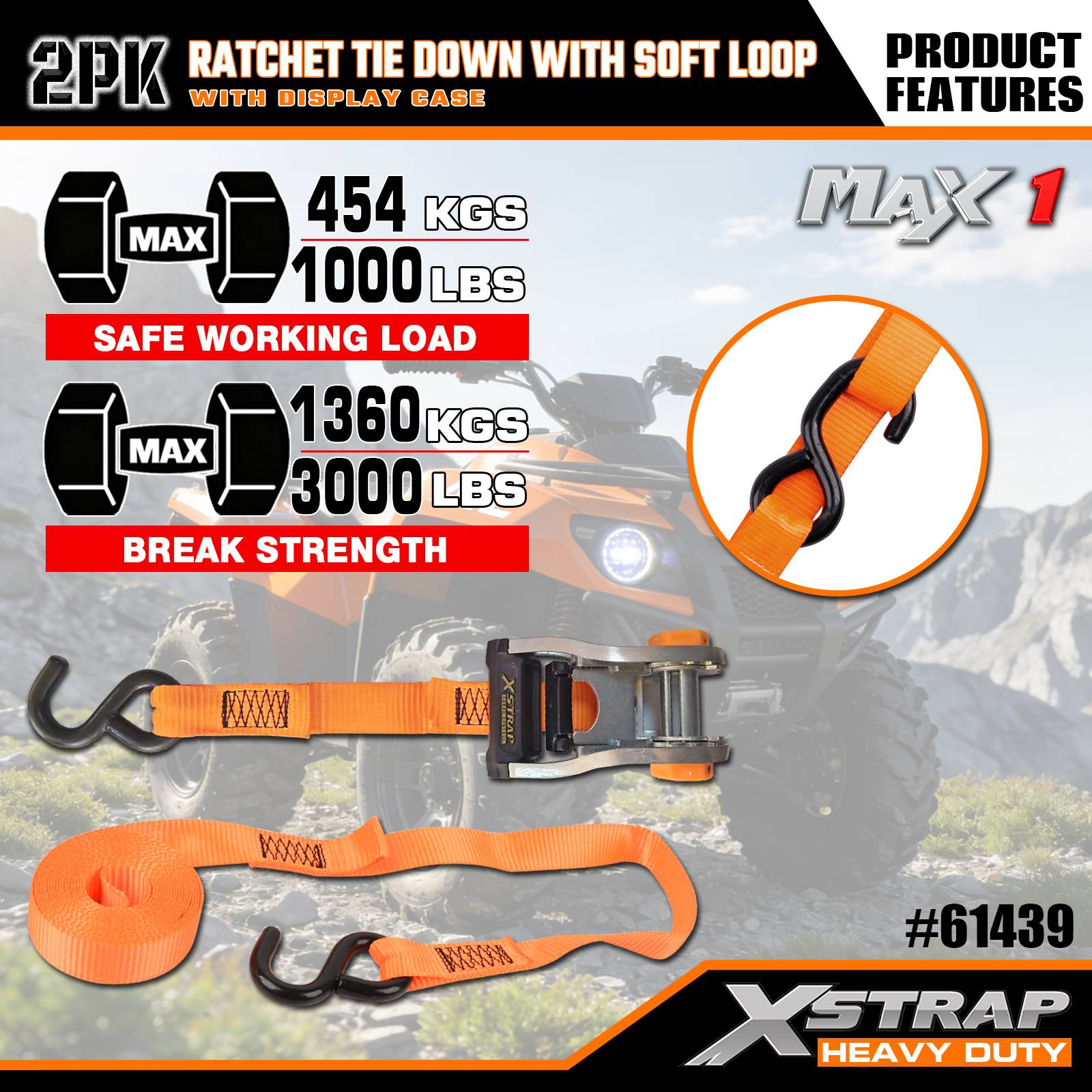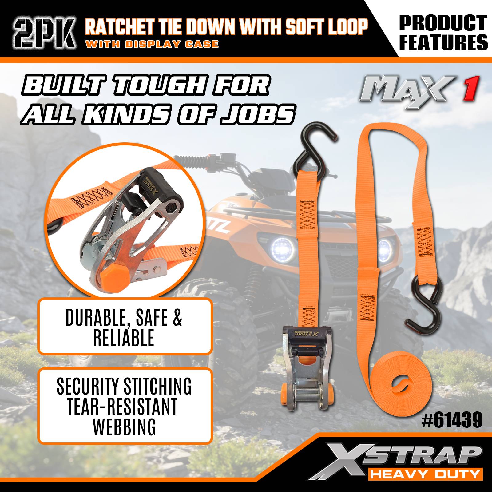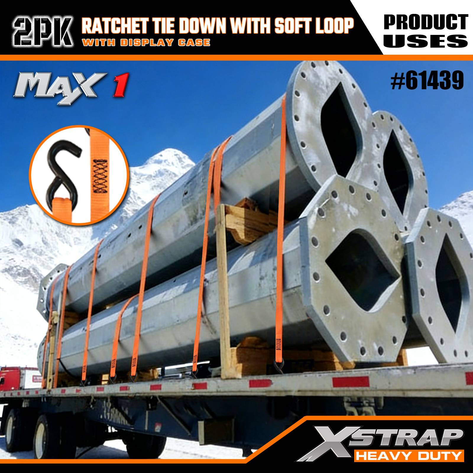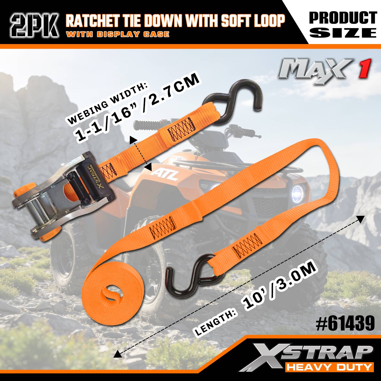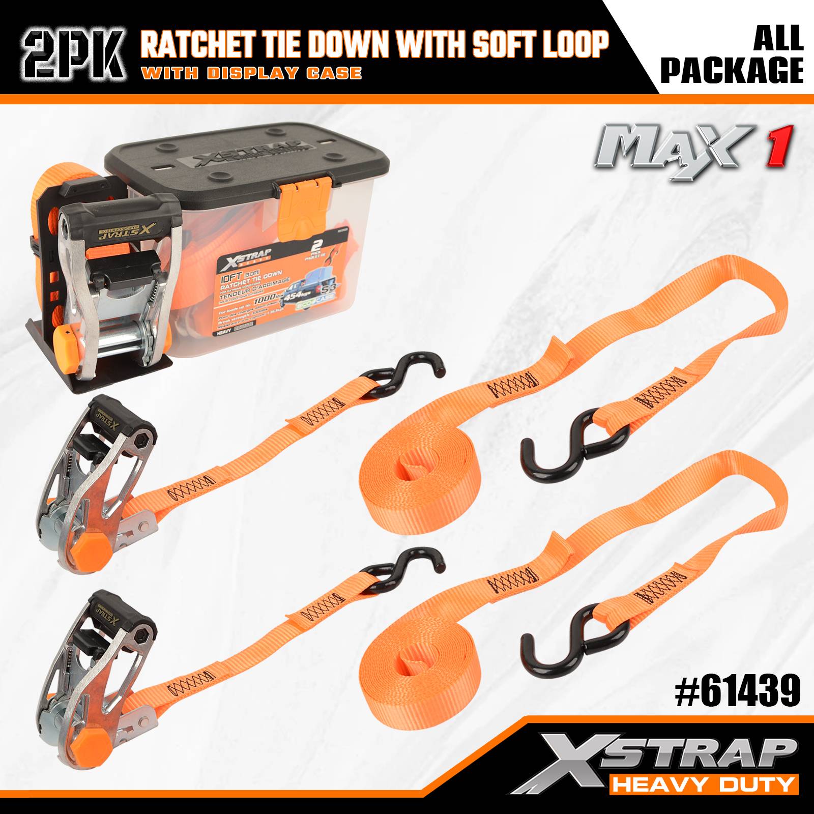 Xstrap 2 Pack Ratchet Tie Down พร้อม Soft Loop, 1-1/16” x 10’ สายรัดโพลีเอสเตอร์แบบดึงสายรัดวงล้อ, สายรัดยึดสายรัดสินค้าความจุ 1,000 ปอนด์พร้อมตะขอ S สำหรับรถบรรทุก, SUV, ชั้นวางของบนรถมอเตอร์ไซค์