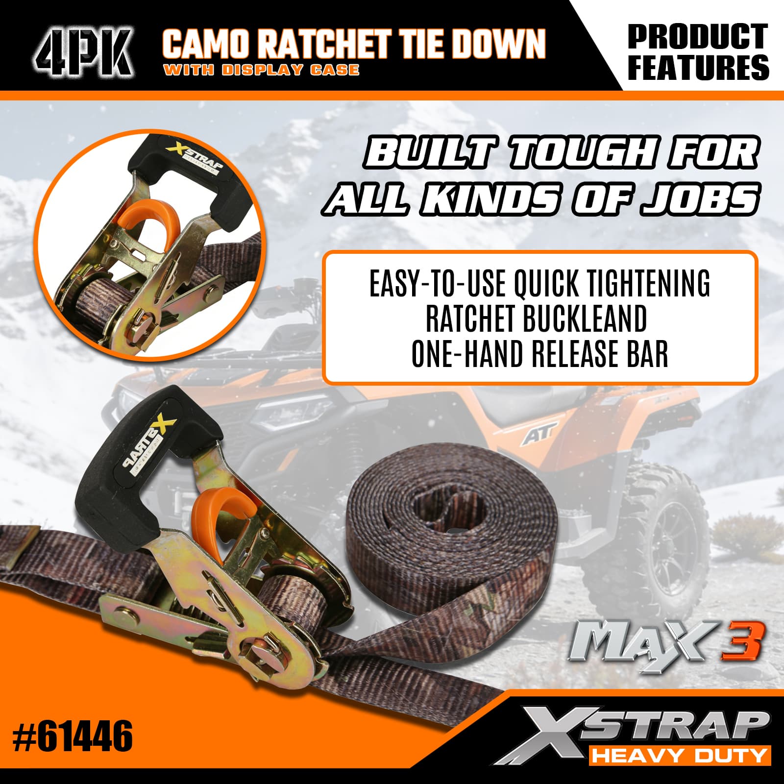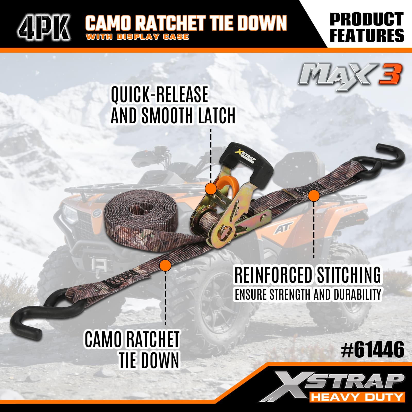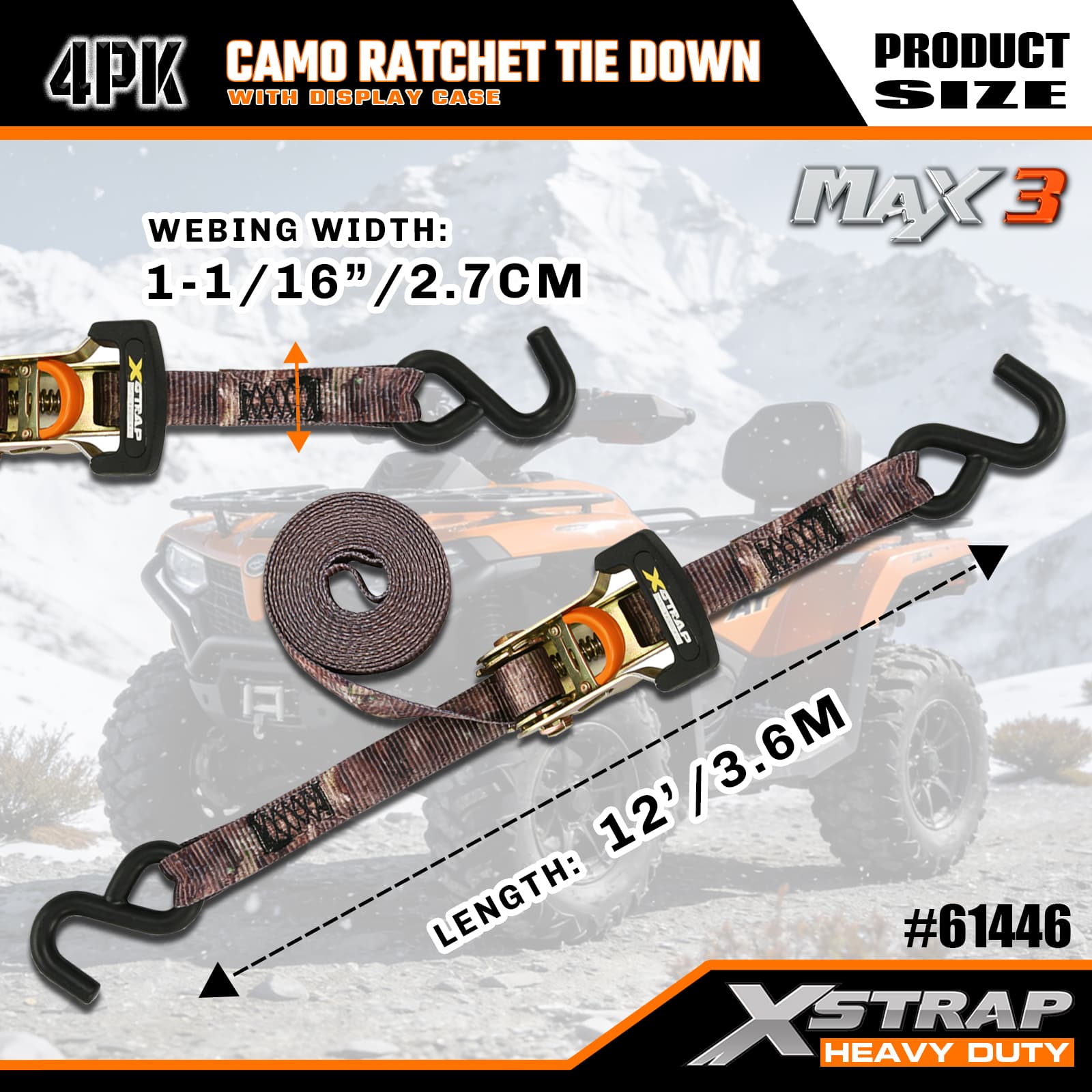 Xstrap 4 Pack Camo Ratchet Tie Down, 1-1/16 ” x 12’ สายรัดโพลีเอสเตอร์แบบดึงสายรัดวงล้อ, สายรัดยึดสายรัดบรรทุกสินค้าความจุ 1,000 ปอนด์พร้อมตะขอ S สำหรับรถกระบะ, SUV, ชั้นวางของบนรถยนต์ รถจักรยานยนต์, เรือตกปลาขนาดเล็ก, เจ็ตสกี, รถเคลื่อนบนหิมะ, รถแทรกเตอร์สนามหญ้า