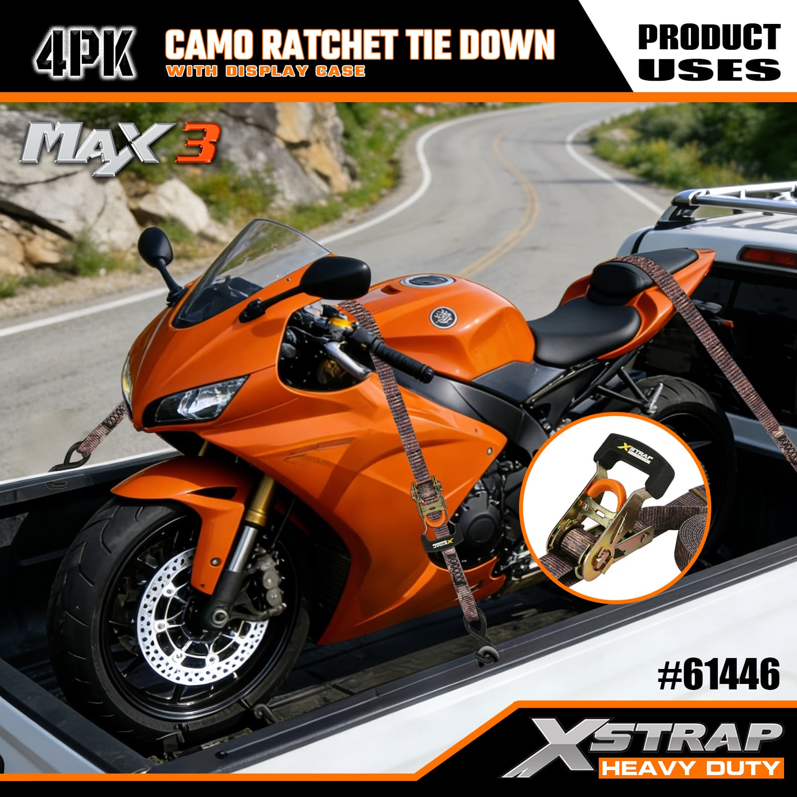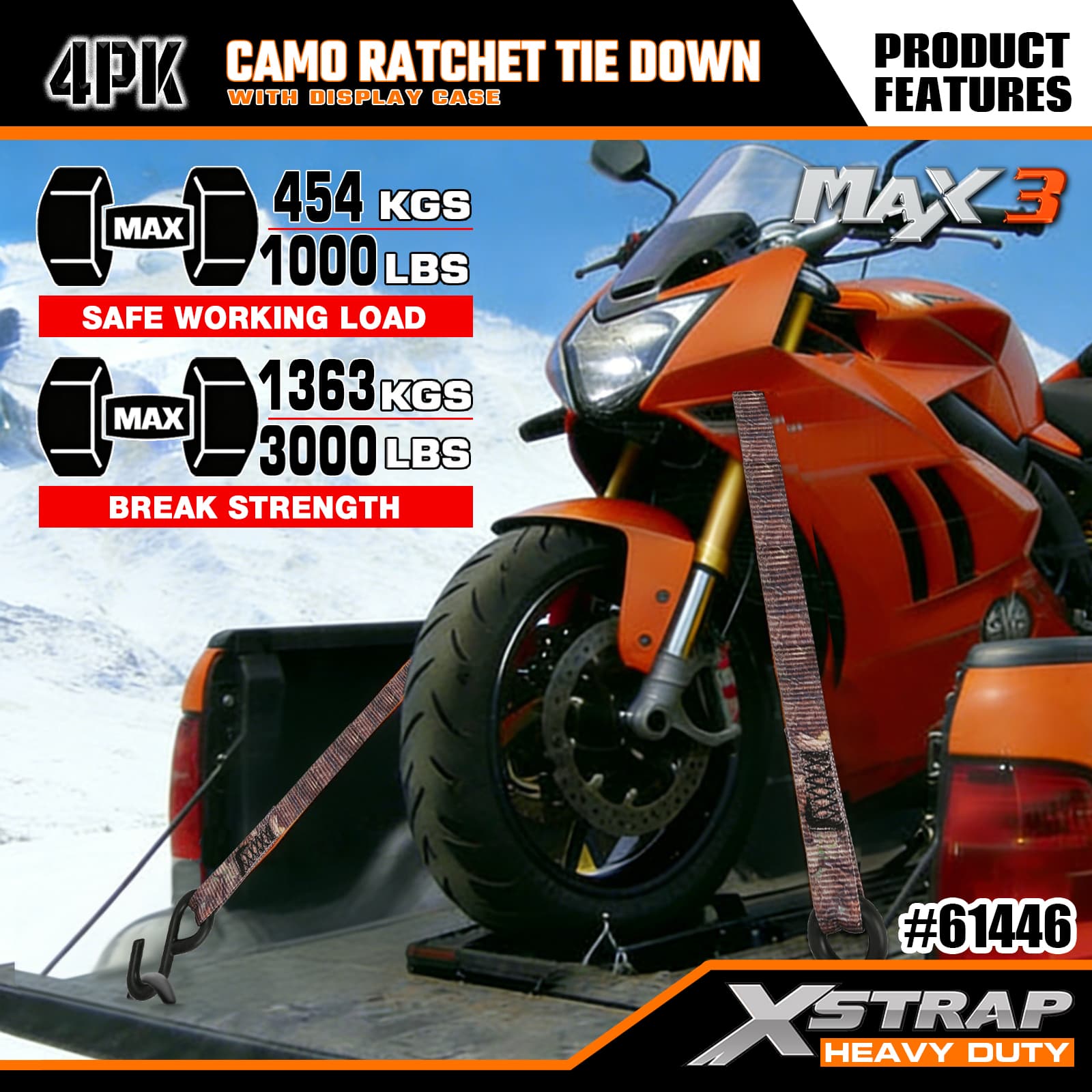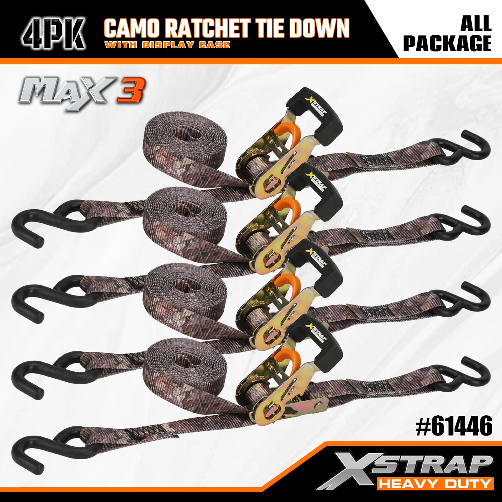 Xstrap 4 Pack Camo Ratchet Tie Down, 1-1/16 ” x 12’ สายรัดโพลีเอสเตอร์แบบดึงสายรัดวงล้อ, สายรัดยึดสายรัดบรรทุกสินค้าความจุ 1,000 ปอนด์พร้อมตะขอ S สำหรับรถกระบะ, SUV, ชั้นวางของบนรถยนต์ รถจักรยานยนต์, เรือตกปลาขนาดเล็ก, เจ็ตสกี, รถเคลื่อนบนหิมะ, รถแทรกเตอร์สนามหญ้า