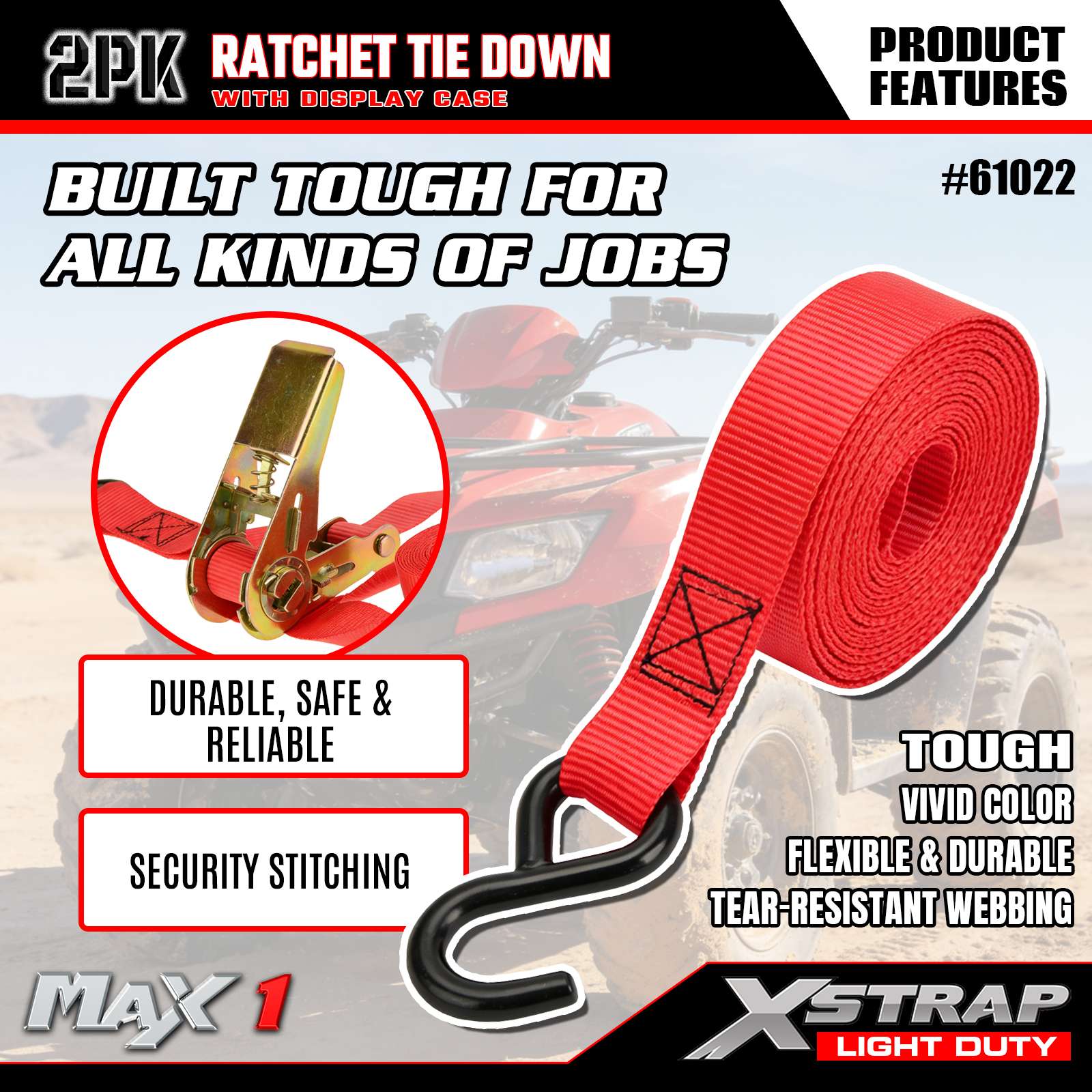 สายรัด Ratchet Tie Down เป็นเครื่องมือรักษาความปลอดภัยสำหรับงานเบาที่ออกแบบมาสำหรับการใช้งานด้านการขนส่งและการจัดเก็บที่หลากหลาย ได้รับการออกแบบมาเพื่อรัดสินค้าได้อย่างปลอดภัยและเชื่อถือได้ เช่น รถจักรยานยนต์ รถเอทีวี เรือเล็ก เฟอร์นิเจอร์ วัสดุก่อสร้าง และสิ่งของขนาดใหญ่อื่นๆ บนรถกระบะ รถพ่วง รถพื้นเรียบ และแร็คหลังคา ชุดแพ็ค 2 ชิ้นนี้สร้างขึ้นโดยมีความทนทานเป็นหลักการหลัก เหมาะสำหรับการใช้งานส่วนบุคคลและเชิงพาณิชย์ โดยนำเสนอโซลูชันที่เชื่อถือได้สำหรับการลาก การเคลื่อนย้าย การจัดสวน และการขนส่งเพื่อสันทนาการในชีวิตประจำวัน บรรจุภัณฑ์แสดงผลที่ให้มาช่วยให้มั่นใจได้ว่าผลิตภัณฑ์จะพร้อมสำหรับการขายปลีกและนำเสนอด้วยสายตาเพื่อเน้นคุณลักษณะที่สำคัญ